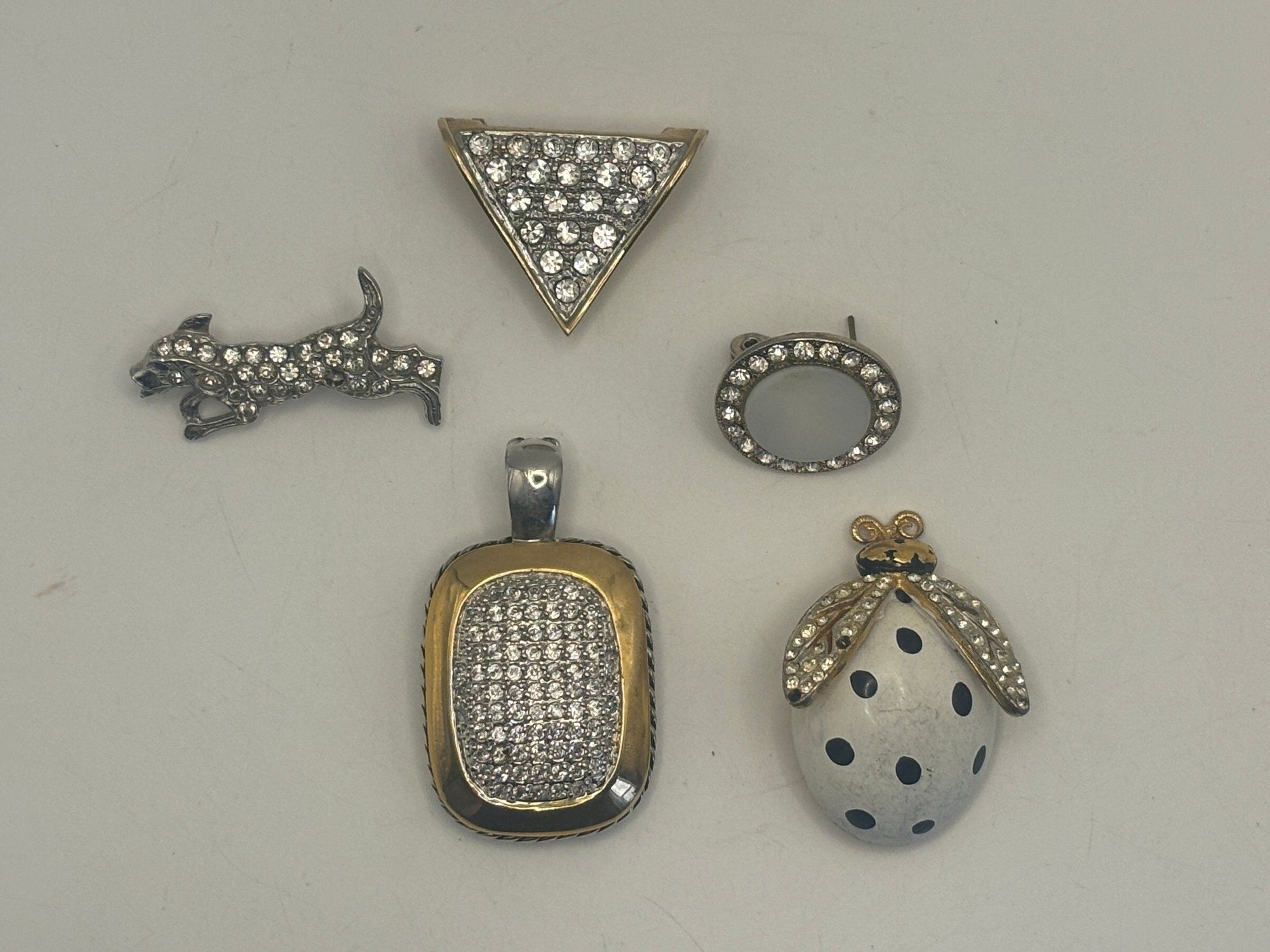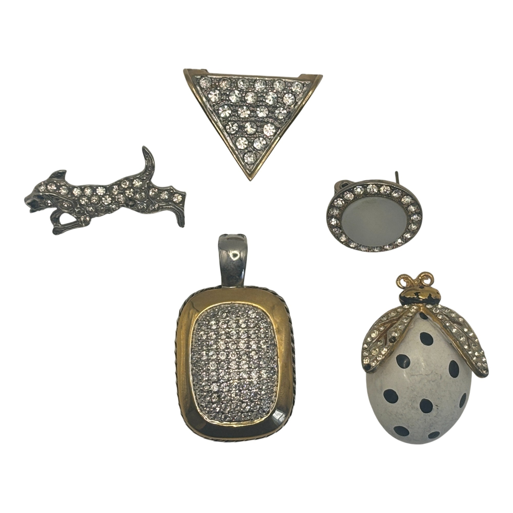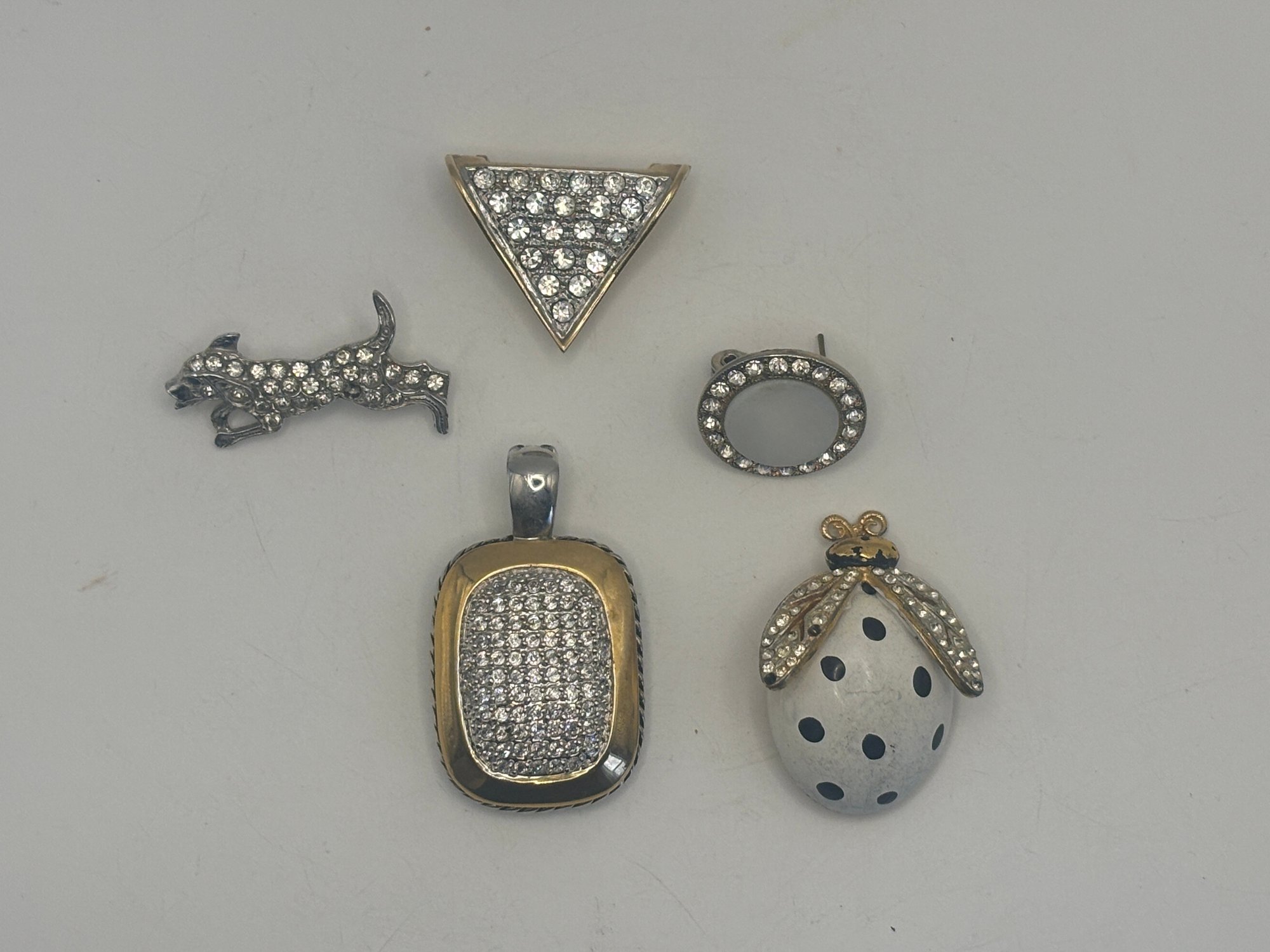 A fun and versatile grouping of rhinestone-accented jewelry featuring a mix of geometric forms, figural motifs, and classic sparkle. This lot includes a triangular rhinestone pin, an oval rhinestone frame pin, a playful rhinestone dog figure, a rectangular pave-style pendant, and a charming ladybug brooch with dotted enamel body and crystal-set wings.