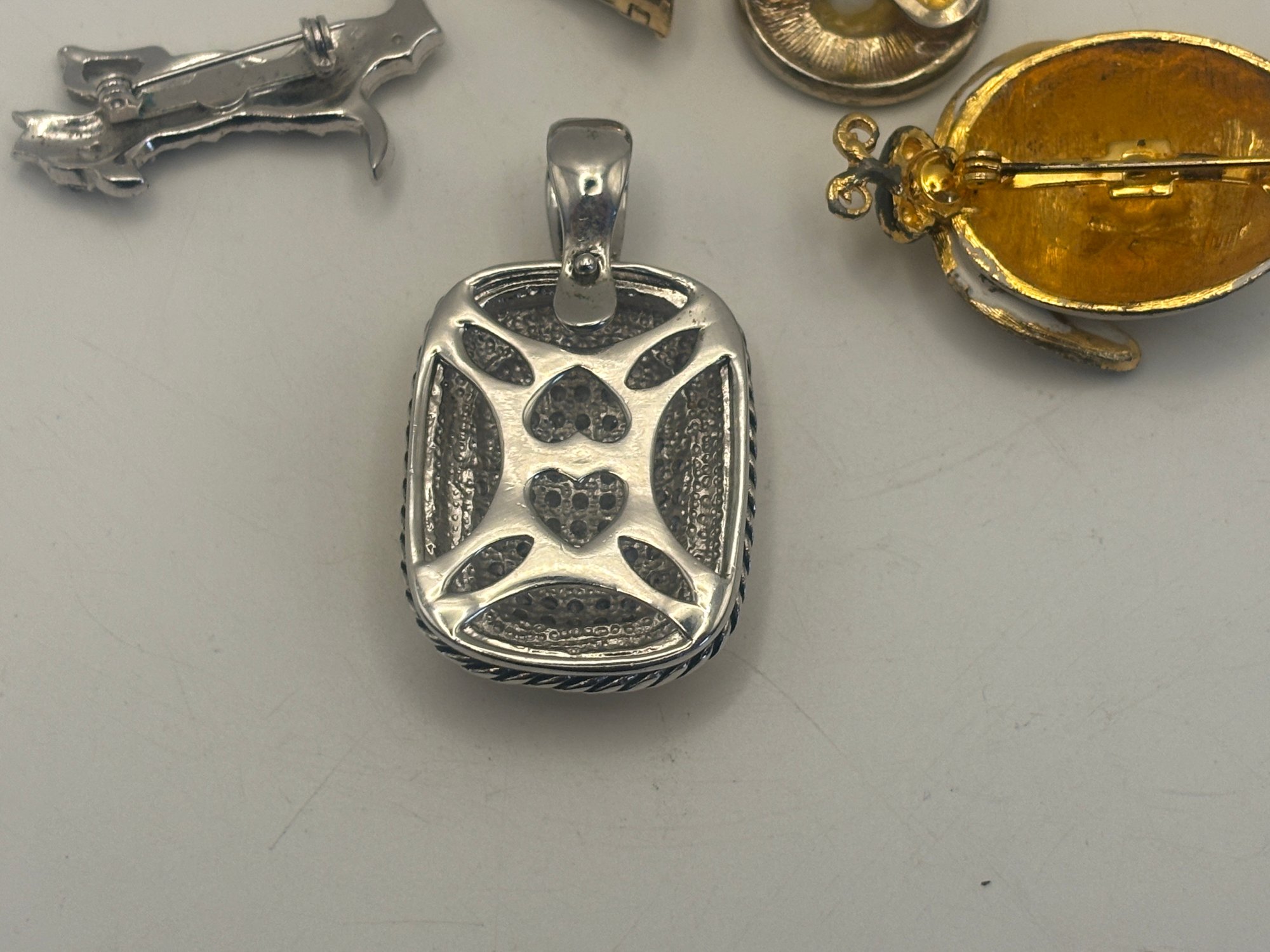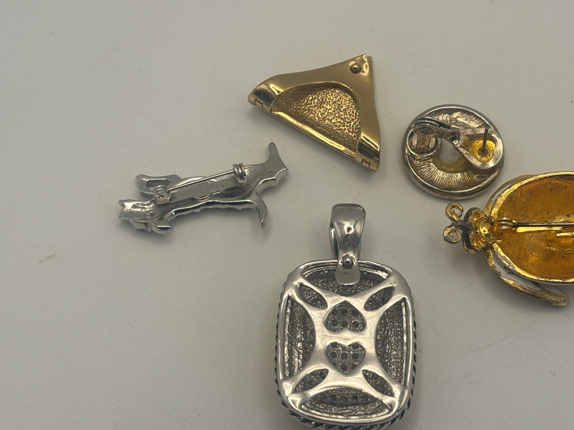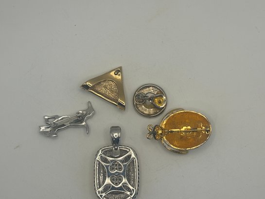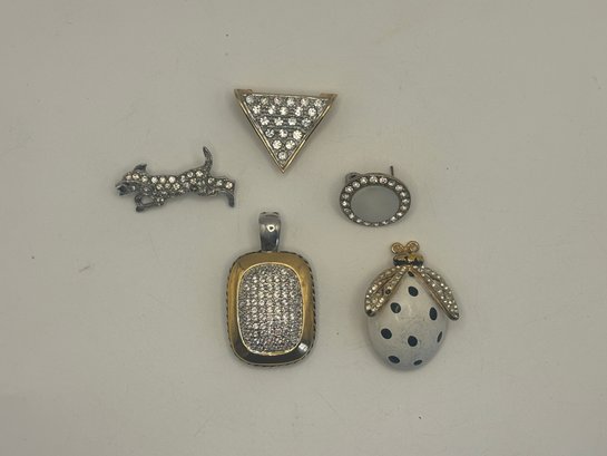 A fun and versatile grouping of rhinestone-accented jewelry featuring a mix of geometric forms, figural motifs, and classic sparkle. This lot includes a triangular rhinestone pin, an oval rhinestone frame pin, a playful rhinestone dog figure, a rectangular pave-style pendant, and a charming ladybug brooch with dotted enamel body and crystal-set wings.