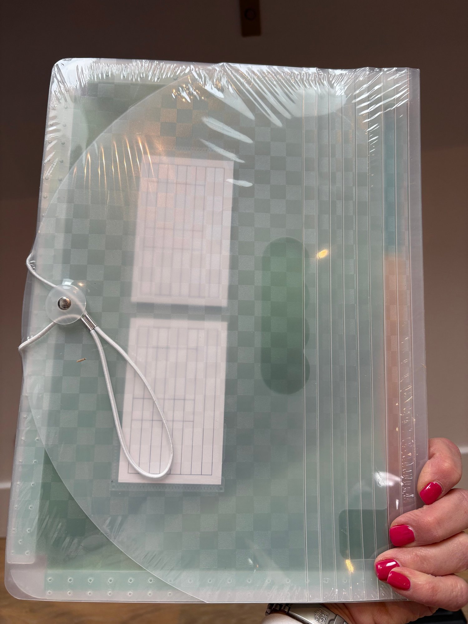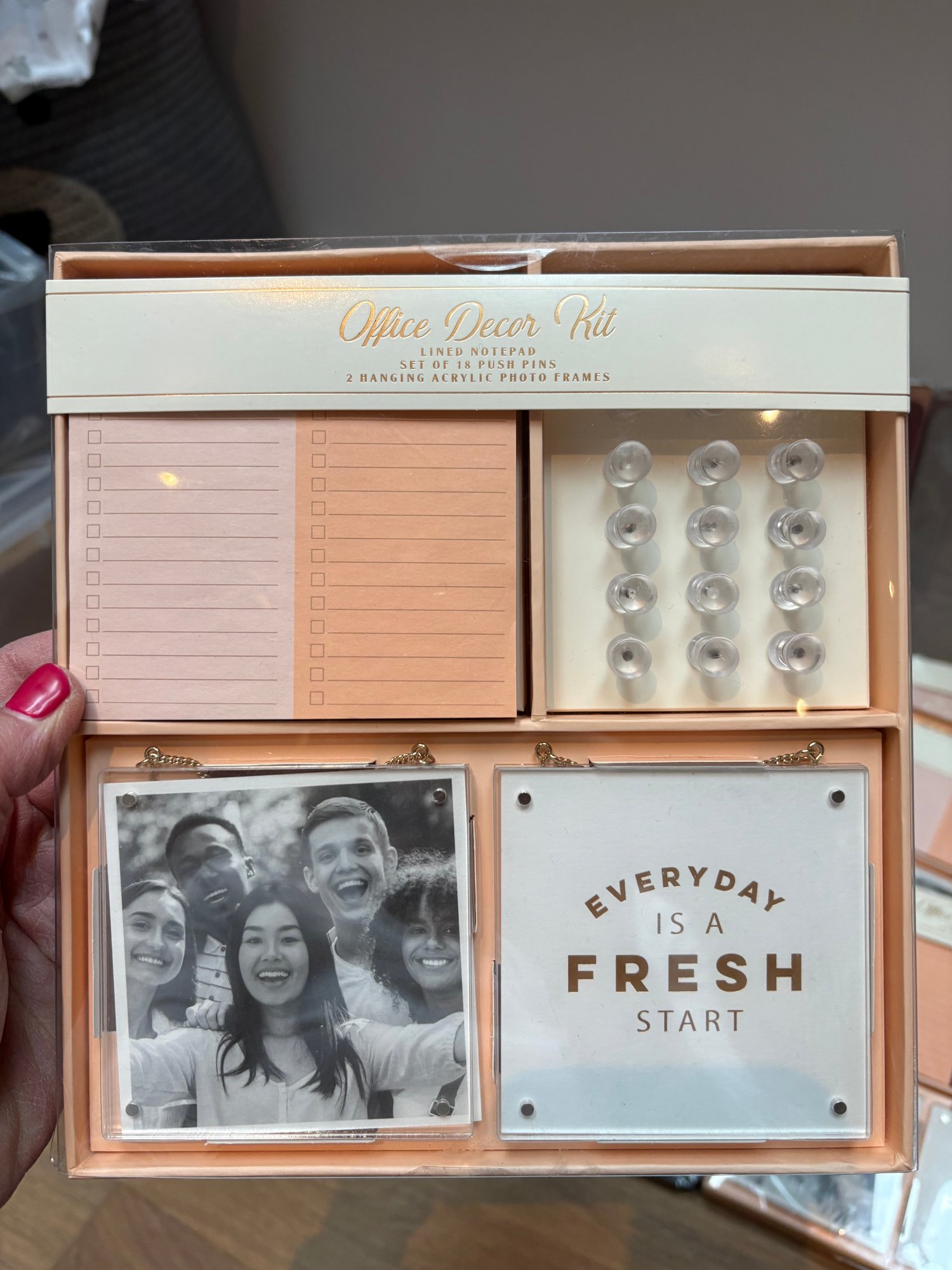 Two packs of paper folders, four expanding folders, tall note pad, two packs of three task note pads and four sets of office decor (push pins, two small picture frames and small note pad)