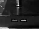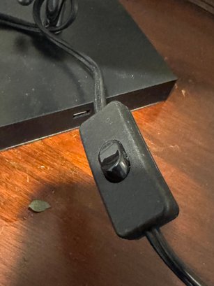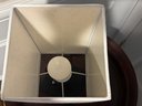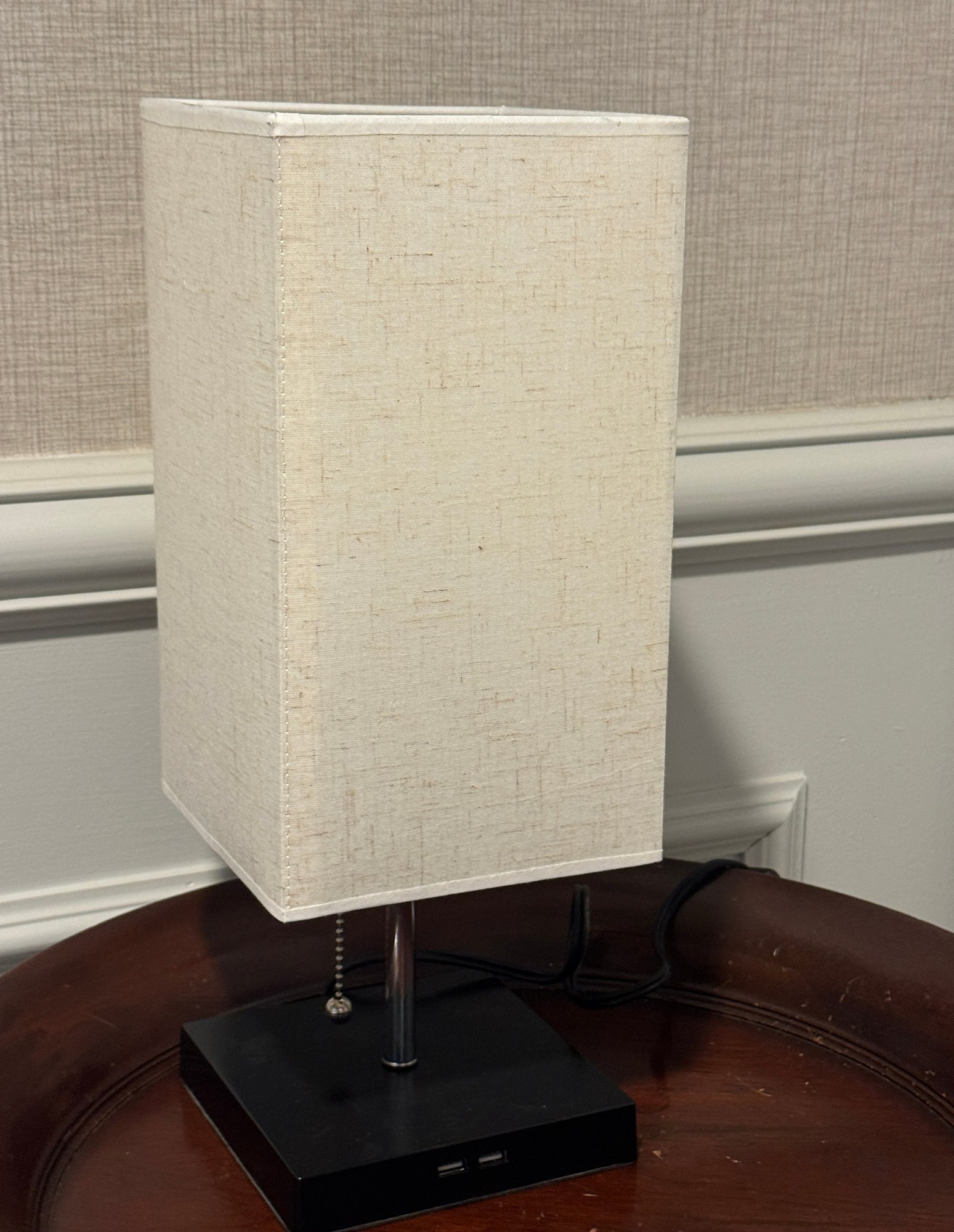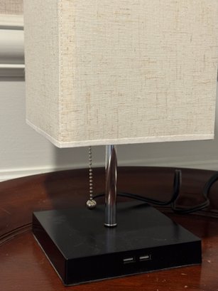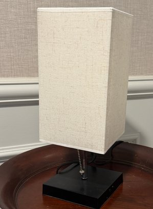 Plastic base with chain pull lamp. Oblong linen shade. Not sure of connection port for telephone, The lamp stands 16" tall.