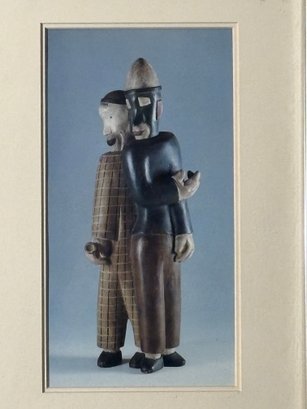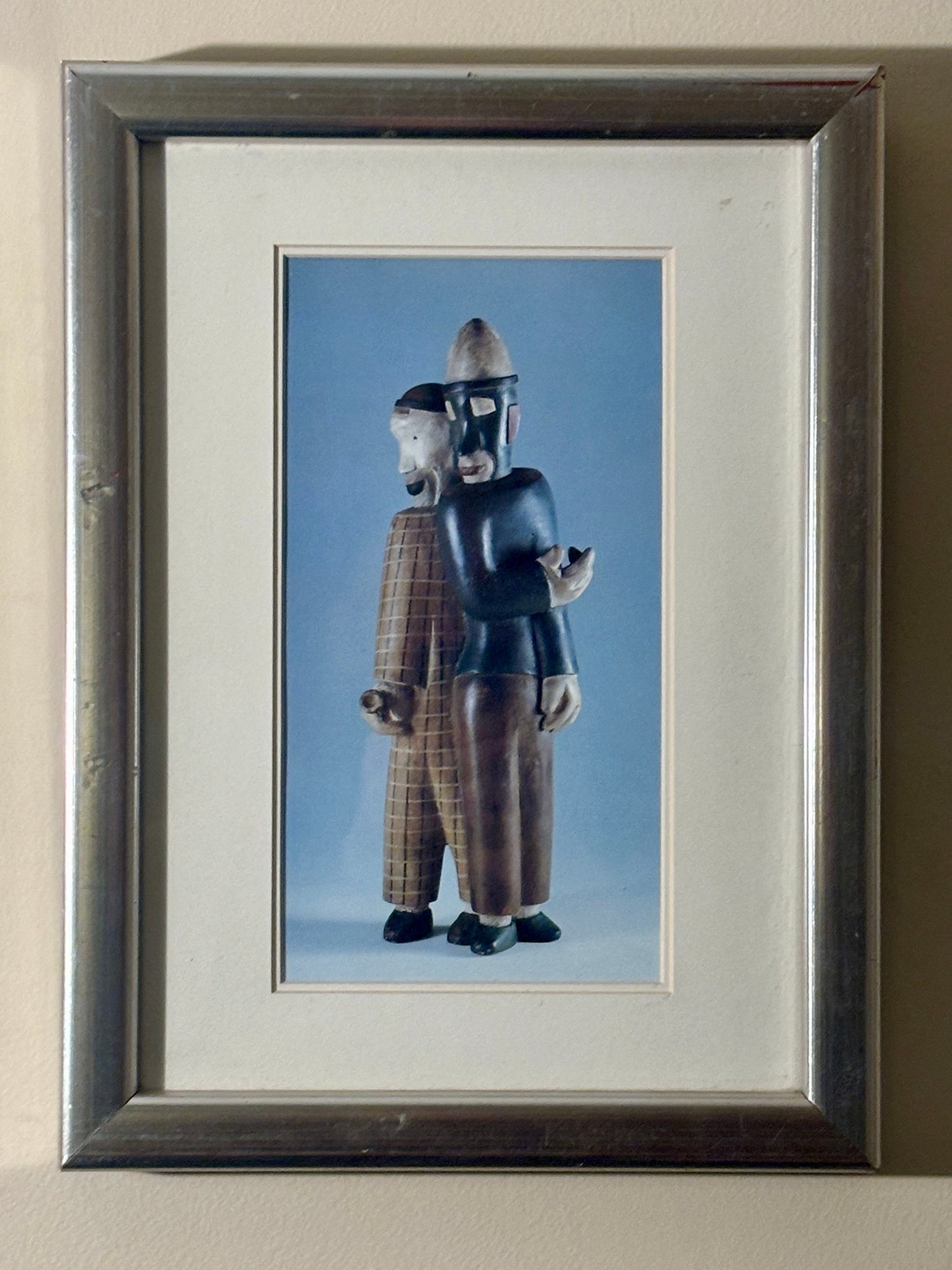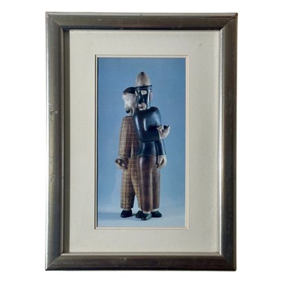 A striking photographic print depicting two standing tribal-style figurative sculptures, presented against a clean blue ground that emphasizes form, silhouette, and surface texture. The pairing creates a powerful visual dialogue between the figures, blending traditional sculptural language with a distinctly modern, gallery-style presentation.