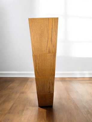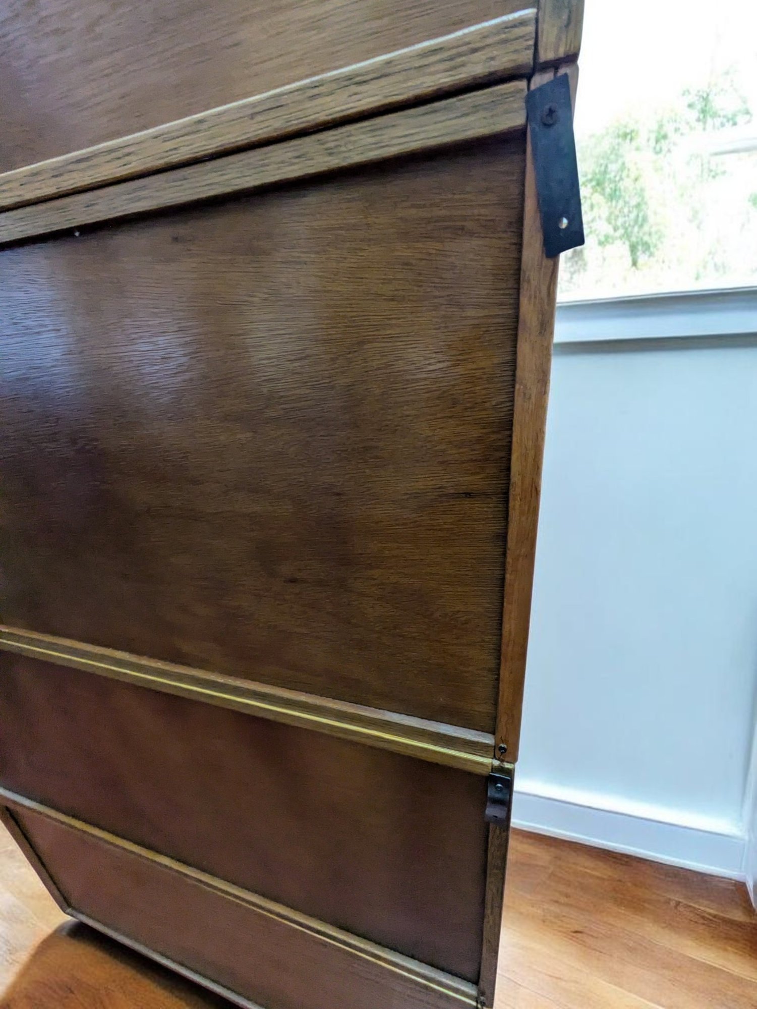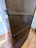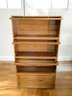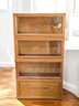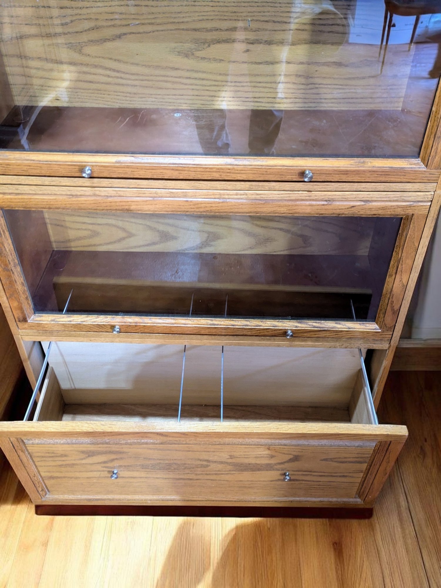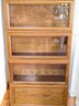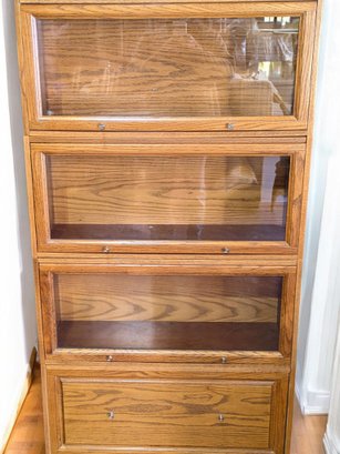 Modular 4 Section Oak Barrister Bookcase. Beautiful Glass-Front Open Sliding Back Glass-Front Doors on 3 of the Units and the Bottom, with a Large Front Drawer. Each Unit Stacon On Top of the Others, Can be Attached & Secured in the Back. Some marks are consistent with age and use. Overall, Very Good Condition. Please see all photos as part of the description and condition. 33"W x 48"H x12"D