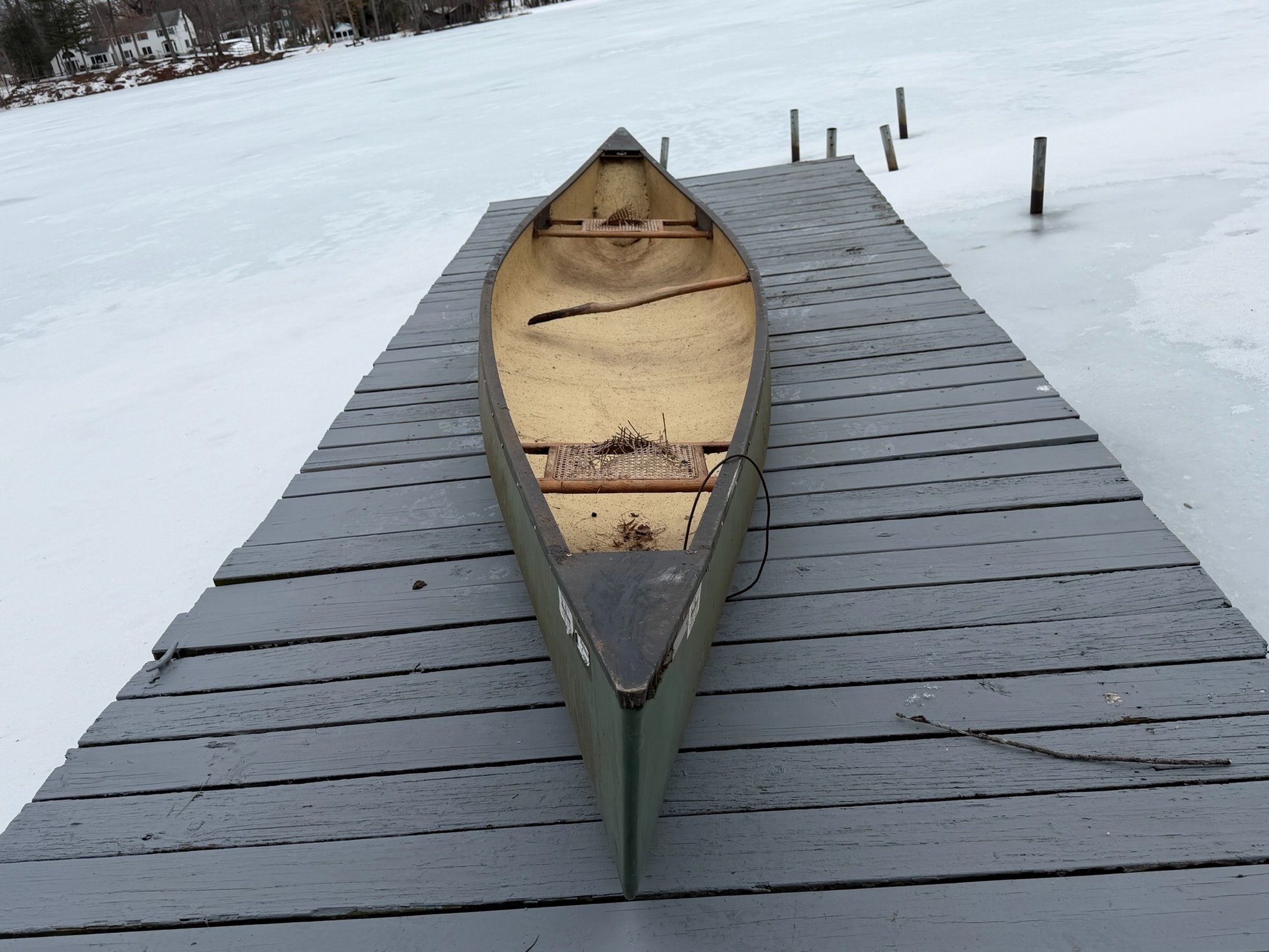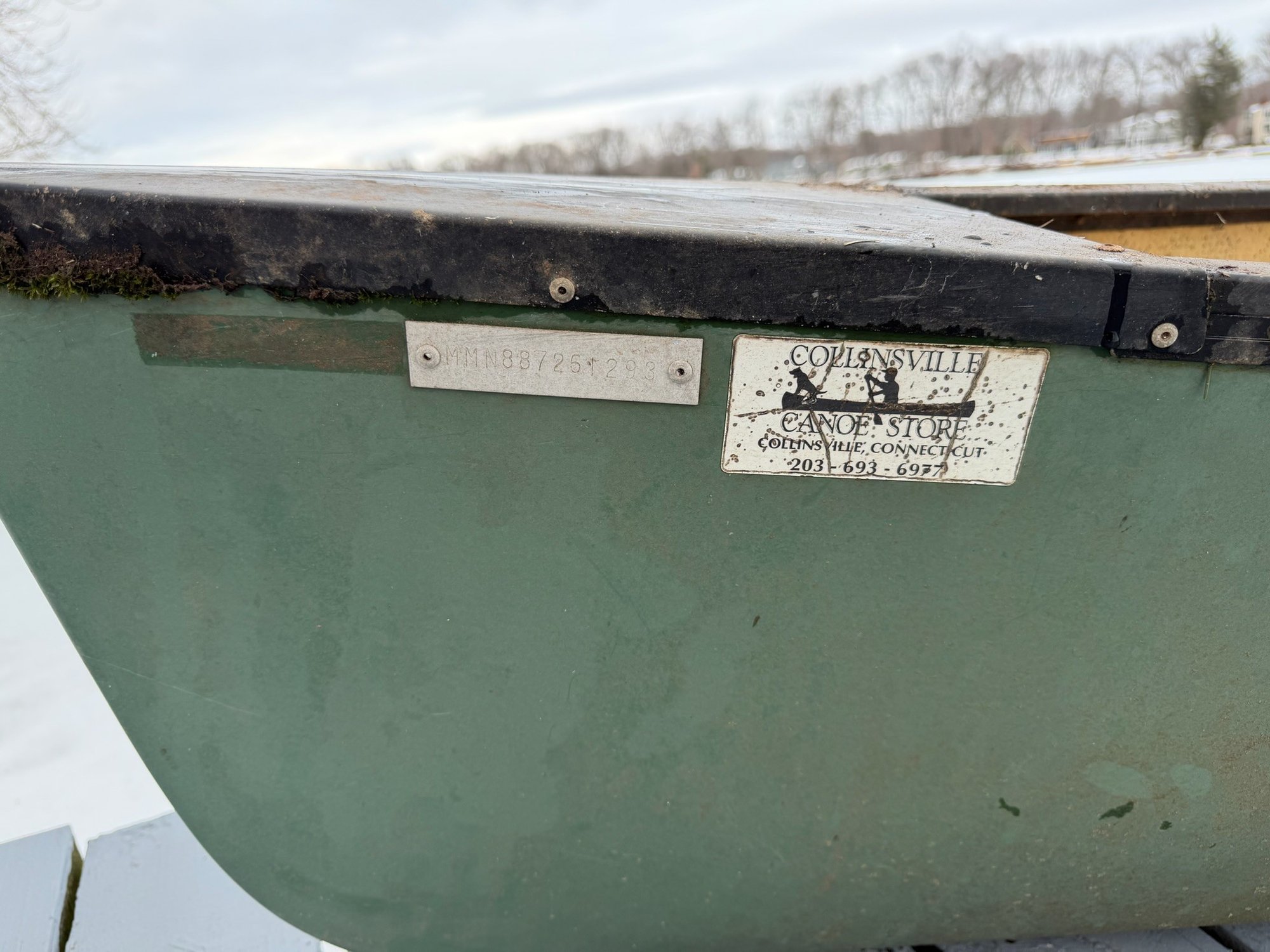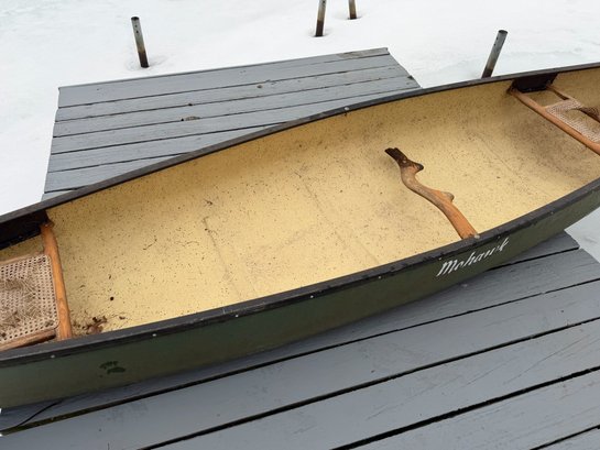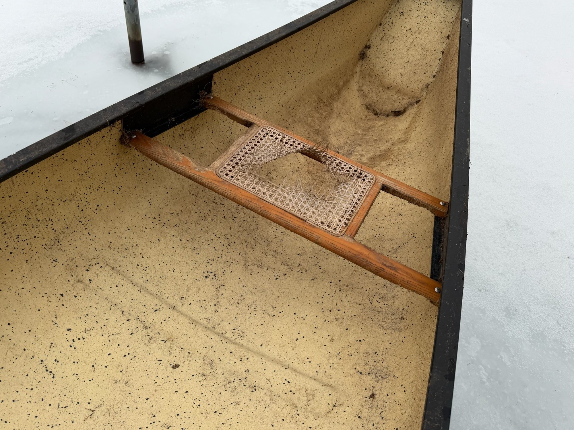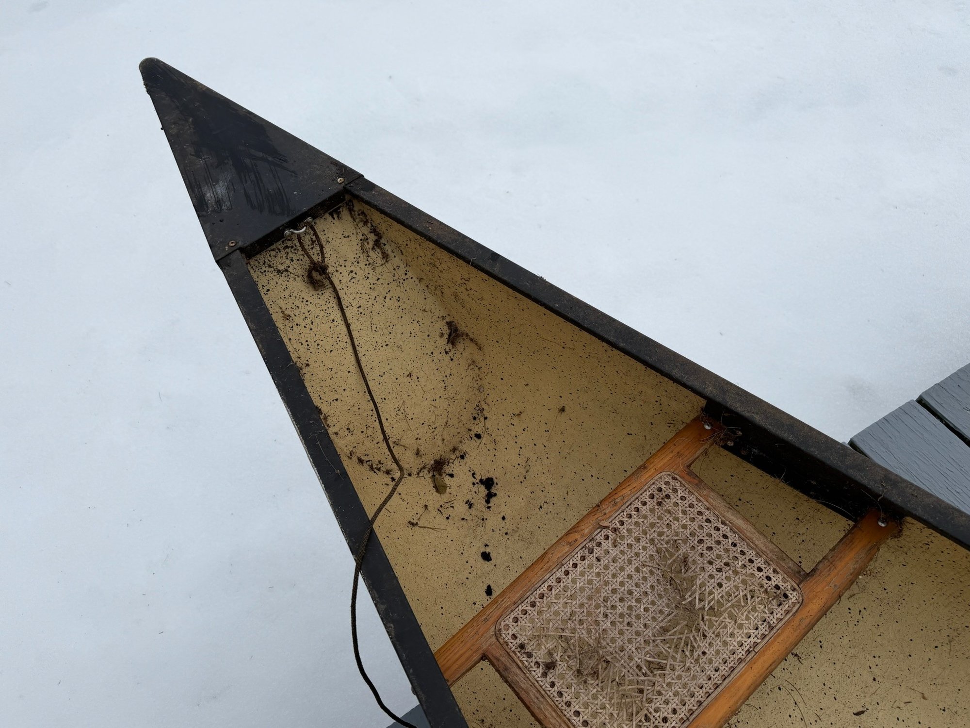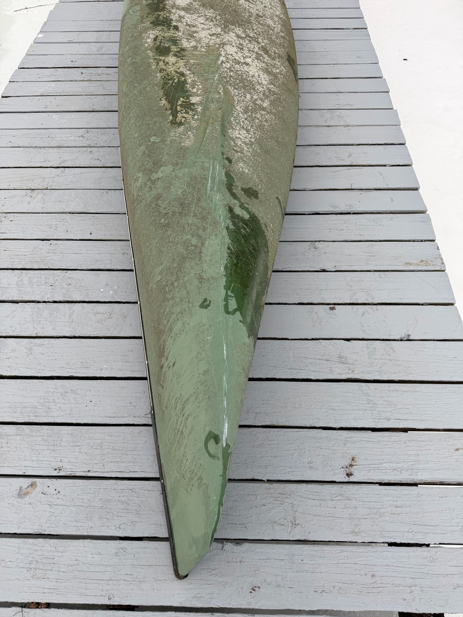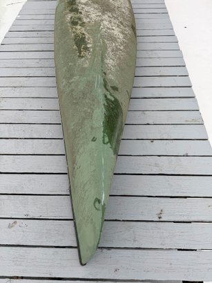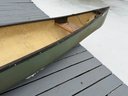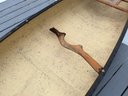 16' length, 34" width. Wood needs replacing, boat was stored upside down, looks like no cracks in hull, needs cleaning. Sold As Is.