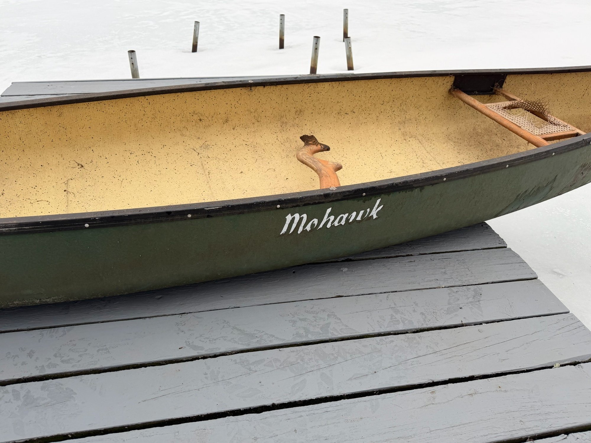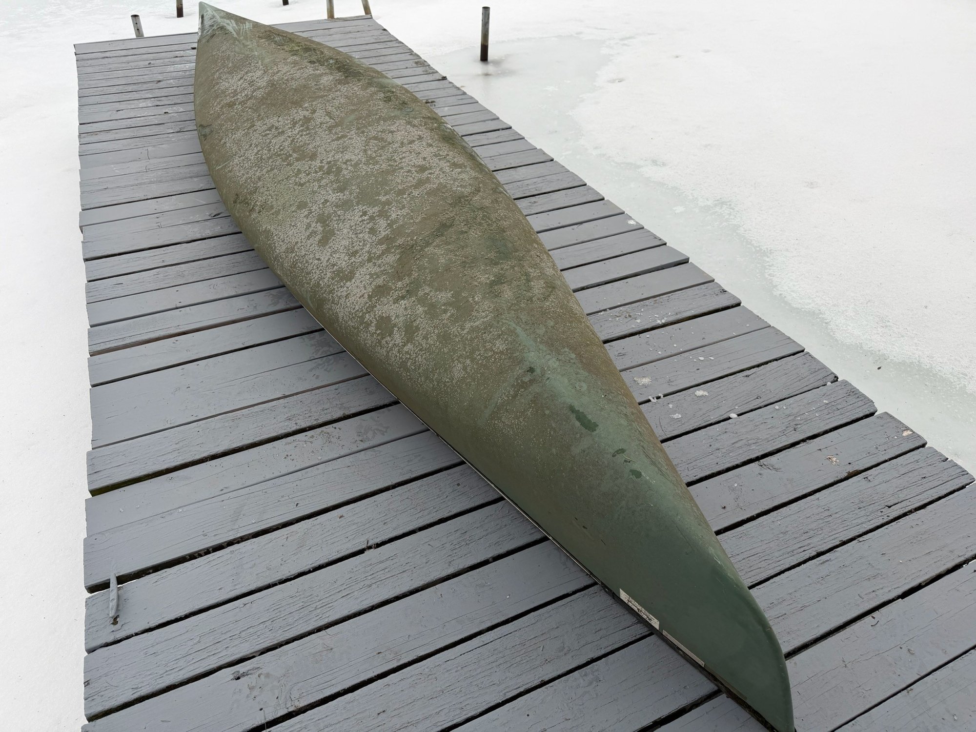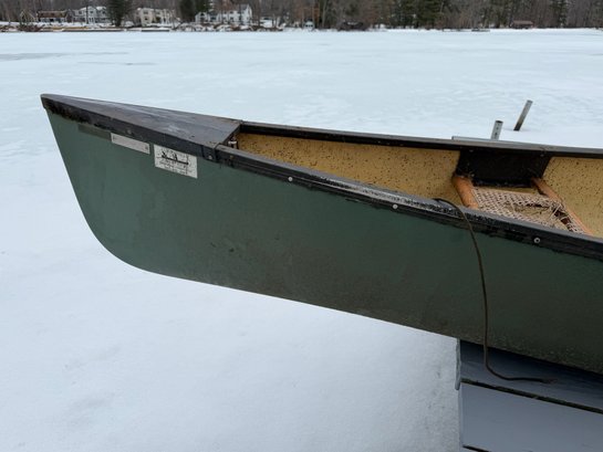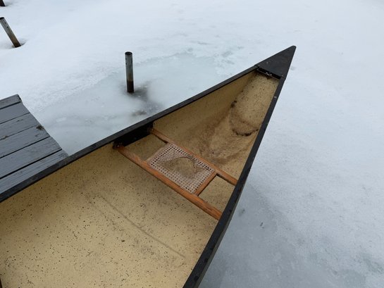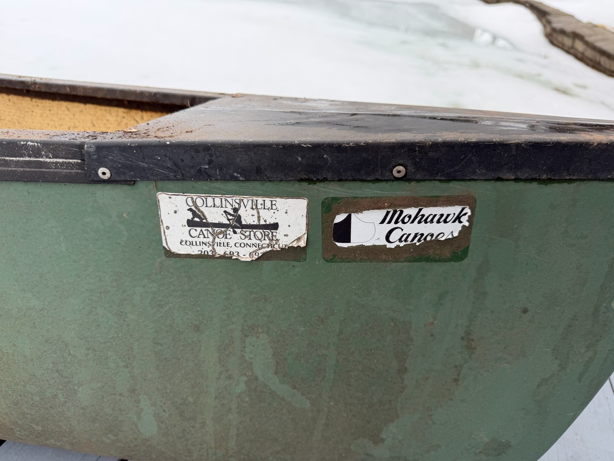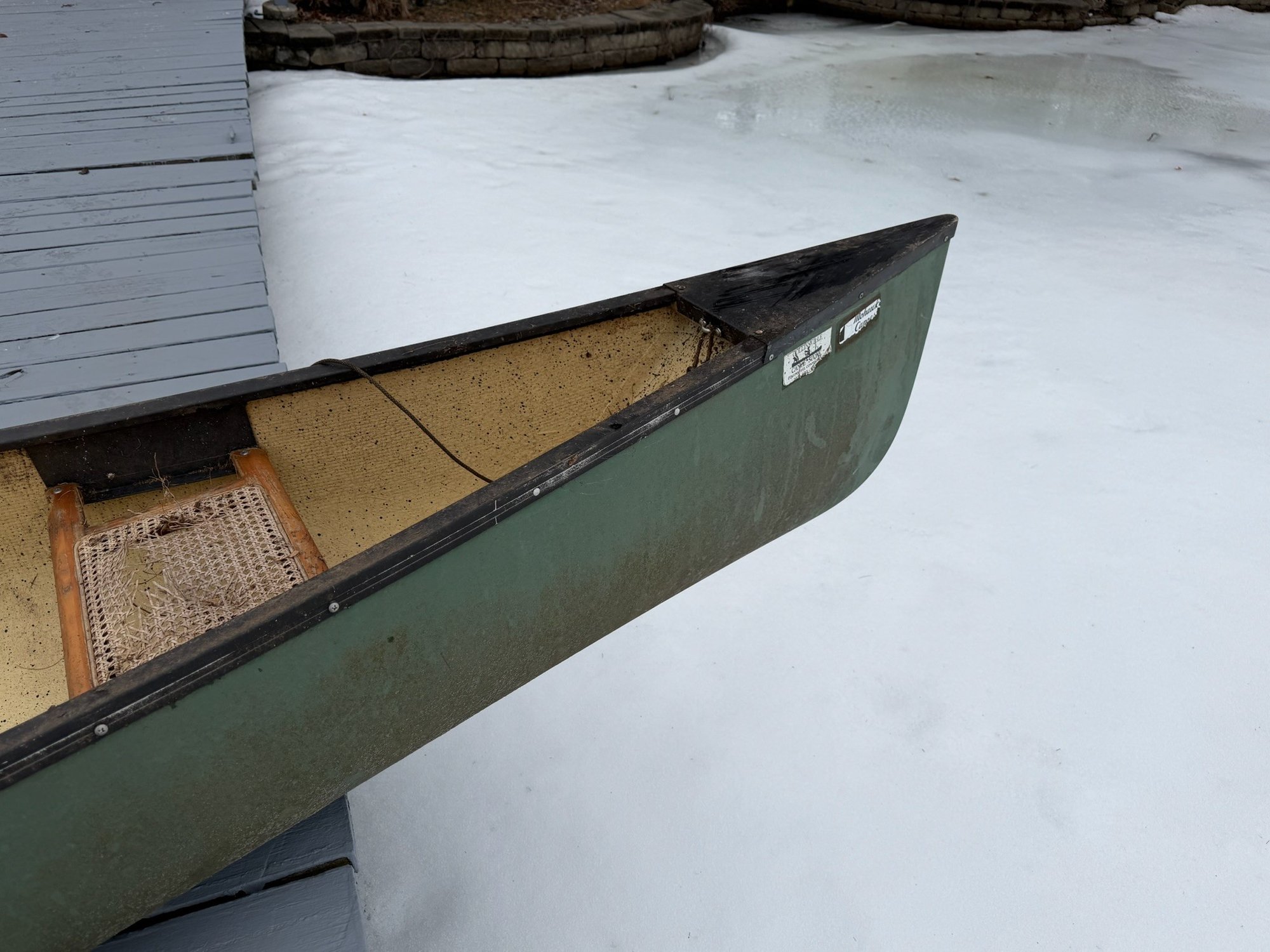 16' length, 34" width. Wood needs replacing, boat was stored upside down, looks like no cracks in hull, needs cleaning. Sold As Is.