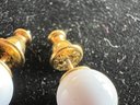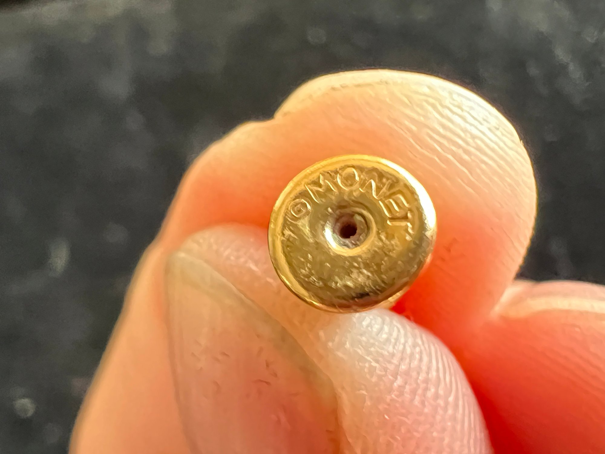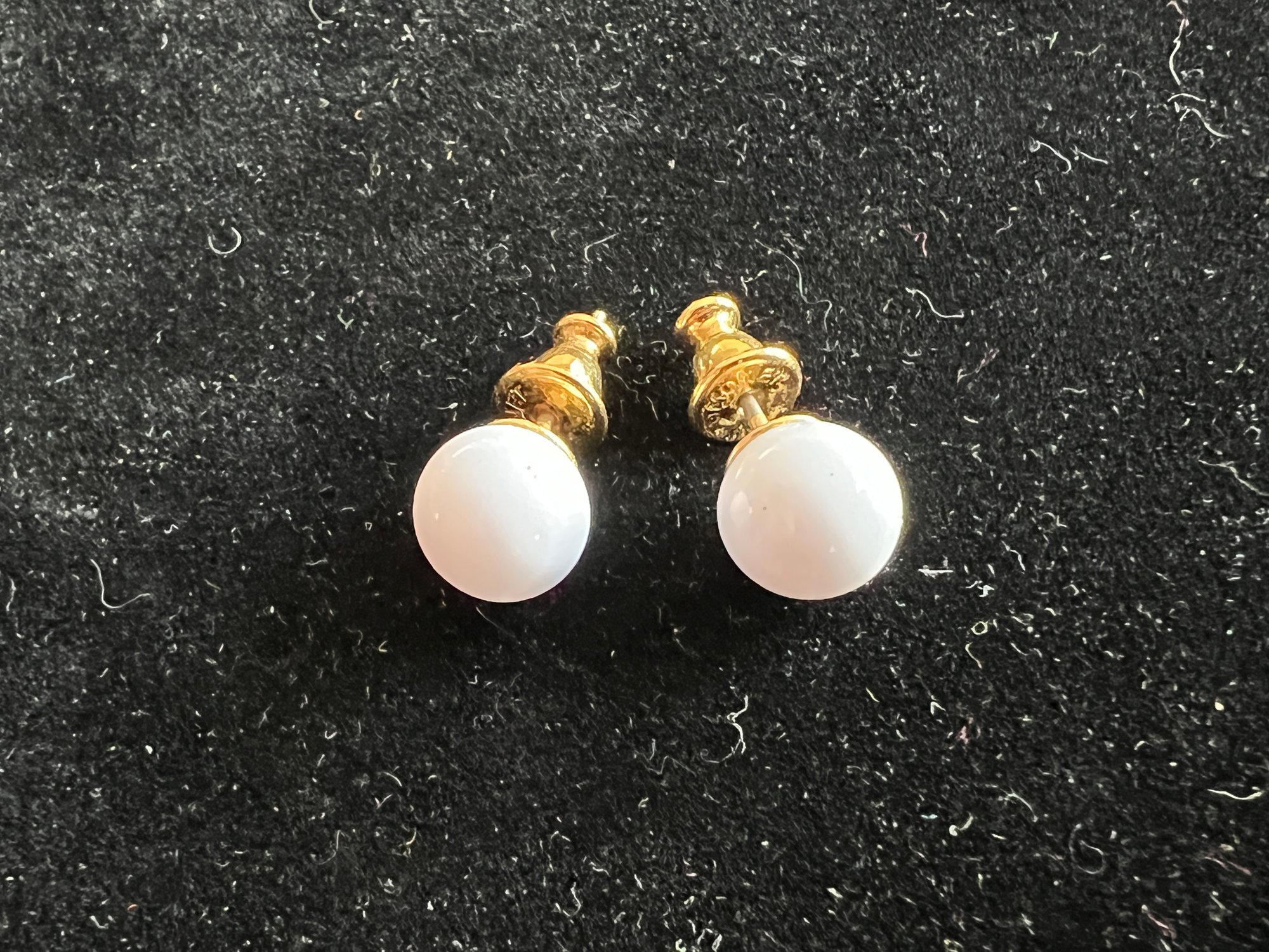 Vintage Monet brand white bead stud earrings with gold tone metal.
