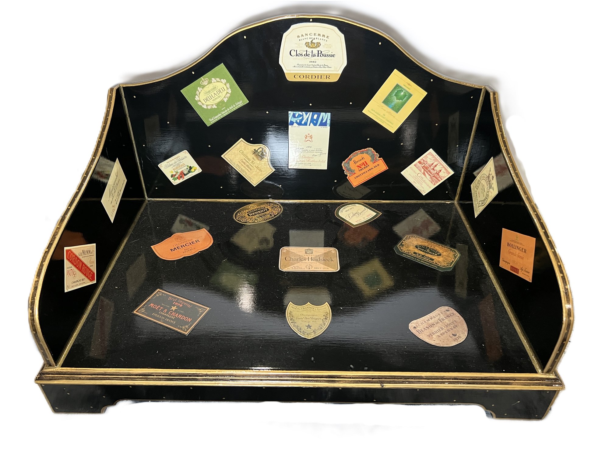 Solid black lacquered wood (much heavier than you'd think) tabletop shelf for stacking wine bottles, adorned with assorted Champagne and wine labels decoupaged into the lacquer surface.