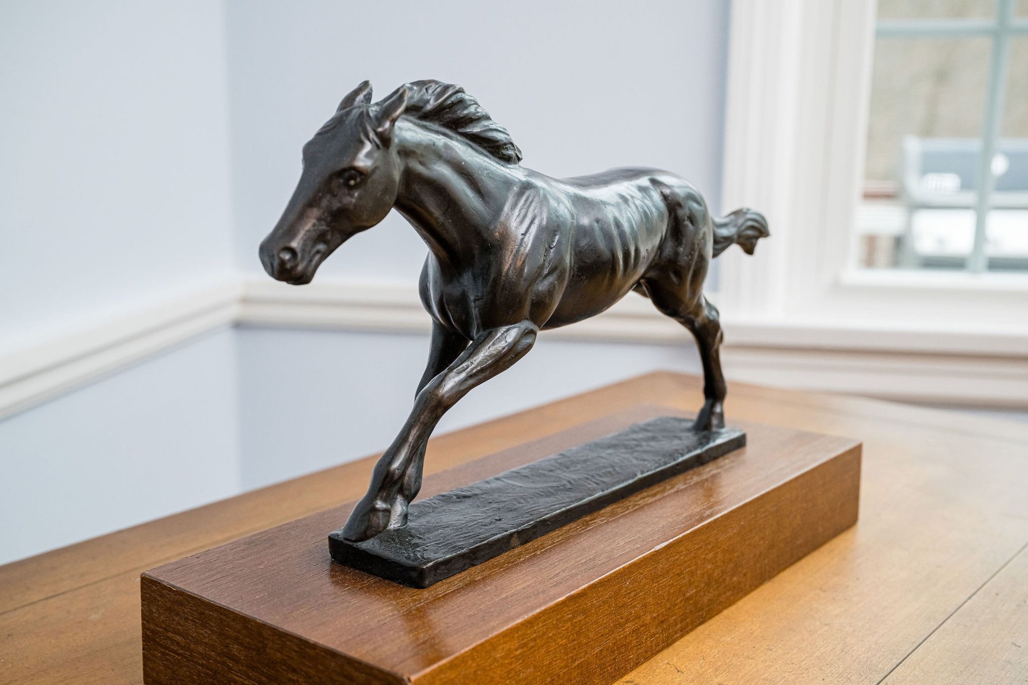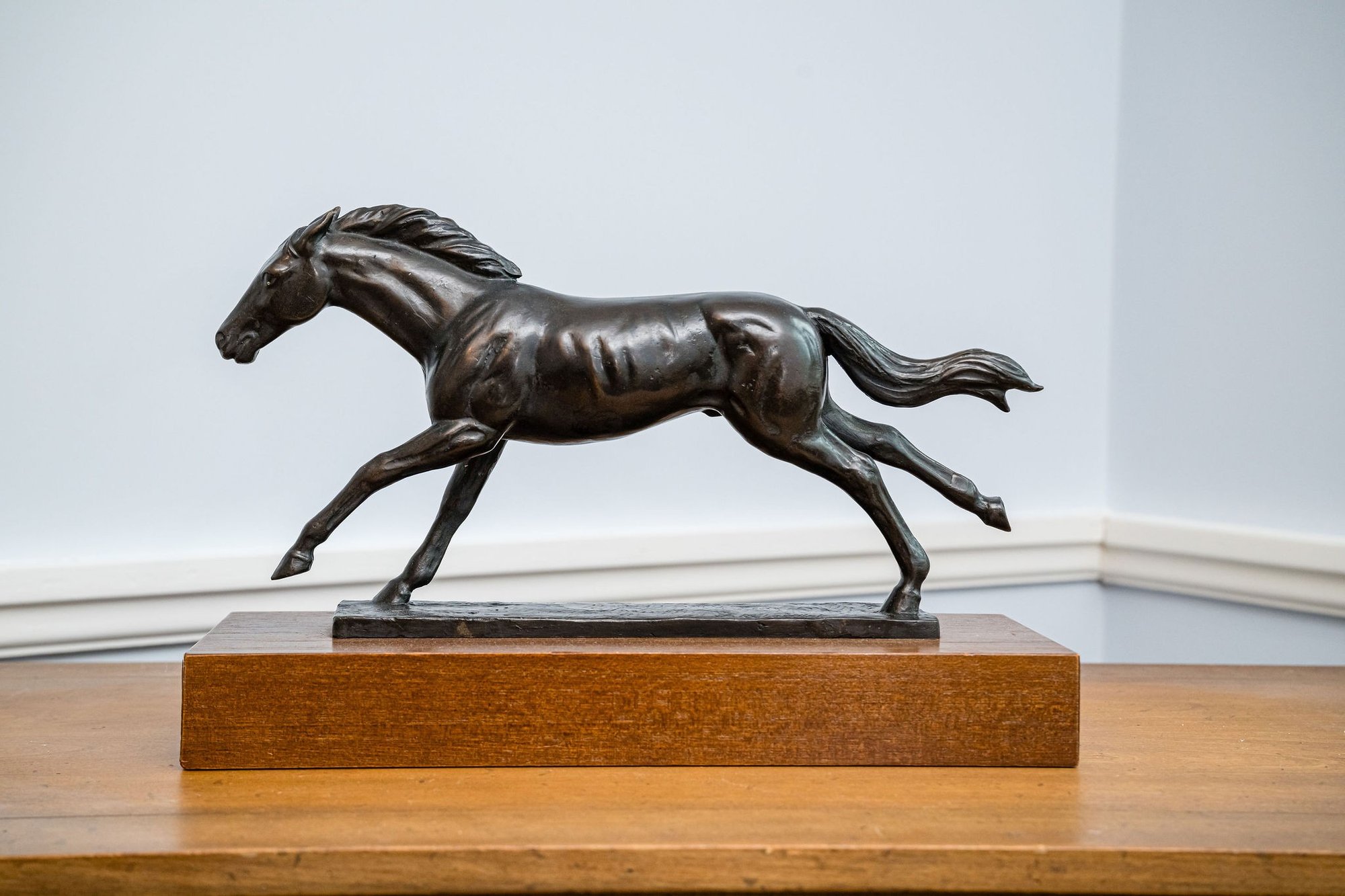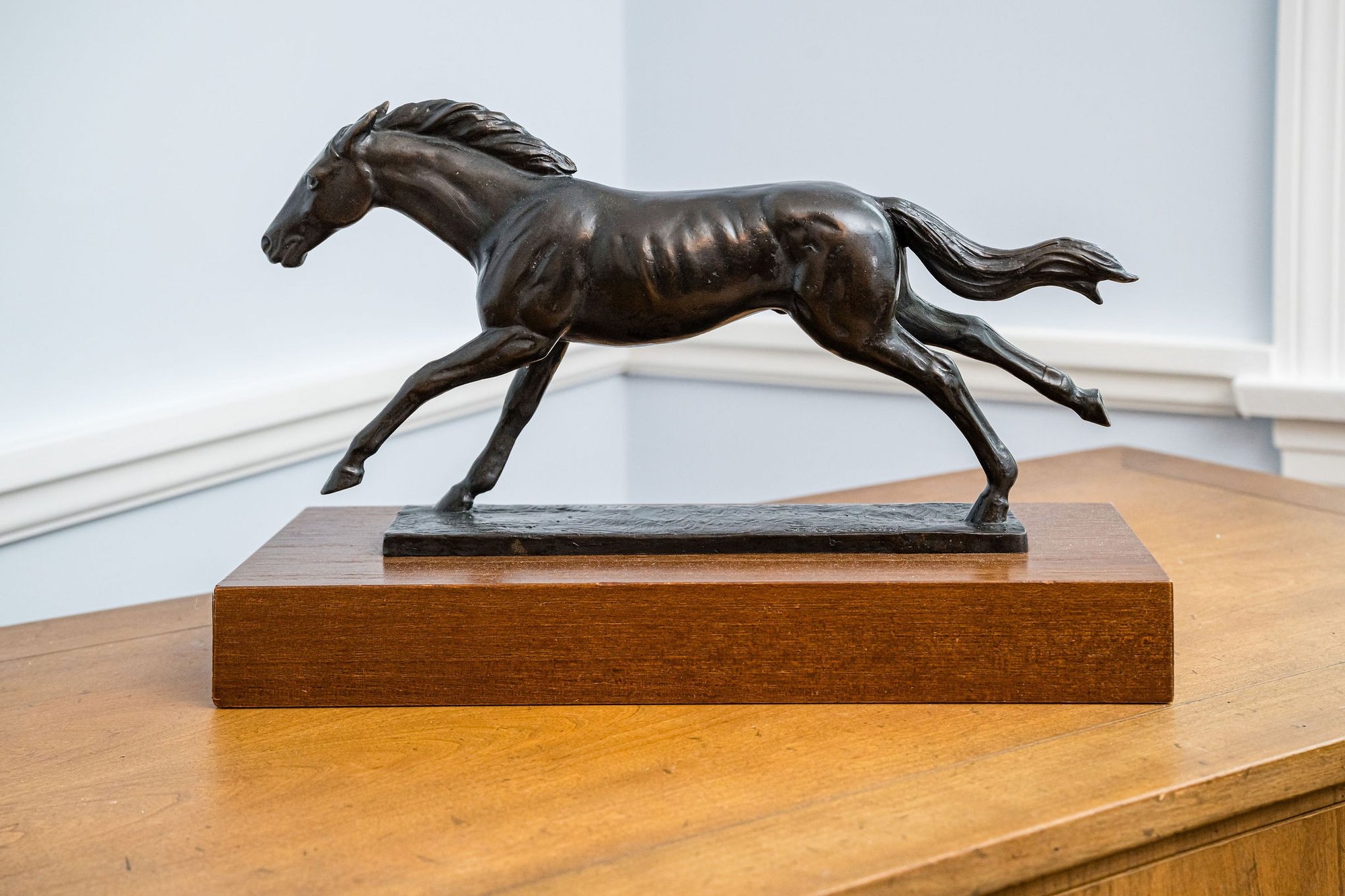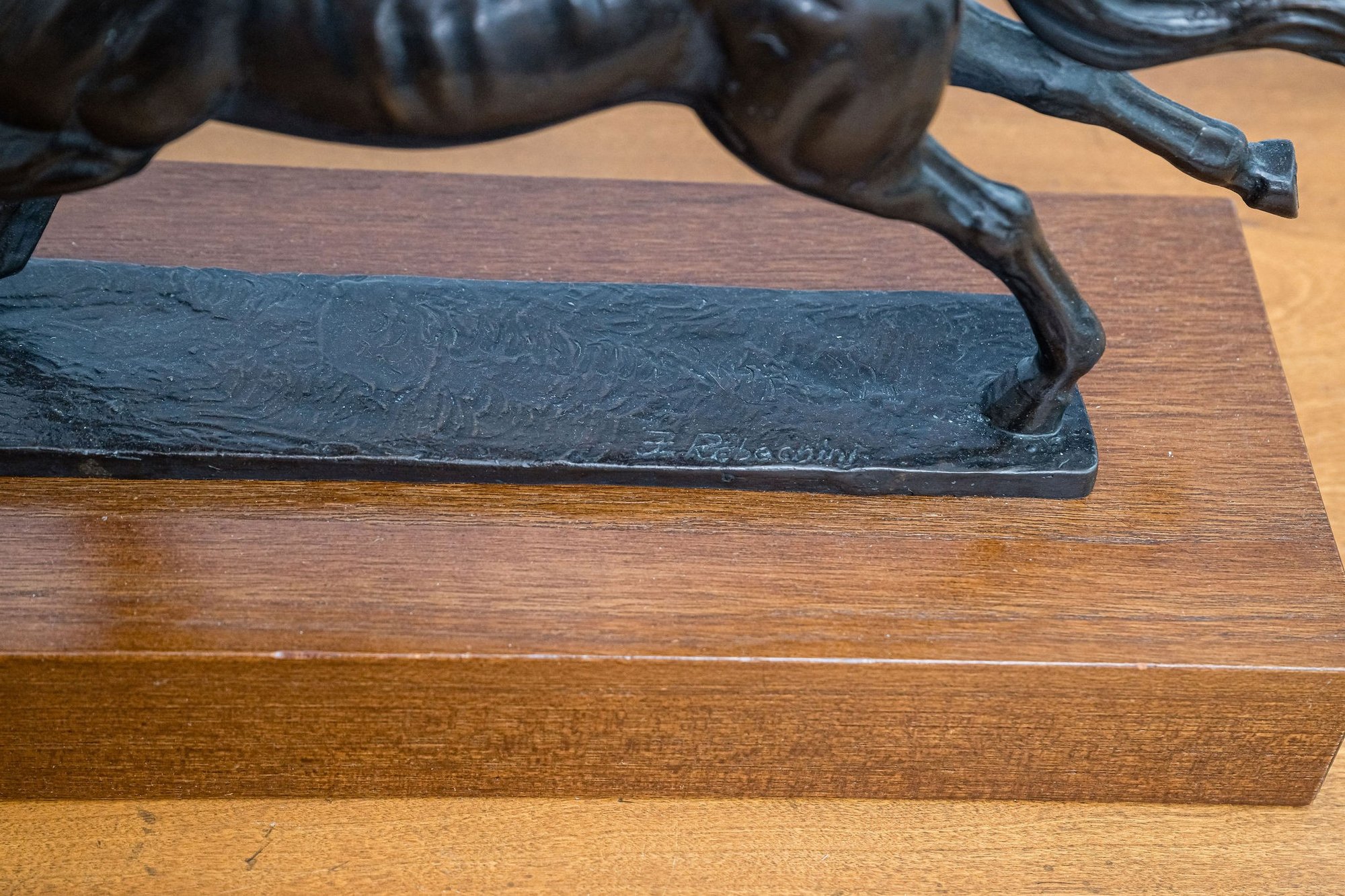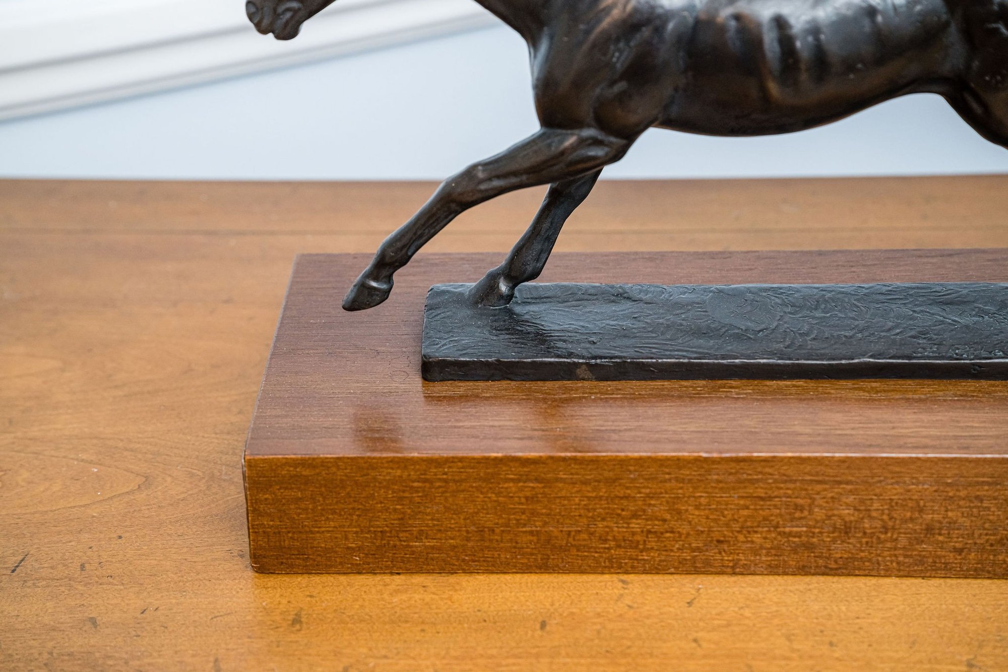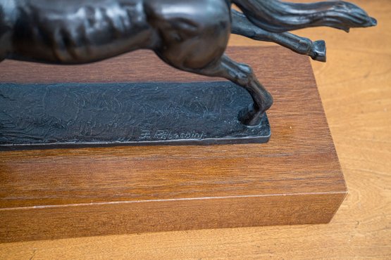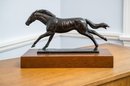 Very heavy and beautifully mounted on a polished mahogany block. Signed by artist, please review for identification. Base: 15x6x2, Sculpture: 16x3x8