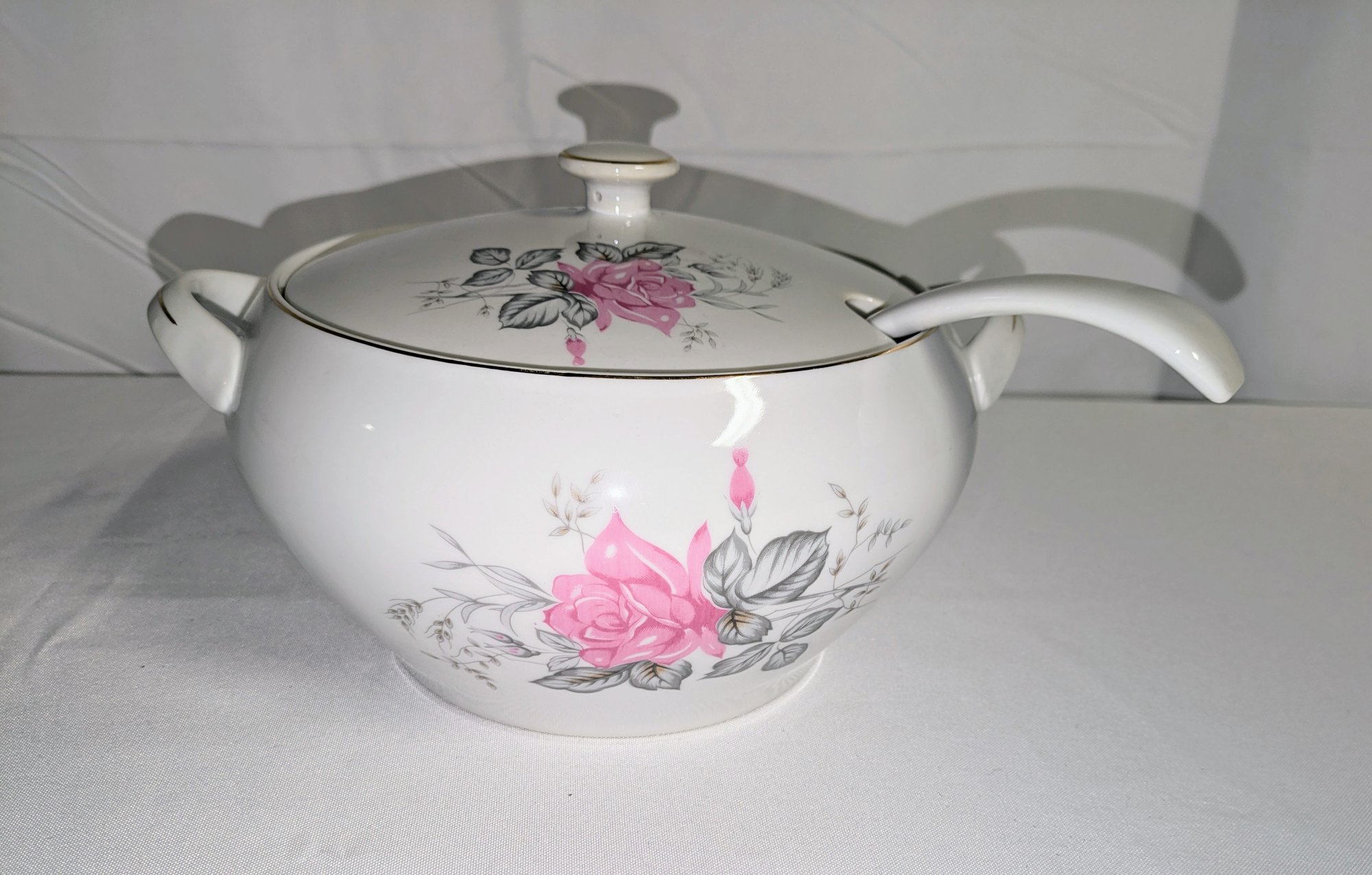 Imperial Rose, japan, Porcelain Soup Tureen with Ladle. Beautiful Floral Design. Excellent Condition. Please see all photos as part of the description and condition. 6"H x 10" Diameter Handle to Handle, Inside Diameter 7.75"