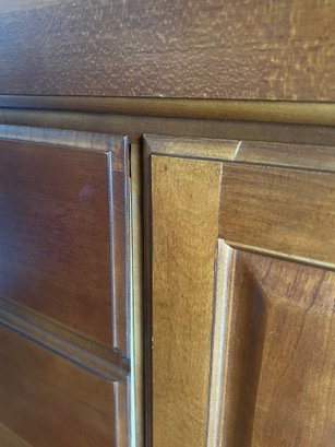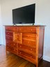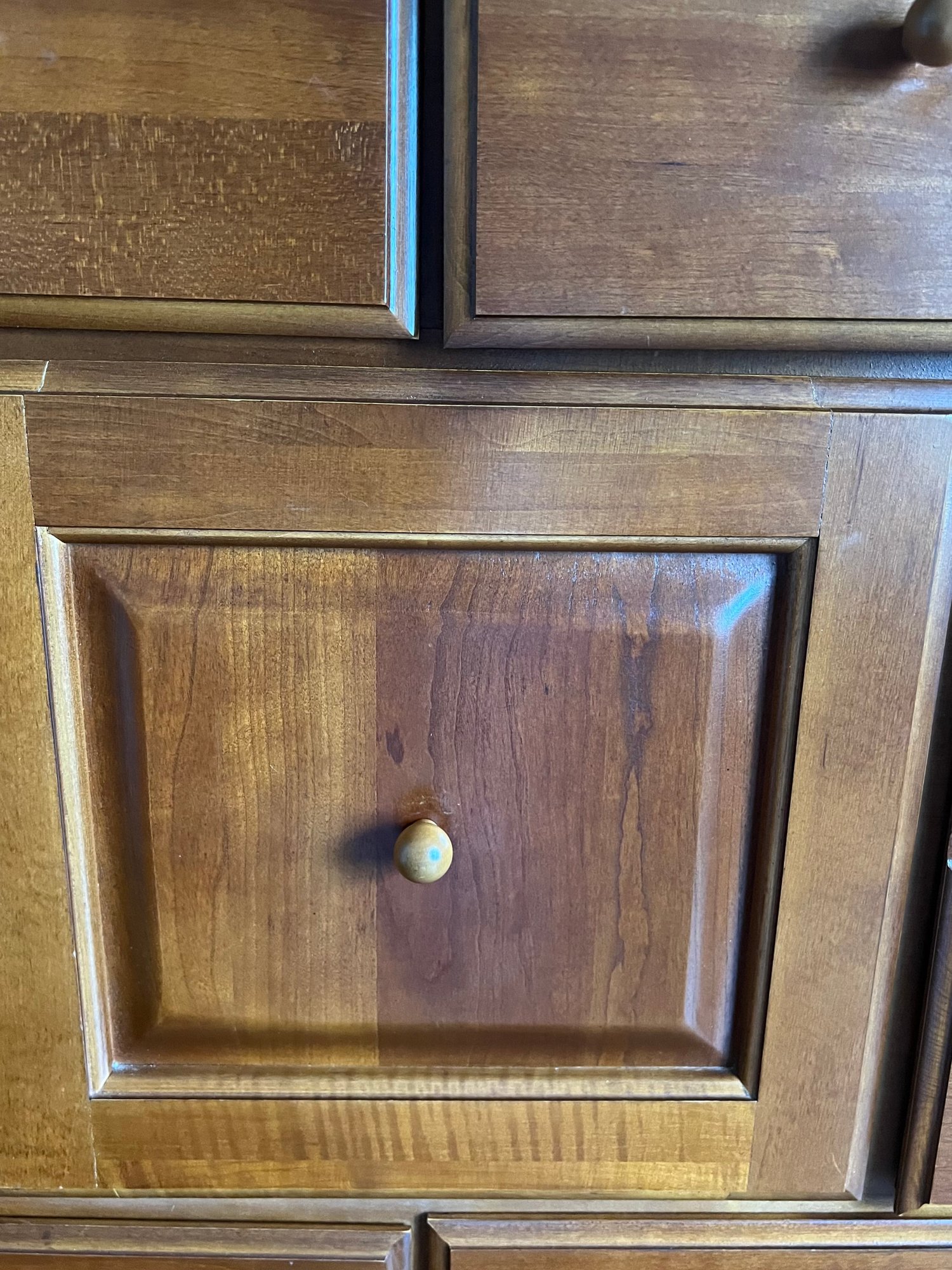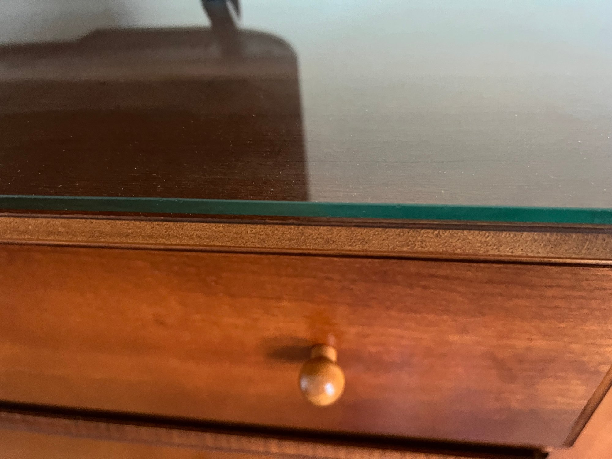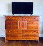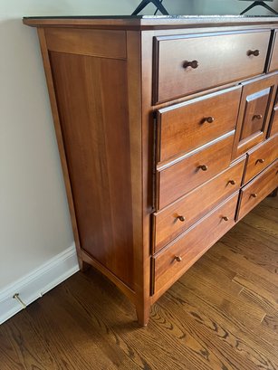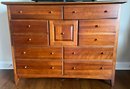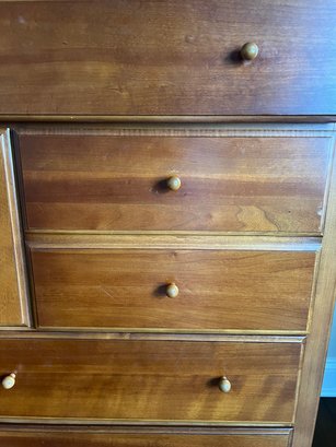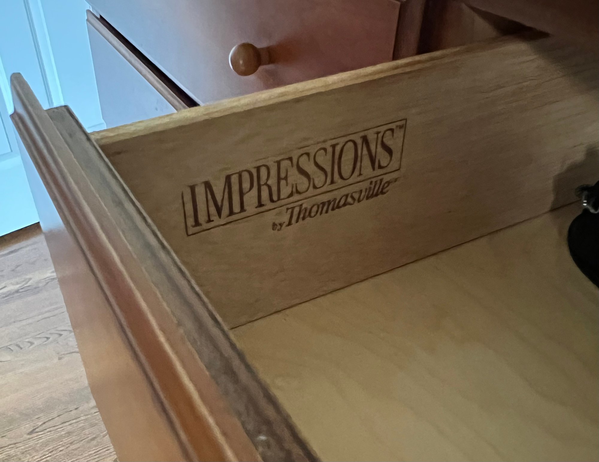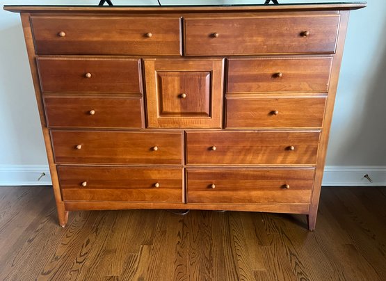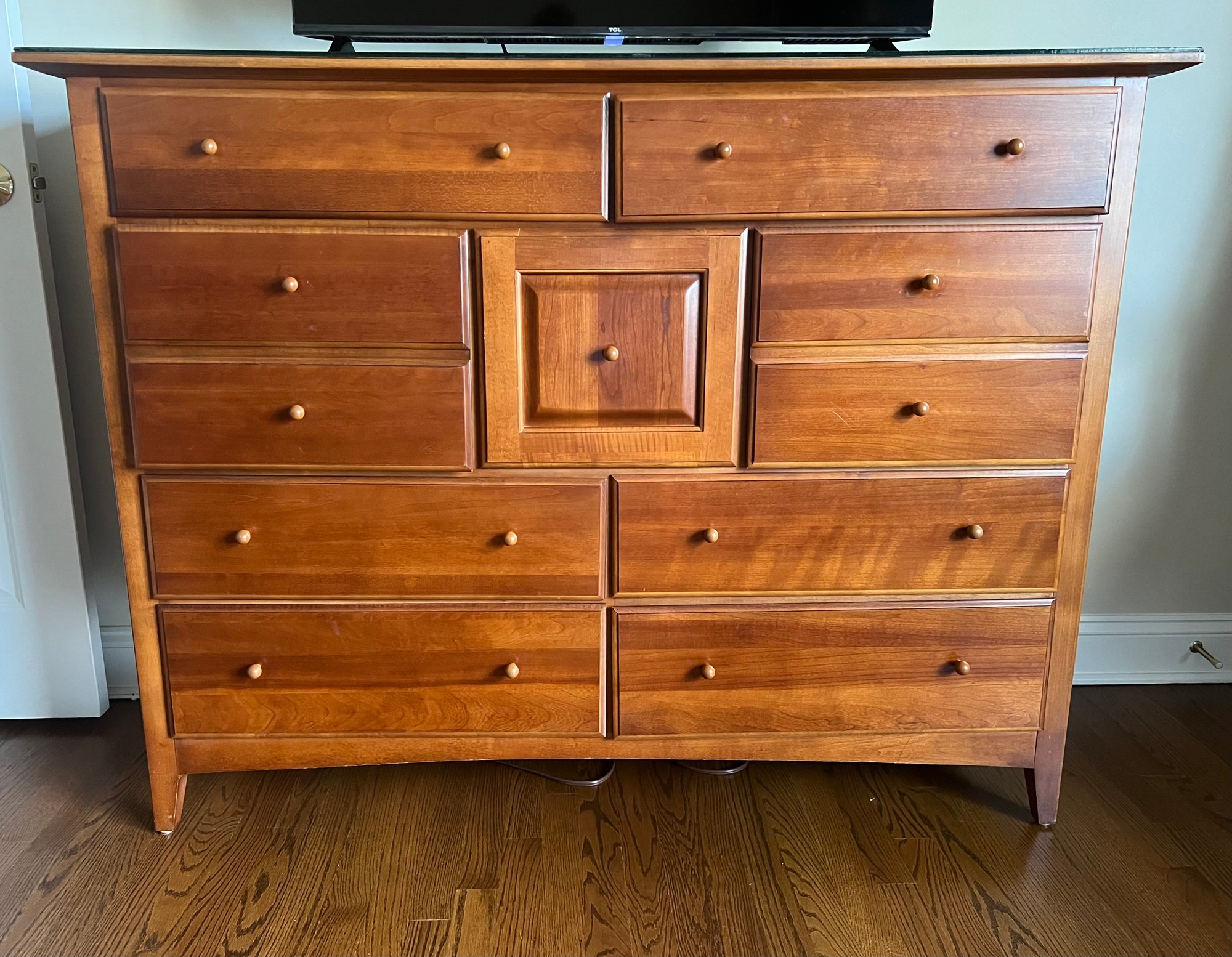 This adorable chest by Thomasville is made in the arts and crafts style. It has nine drawers in multi size and shapes with petite round matching wood knobs. The center square drawer gives a playful quality. With a removable glass top.