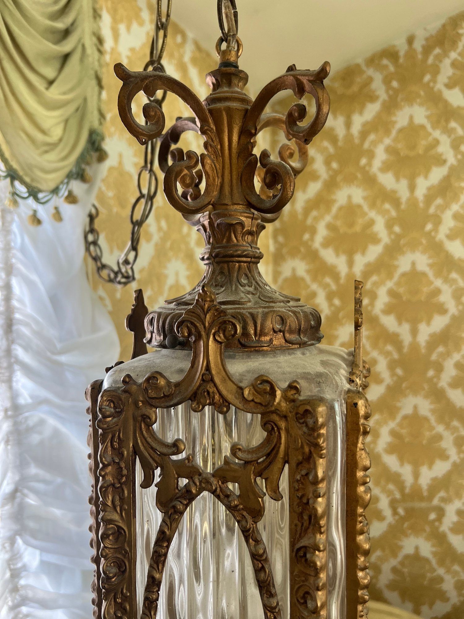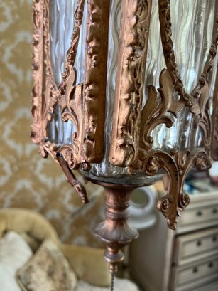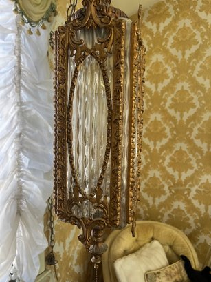 Impressive vintage 1960s ornate scroll and flourish design in an antiqued gold finish with textured plexiglass shade. Cord/chain is estimated to measure 10' to 12' in length.