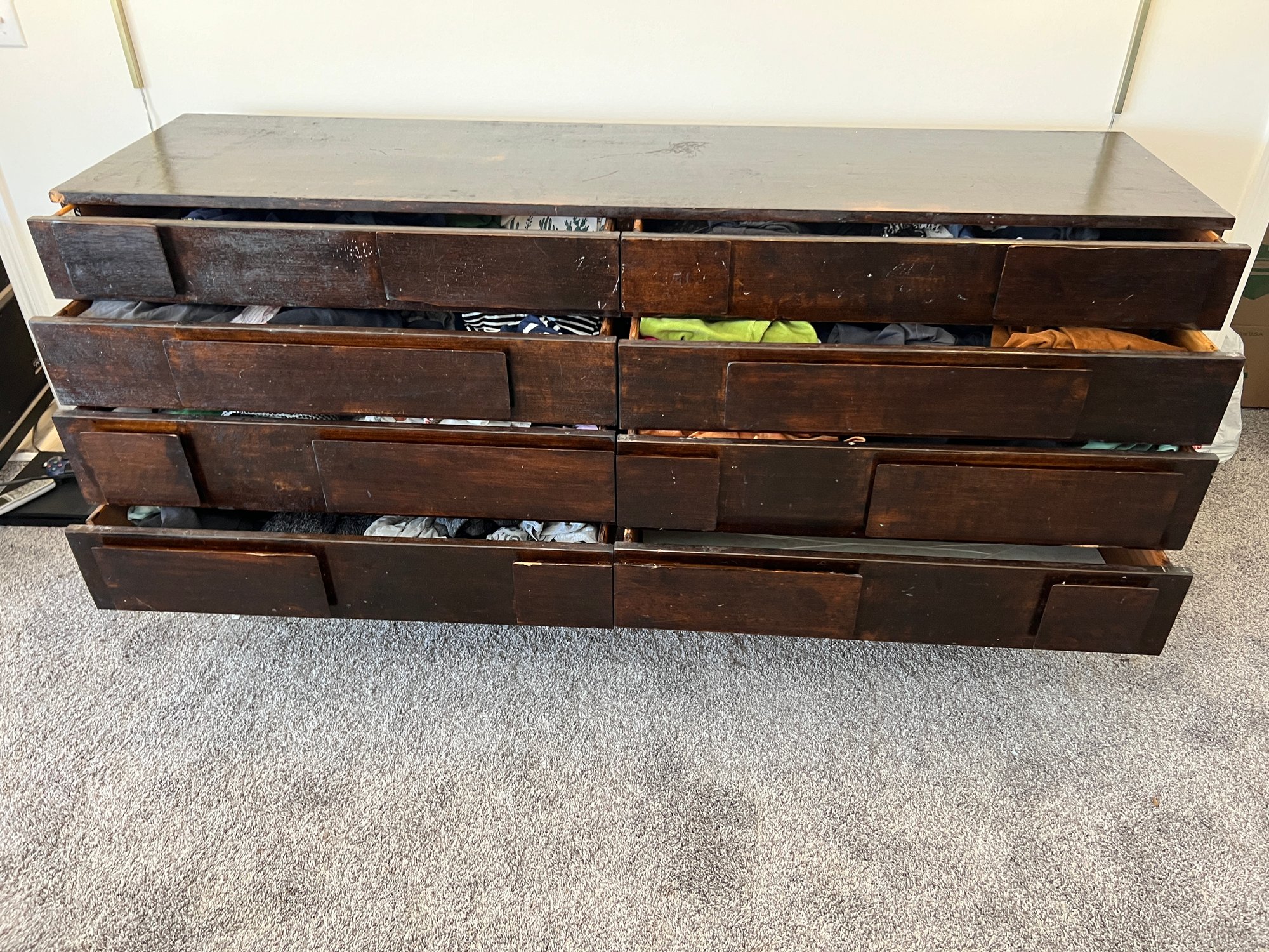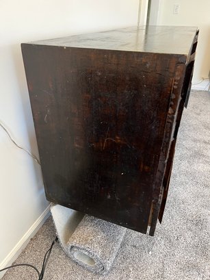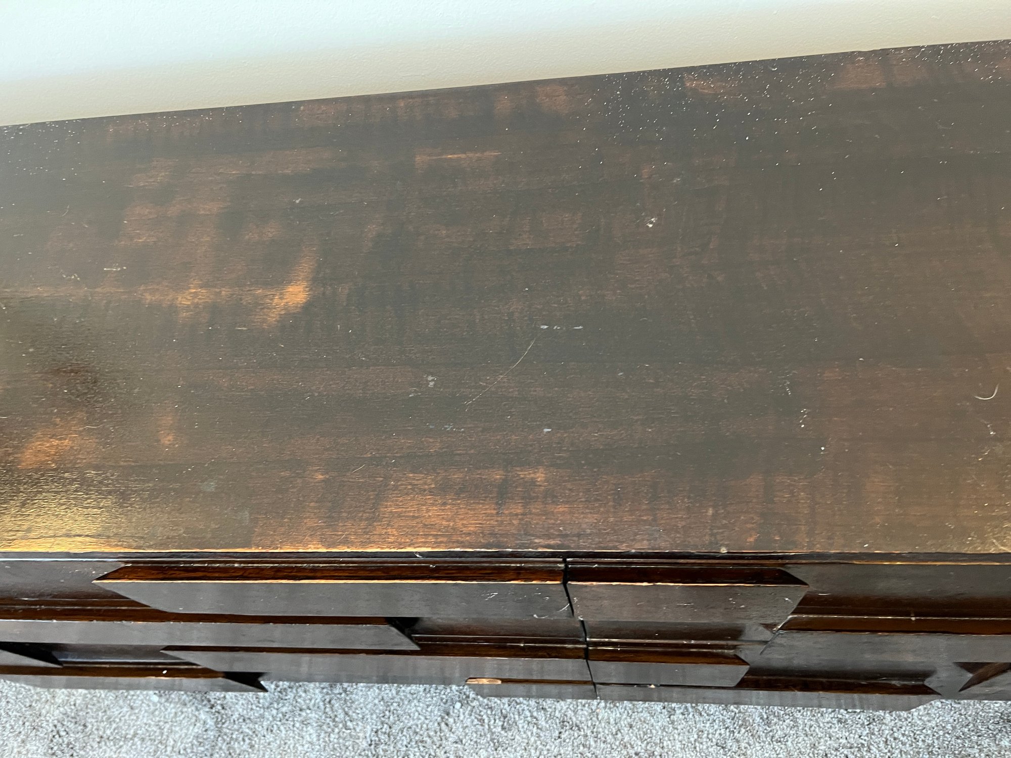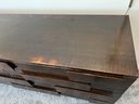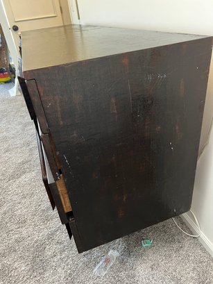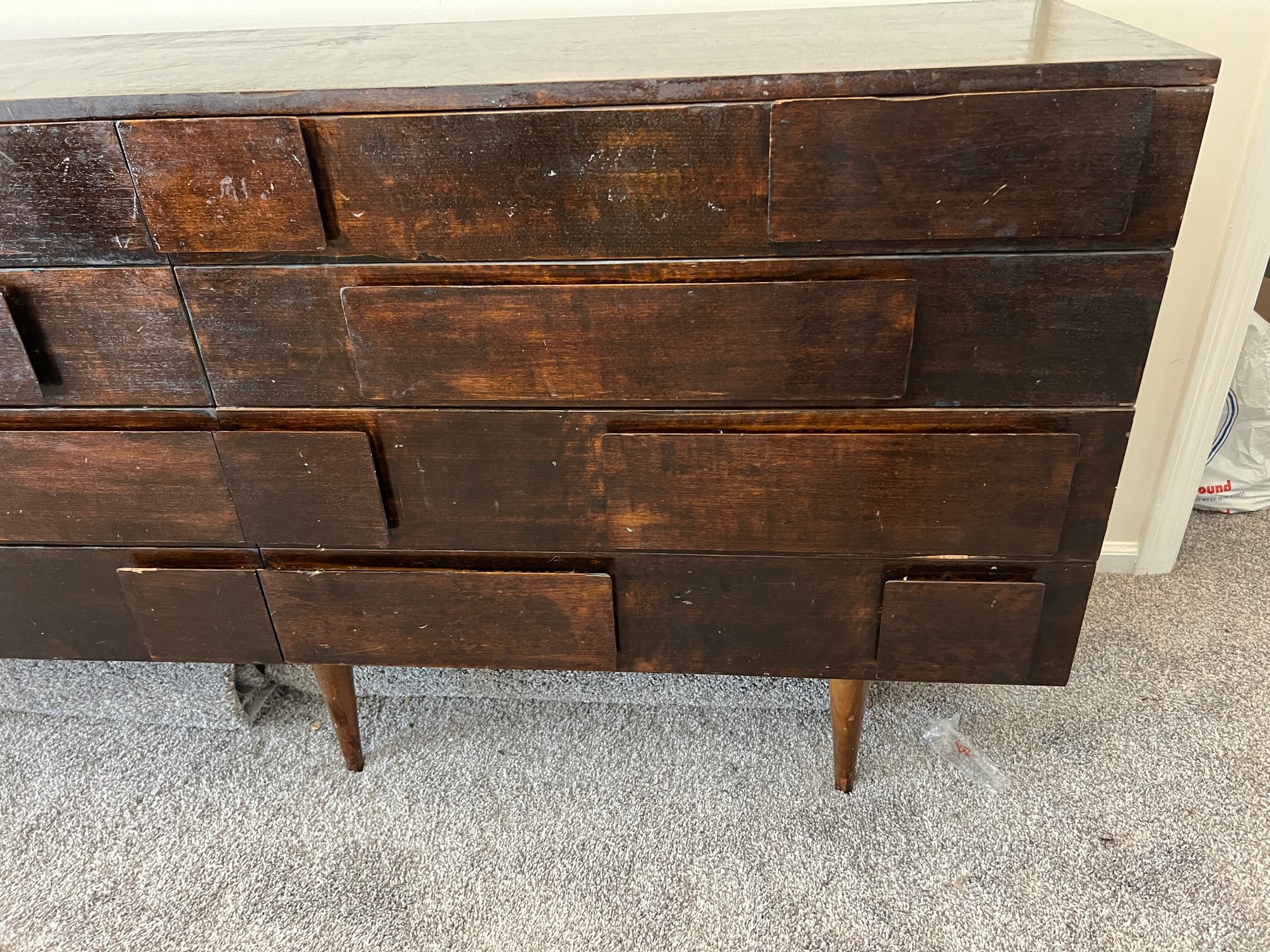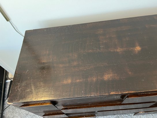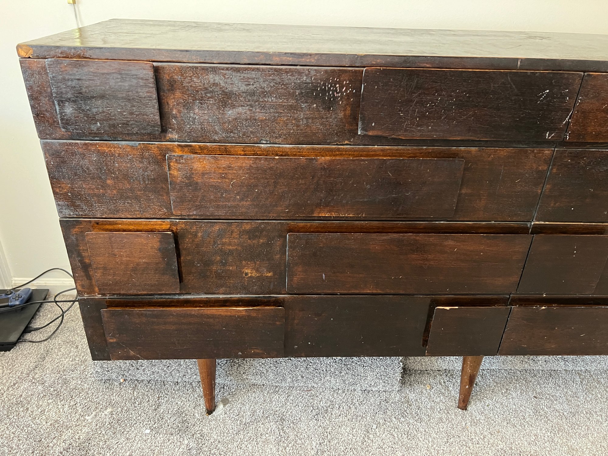 Diamond in the rough does not even begin to express the potential of this piece - a rare and sought after mid century modern brutalist style eight-drawer dresser by designer Gio Ponti for M. Singer & Sons. The original walnut has been stained dark after the original finish was worn. Perhaps the right design lover could restore it to its former glory. This piece (in its seemingly original finish) SOLD on 1st Dibs for $69,000!