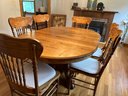 Dining table has pedestal base with huge claw feet and two 12" leaves. The table is 48" round when closed. Open it measures 72 x 48 x 30. The chairs have stamped backs and measure 40 x 18. They have removable cushions. The corner cabinet in separate lot matches this set. The entire set is in beautiful condition. Like new.