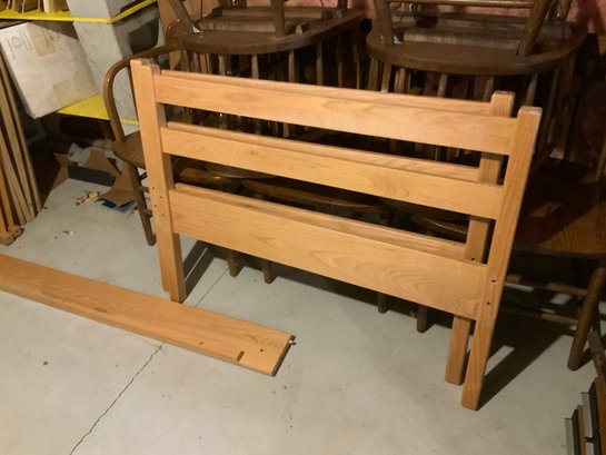 This lot includes 2 twin beds of solid oak. They can be assembled as individual beds or bunked. There is a wooden ladder piece to attach to a lower footboard for access to upper bed when bunked. Head and footboards show normal wear to the finish from use and age but we found no cracks or damage. All wooden parts are present: 4 matched head/footboards, 4 side rails and 6 particle board "bunkie boards". There is one set of 4 long bolts - only enough for one bed but easily matched at any hardware store. We will look for the others. Does not include mattresses unless requested (mattresses are older and were stored in the basement.)