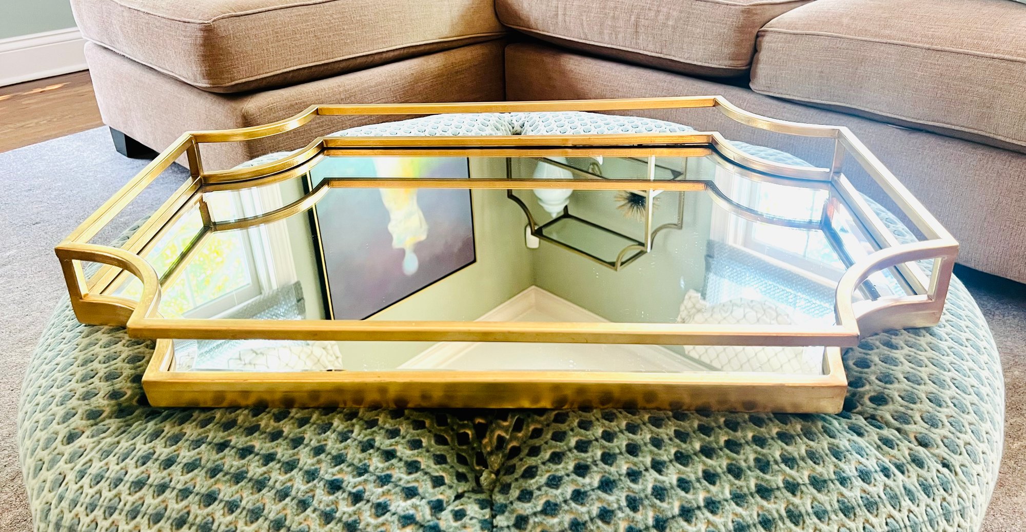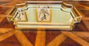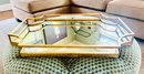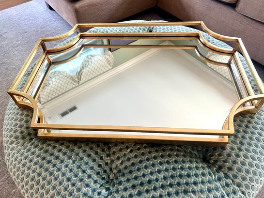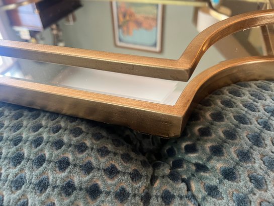 Contemporary beveled mirror with open metal border in a gold finish. Condition is good with lite use. Cocktail hour awaits :). Size 29.5 L x 20.5 D x 3 H