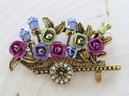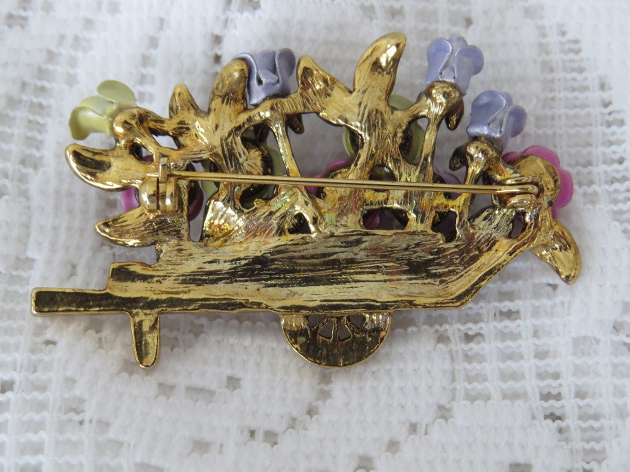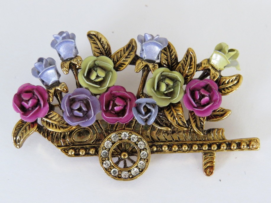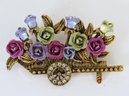 An eye catching gold tone garden cart brooch which features rhinestone wheel, colorful metal roses and a working clasp. Brooch measures 2" long X 1 1/4" high.