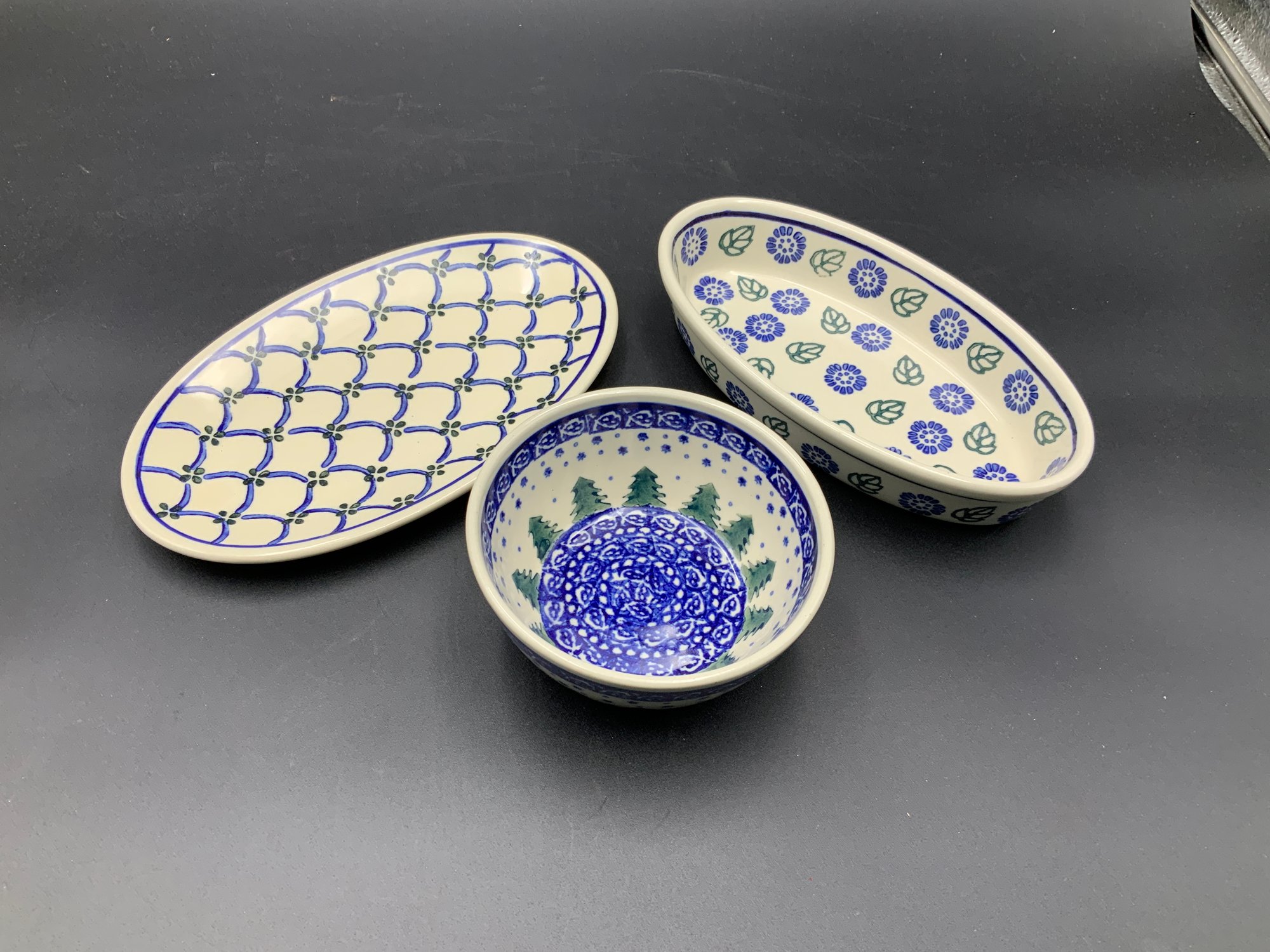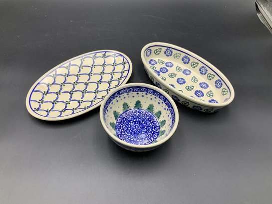 Three pieces of genuine Polish Pottery as shown. All in excellent condition. Each is from a different maker. See photos for details.