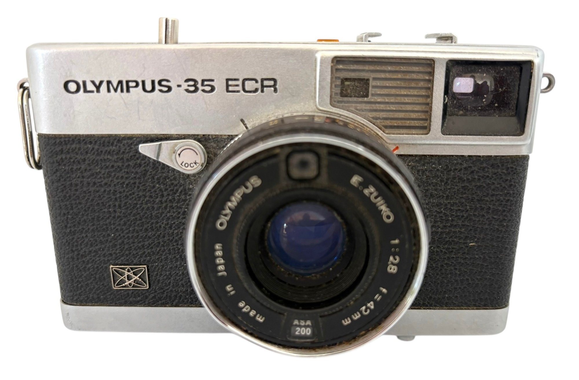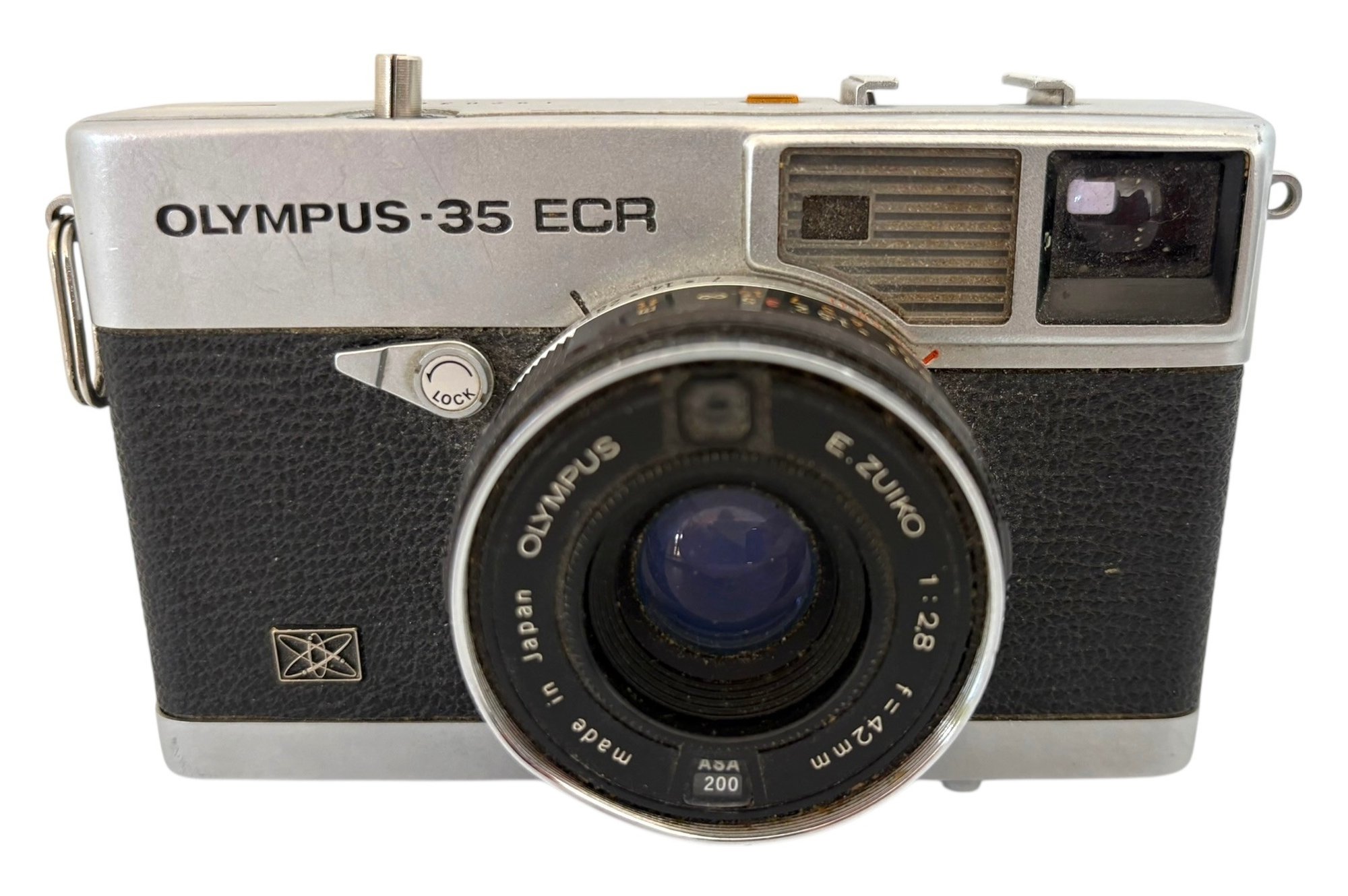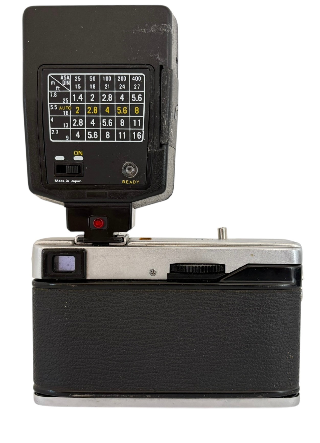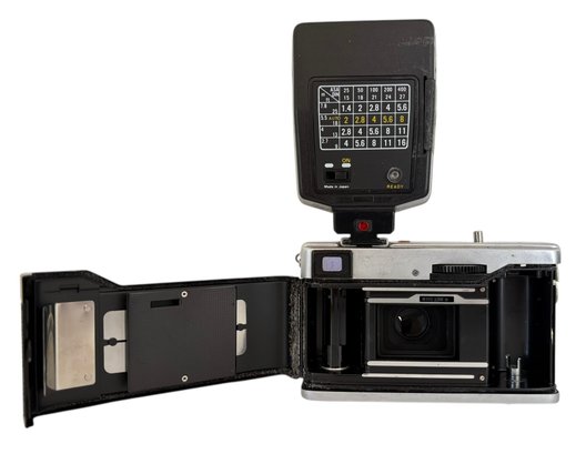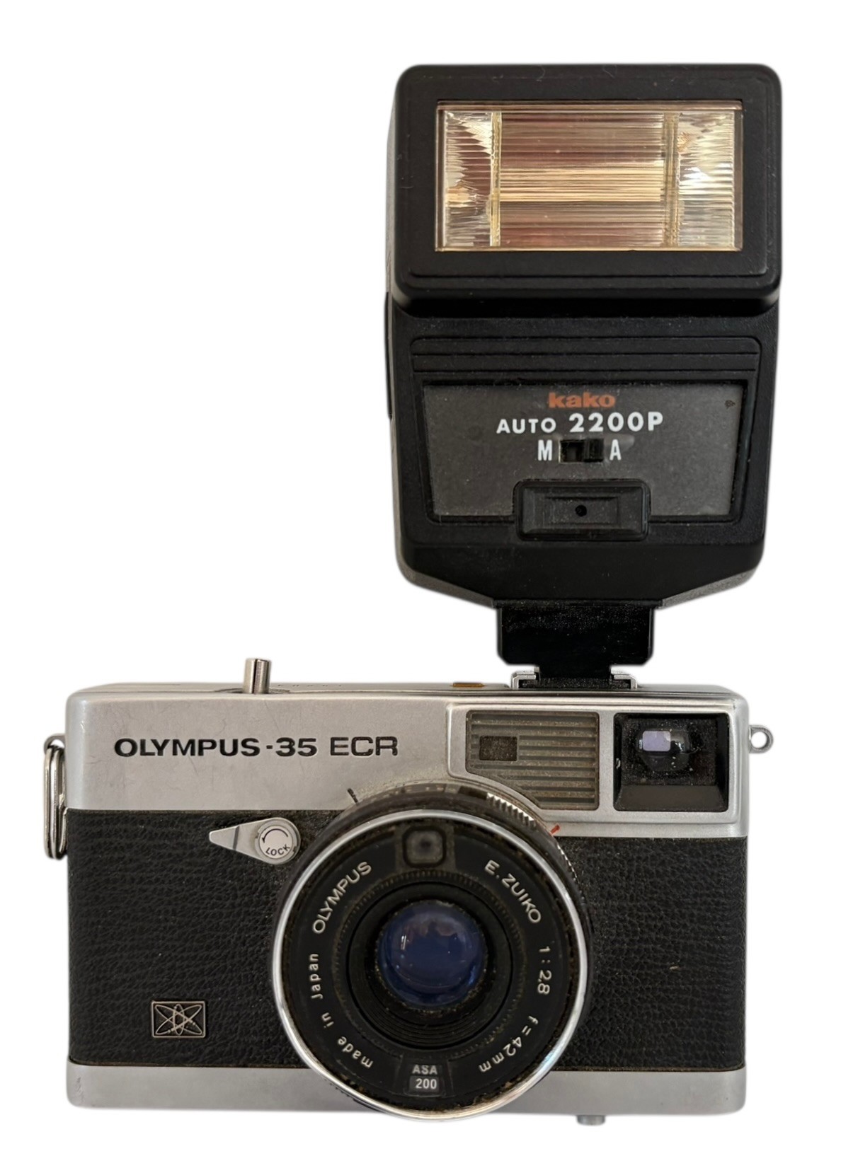 This is a compact rangefinder camera that was produced in the 1970. It features a Zuiko 42mm f/2.8 lens. It has a built in light meter and a self timer. The flash unit is made by Kako model Kako auto 2200 P. It is untested.