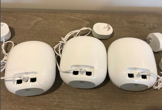 3 Nest Wifi Routers (Model: H2D): These are the high-power, "shiny finish" units. Each features two Ethernet ports on the bottom for hardwired connections to your modem or devices.