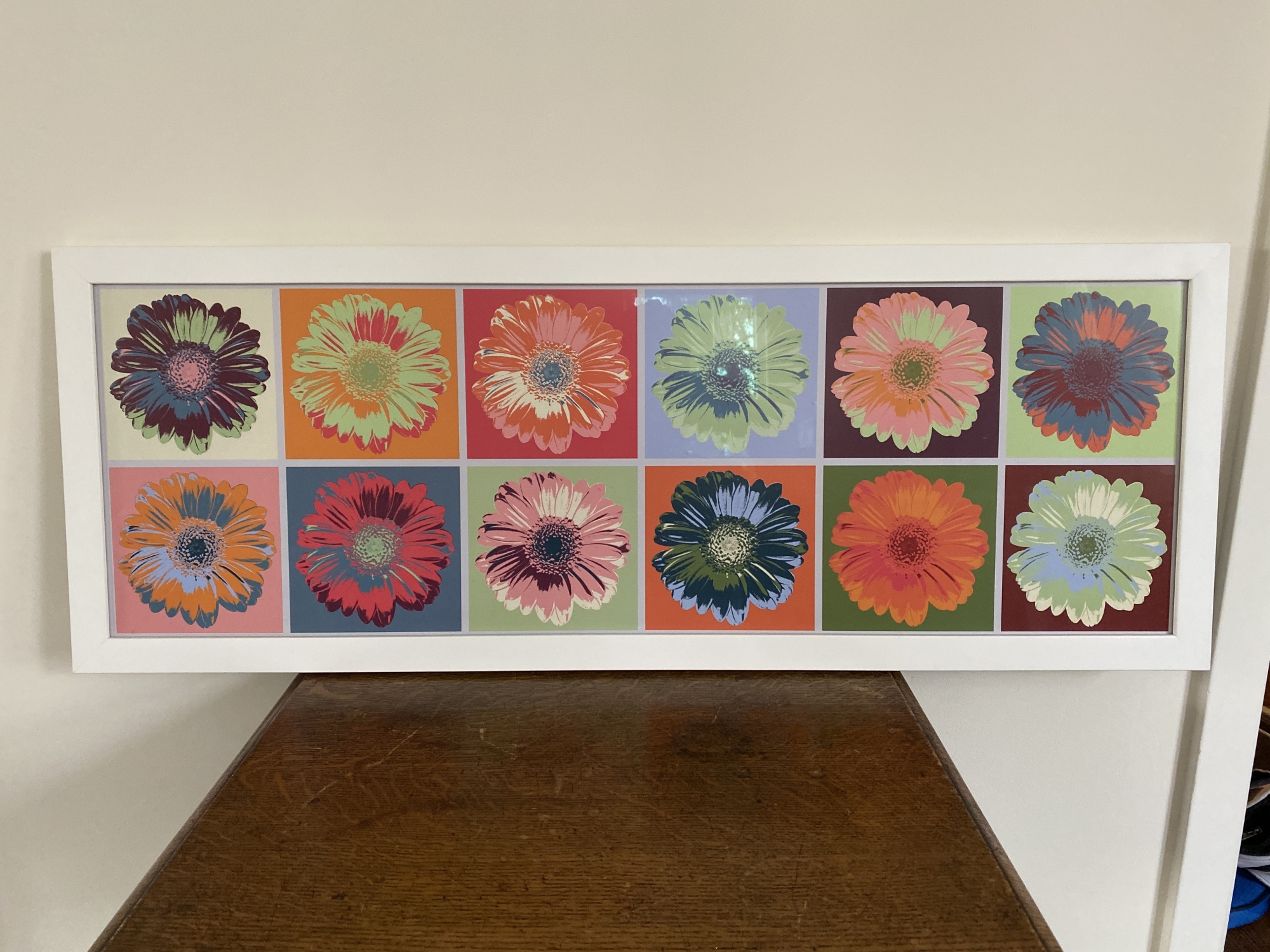 Reminiscent of Warhol. Pop Art flower print framed in white frame by local Frame & Save. Wire hanger at back.