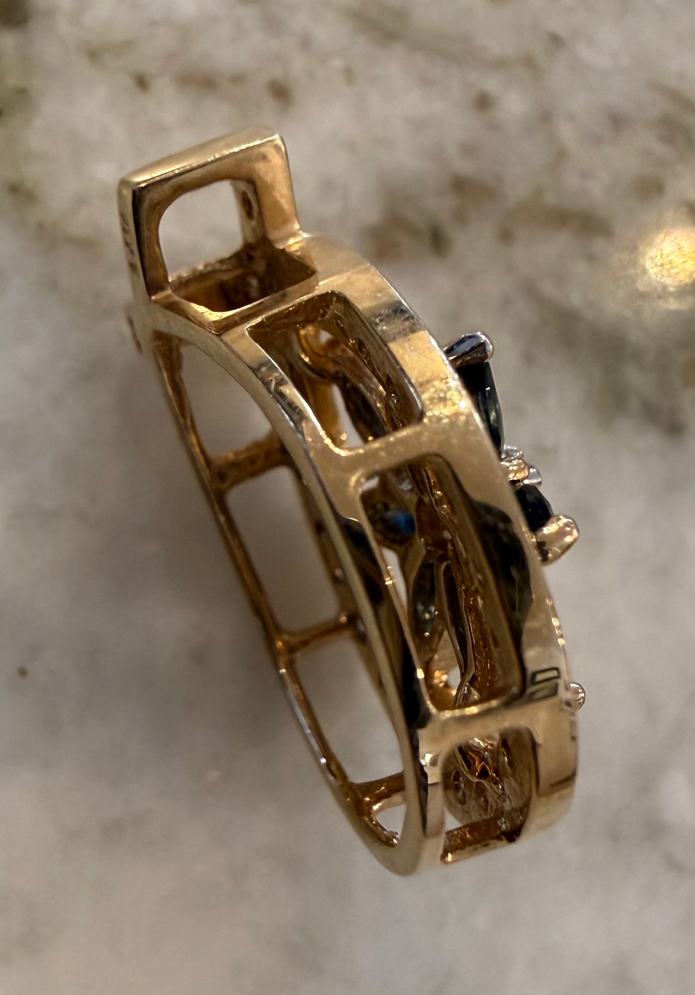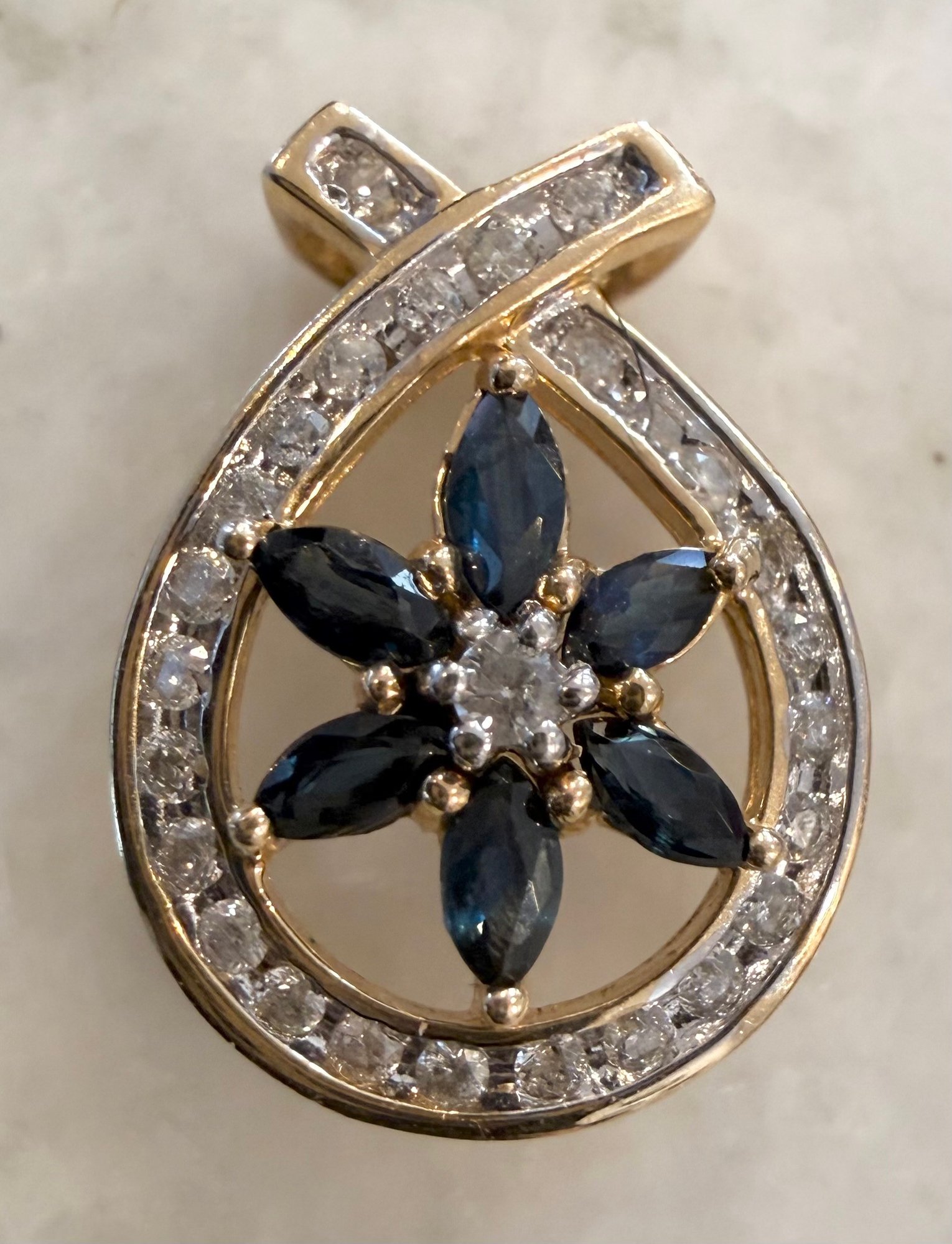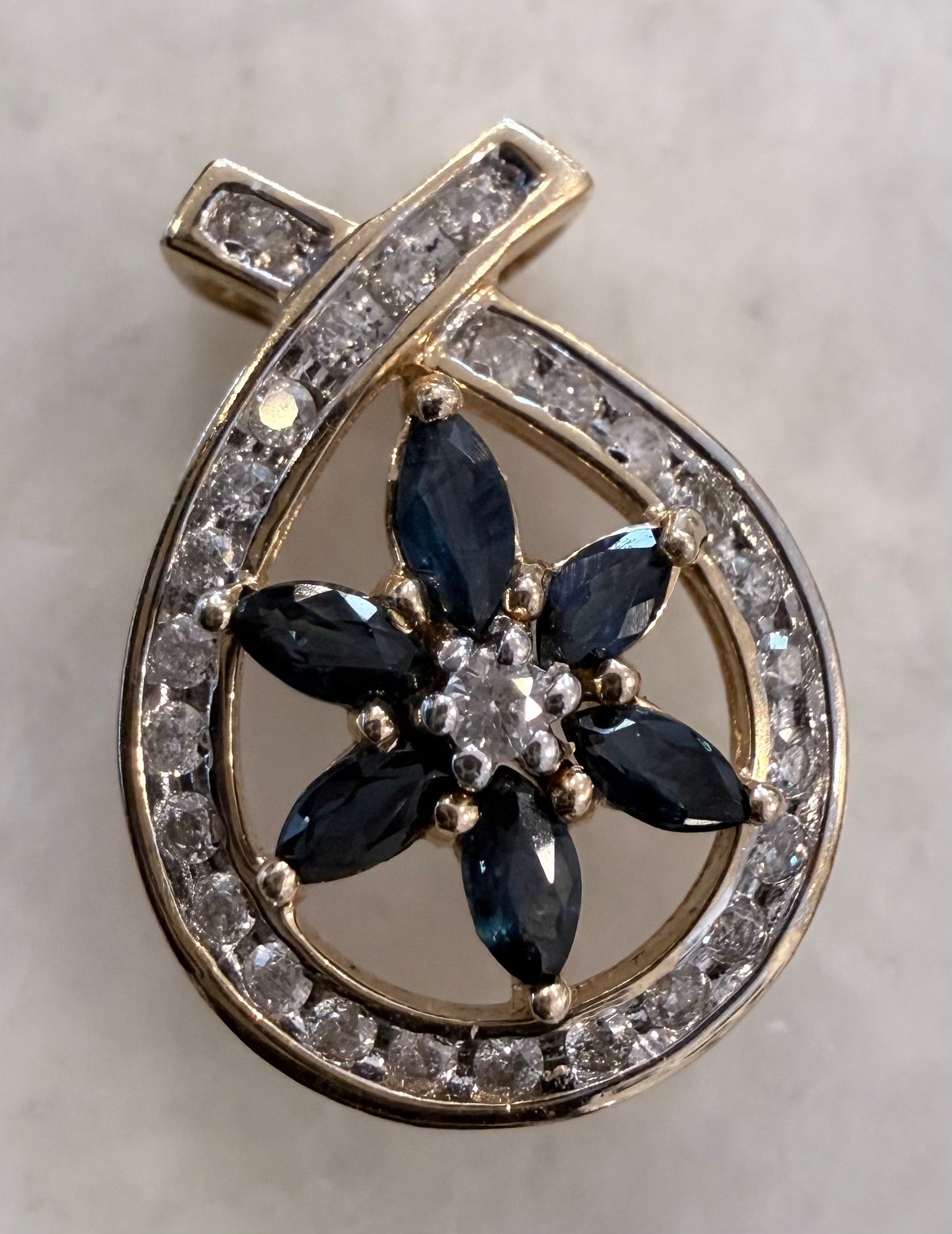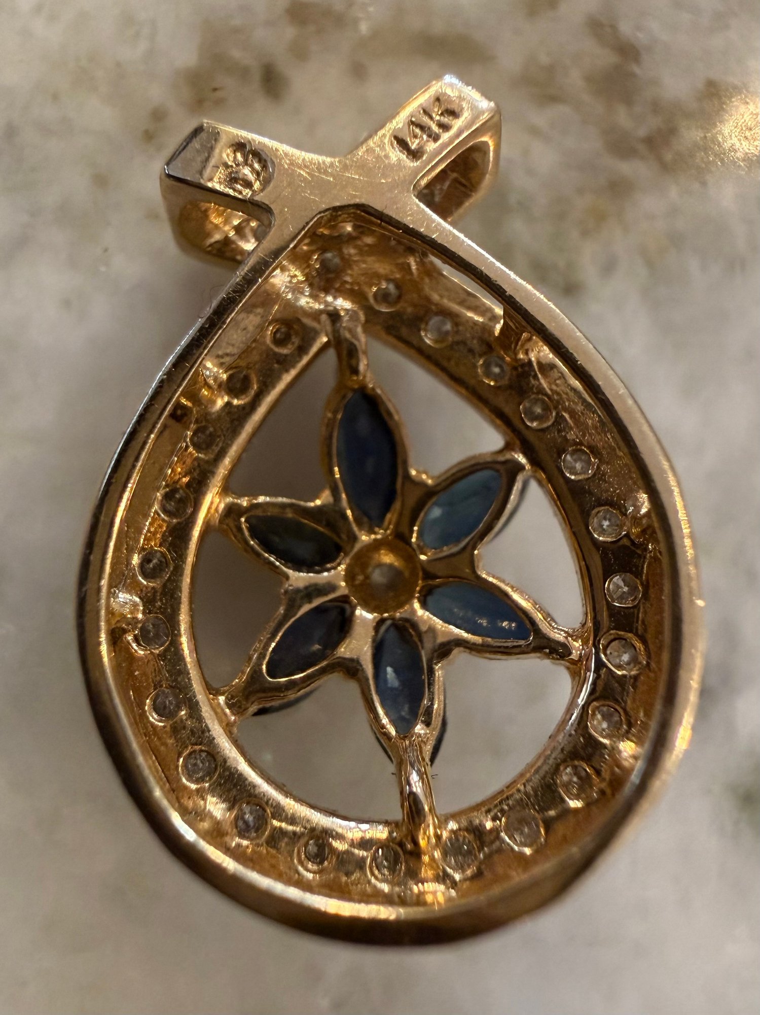 Elegant pendant crafted in 14K gold featuring a floral cluster of marquise-cut blue sapphires surrounding a central diamond, framed by a teardrop shaped halo set with round diamonds. Marked 14K.