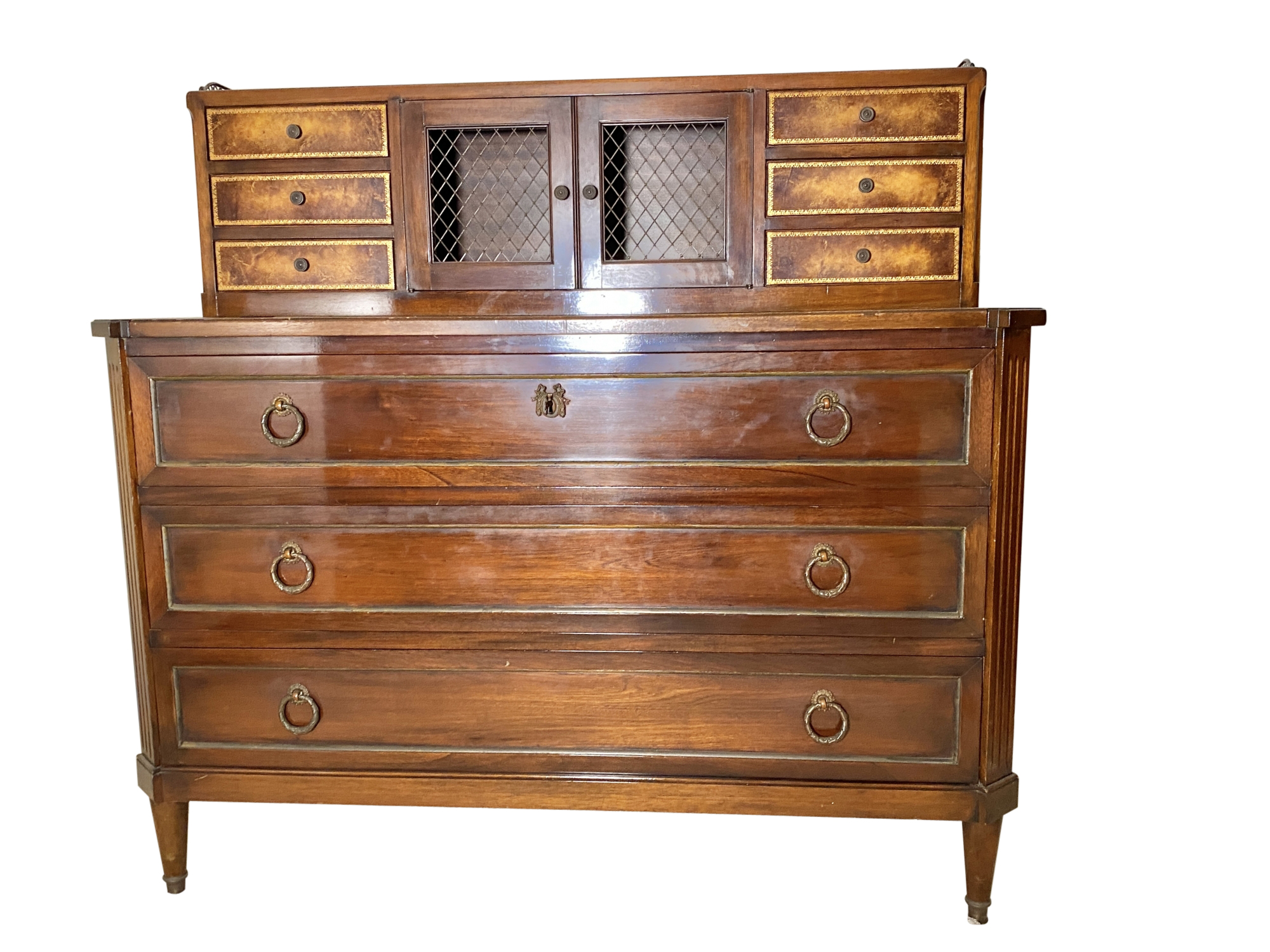 Top provides additional six leather fronted drawers with additional wire grille fronted doors.