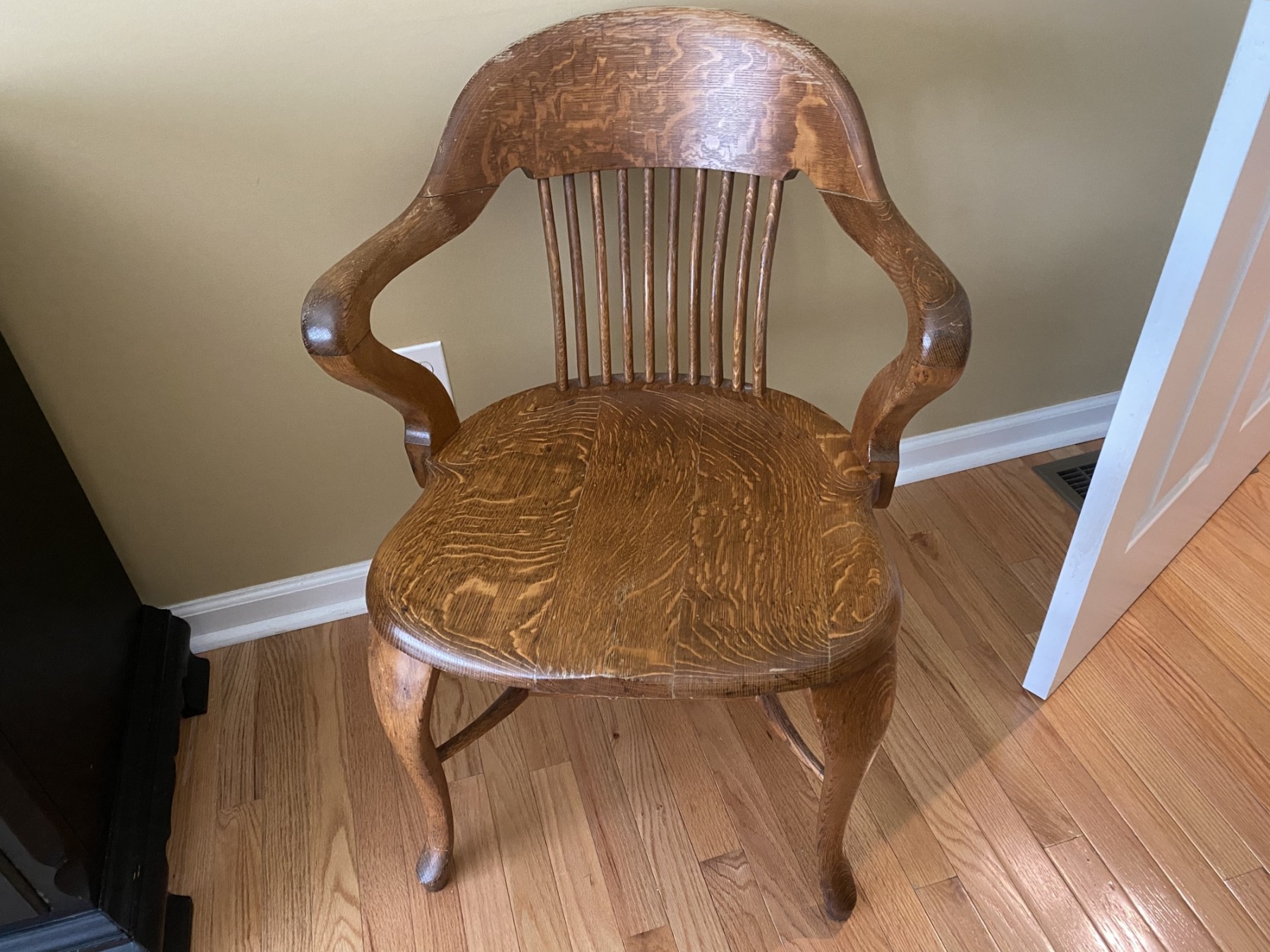The lines on this chair are exquisite. It has a delicate slat back wand beautiful tapered legs. tiger oak