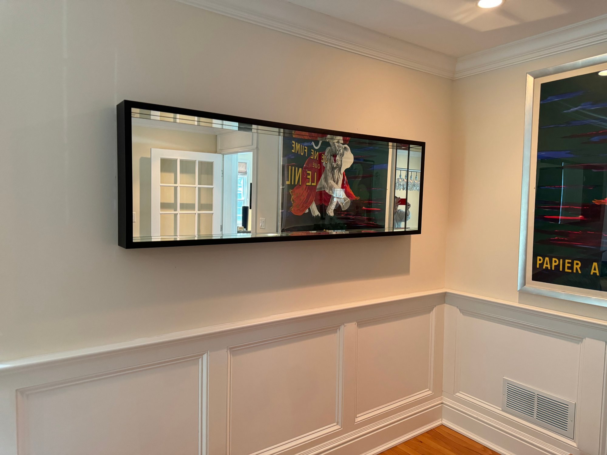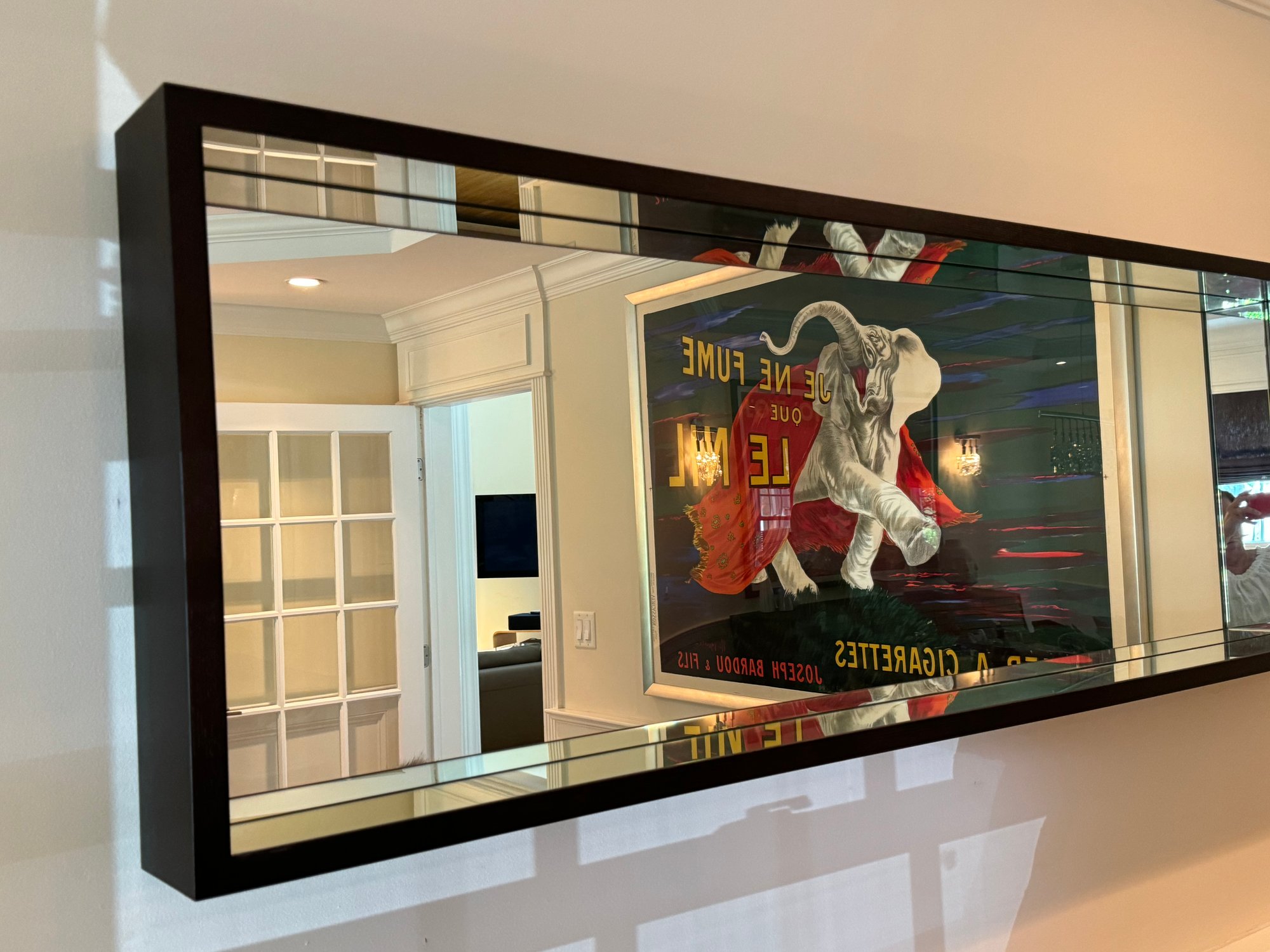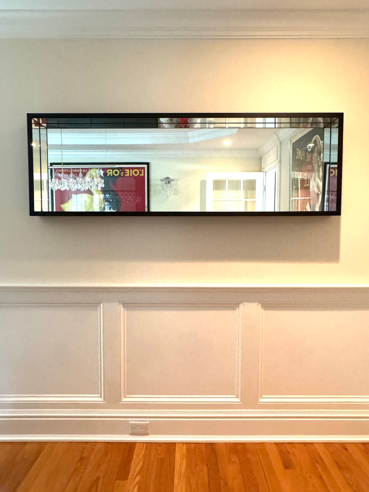 This very beautiful DWR mirror created an allusion of depth with its deep box styling and mirrored interior borders. Deep rich dark wood walnut finish.