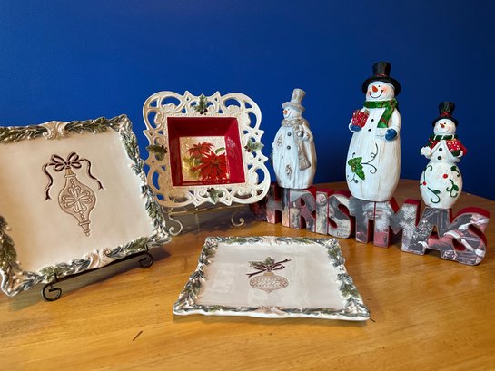 2 ornament plates, 3 snowmen; wood painted Christmas sign.