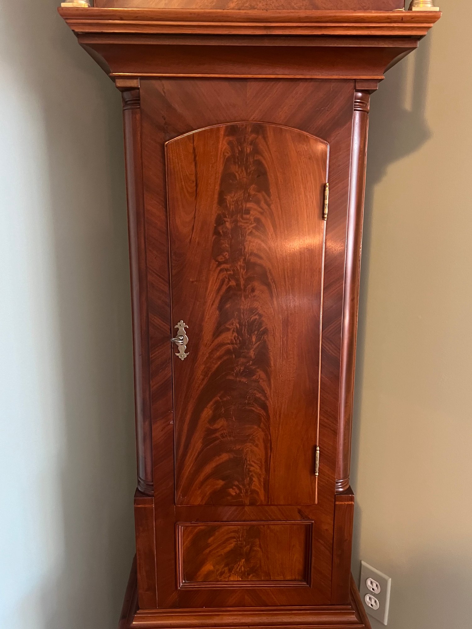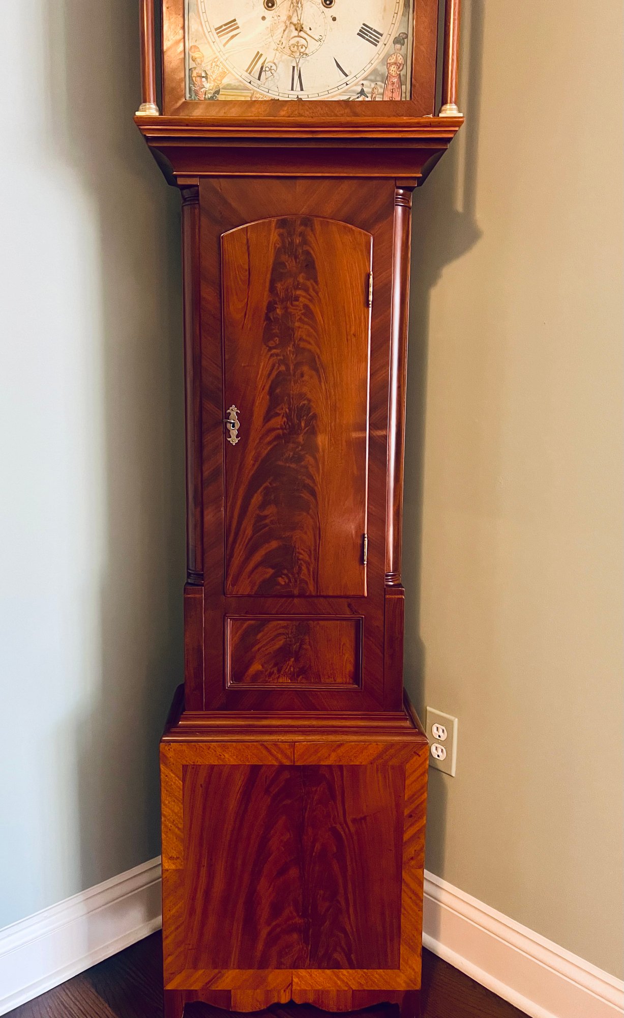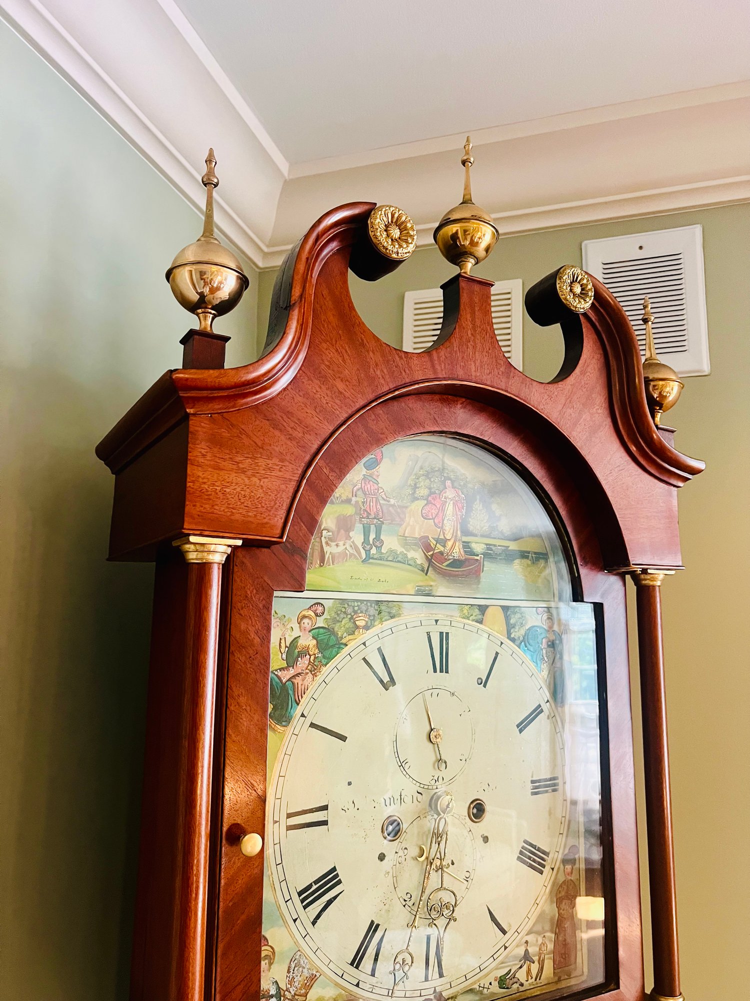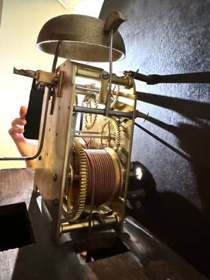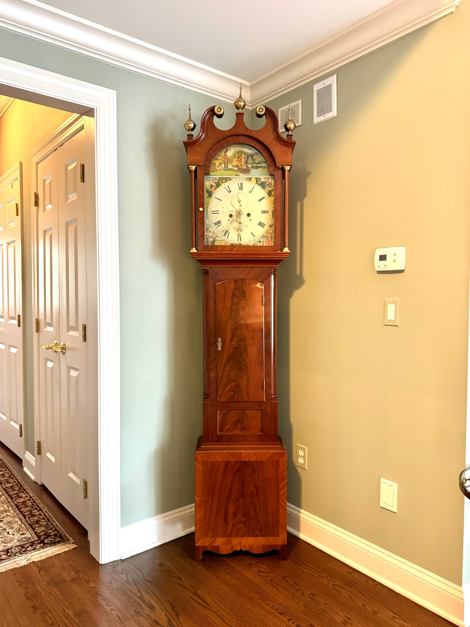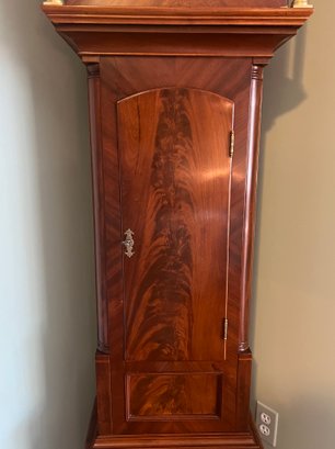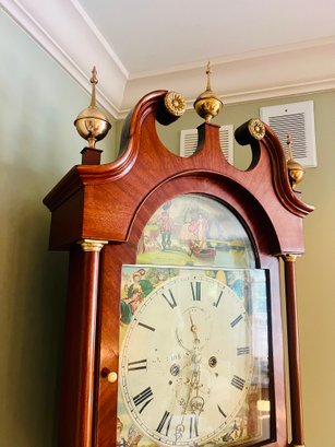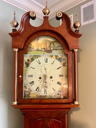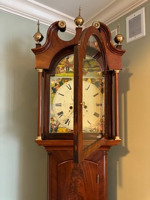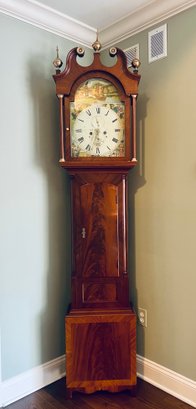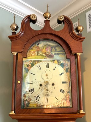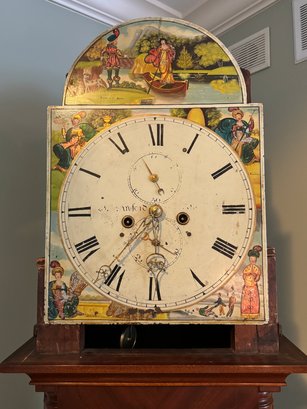 It is a Scottish Tall Case 'Seasonal' with 8 day time and strike movement. With painted original dial - all original except for finish and finials. Signature is on front movement plate - Thompson/Darlington (James 1170-1825, Samuel (son) 1825-34) Face is metal