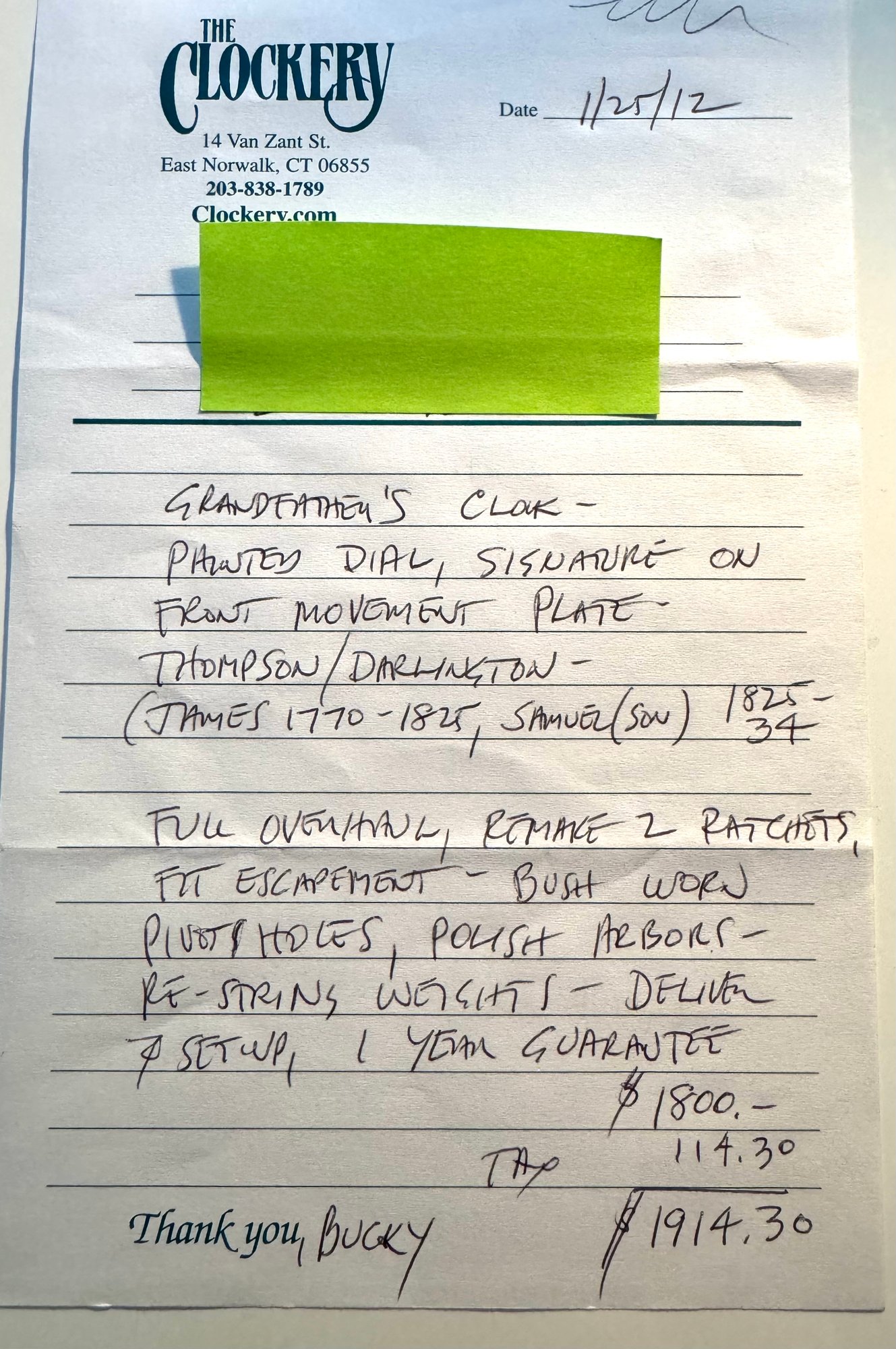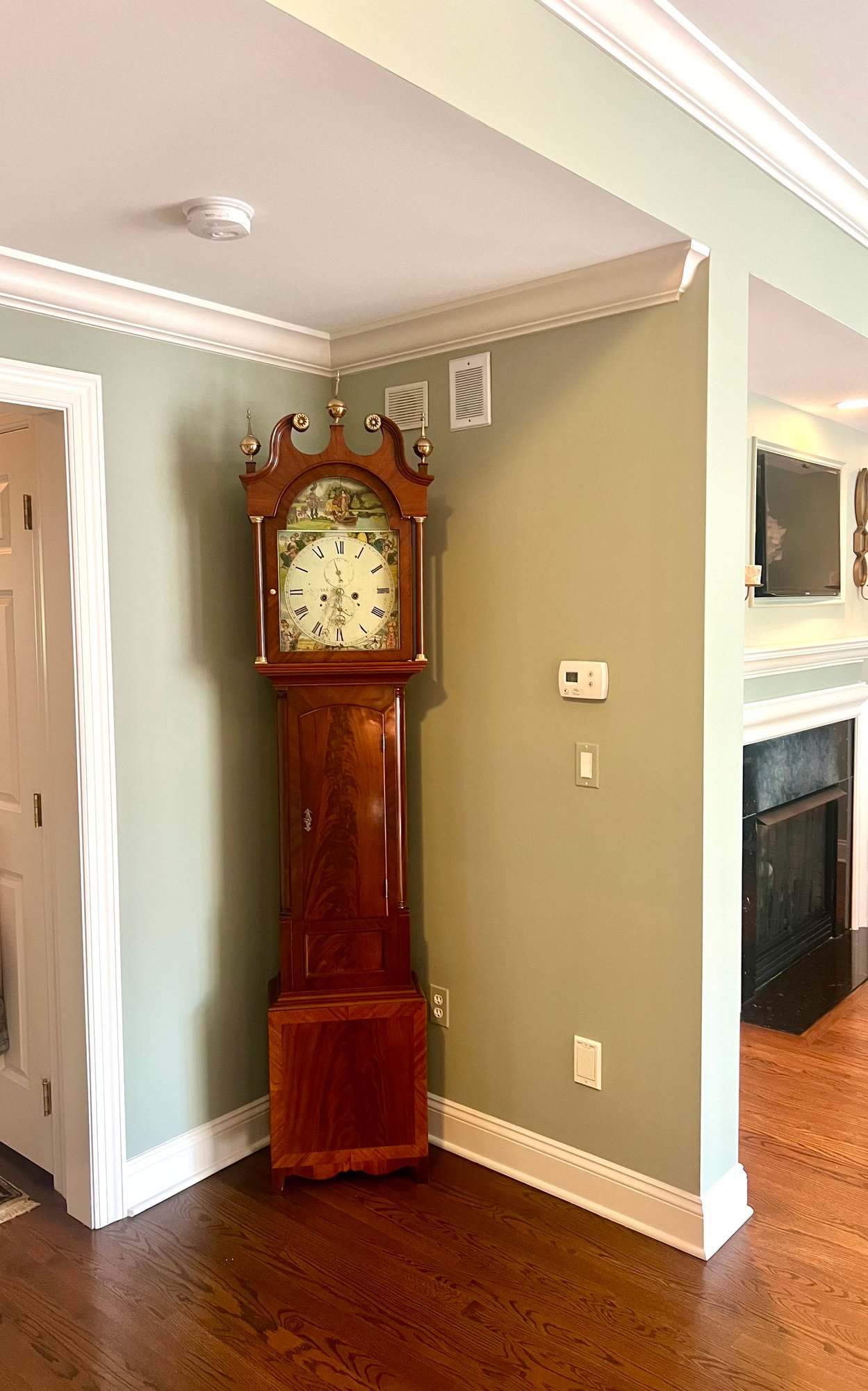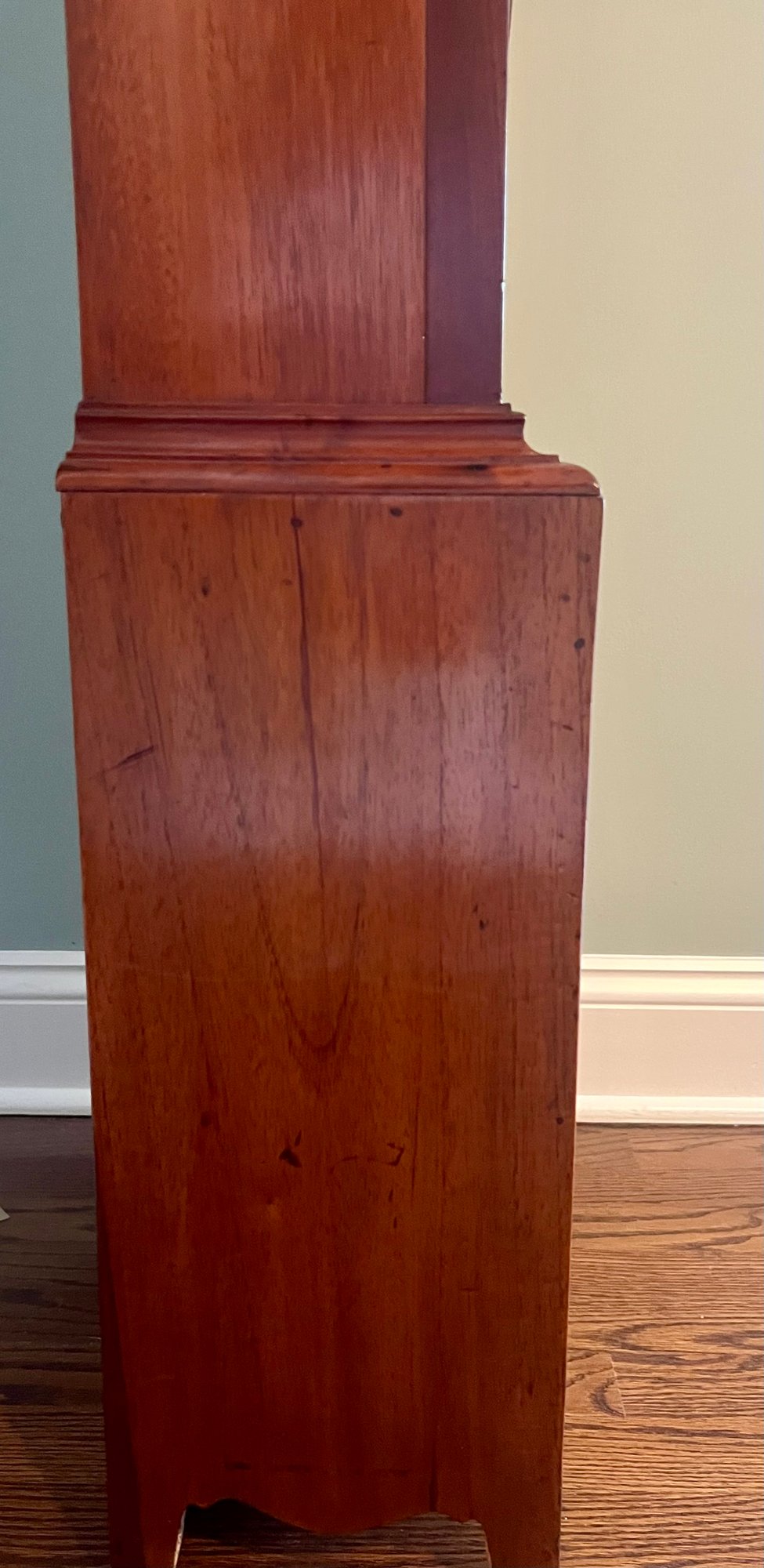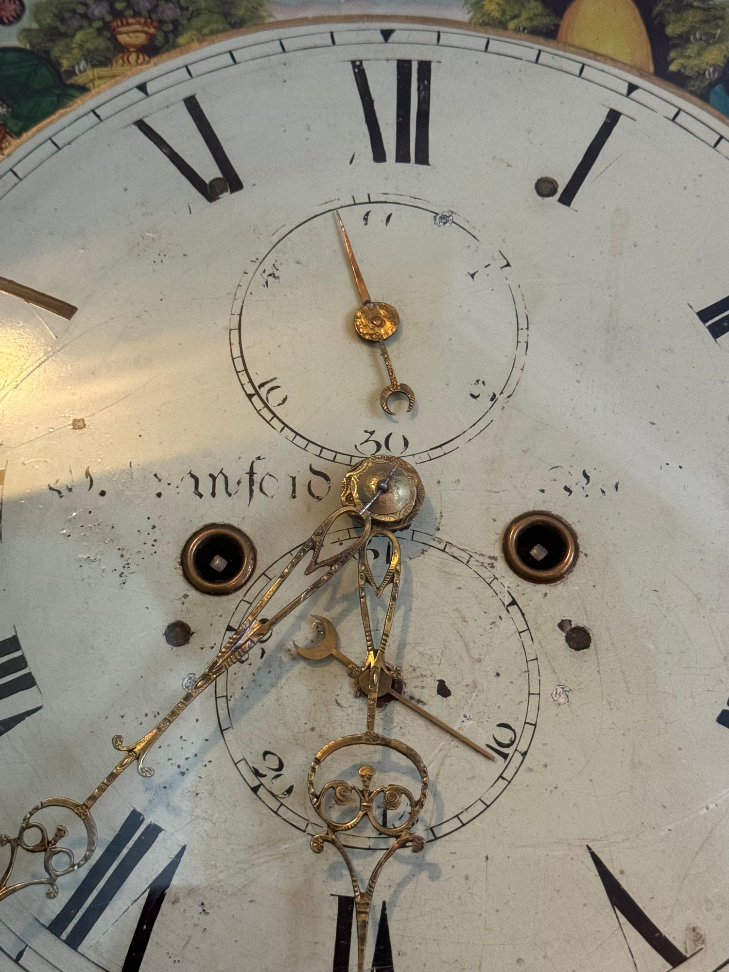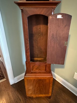 It is a Scottish Tall Case 'Seasonal' with 8 day time and strike movement. With painted original dial - all original except for finish and finials. Signature is on front movement plate - Thompson/Darlington (James 1170-1825, Samuel (son) 1825-34) Face is metal