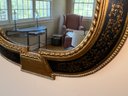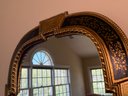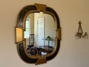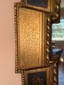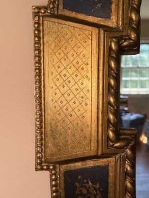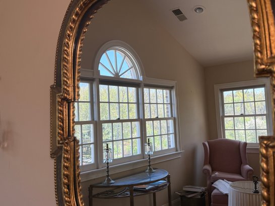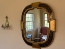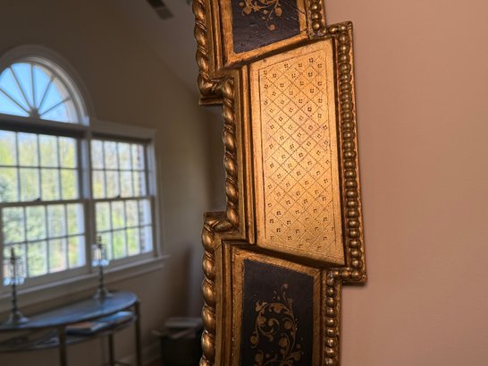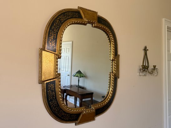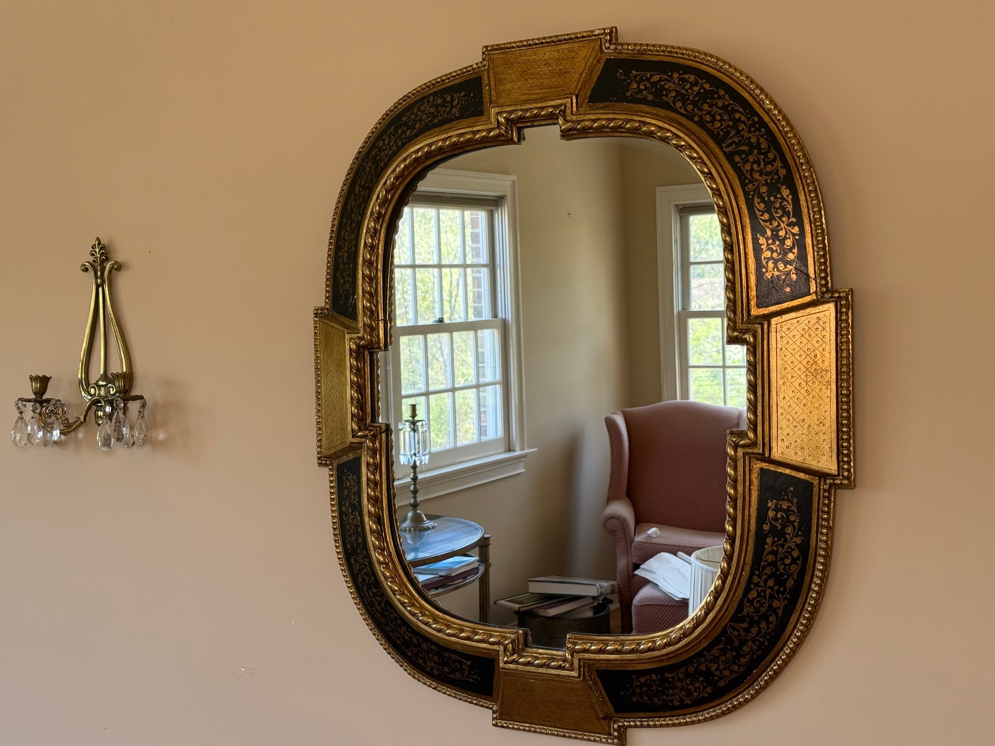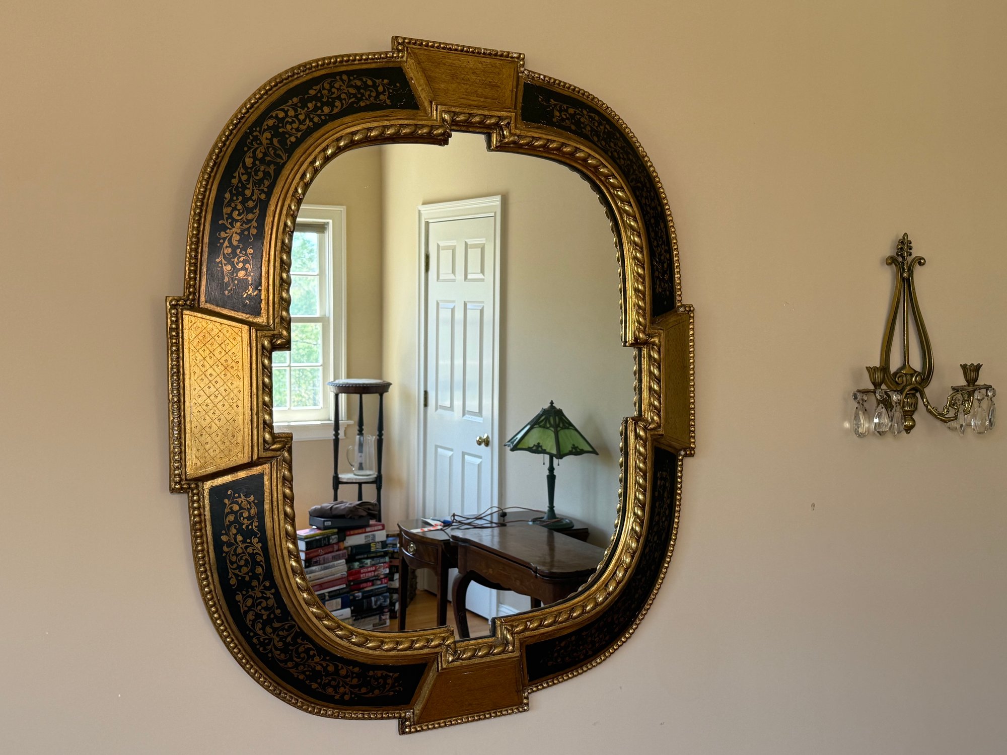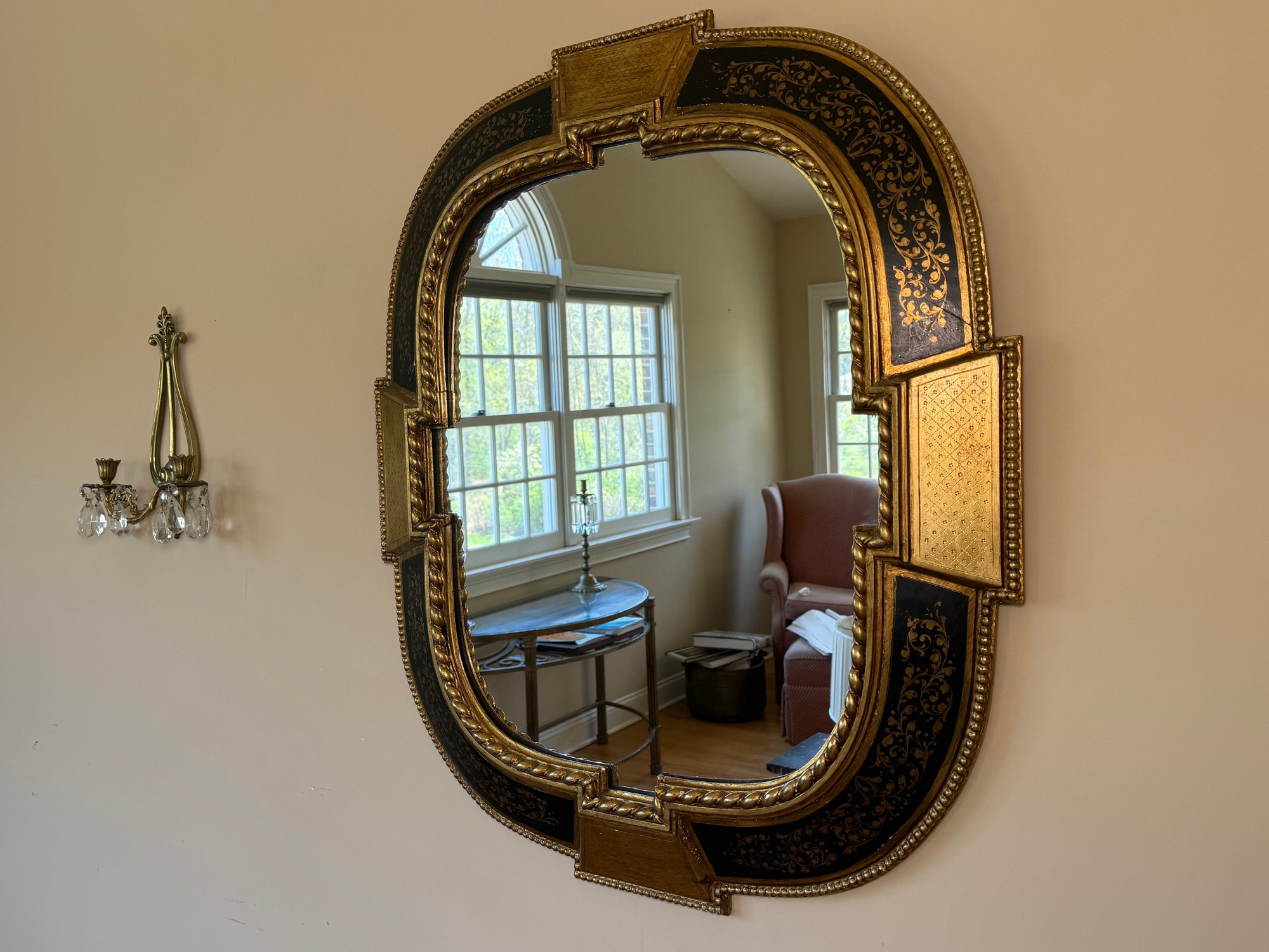 This mirror is heavy weighted and quality made with pretty gold detail throughout. It pops against the black background.