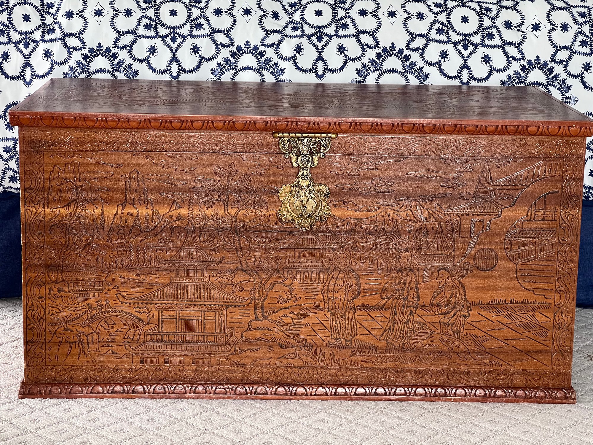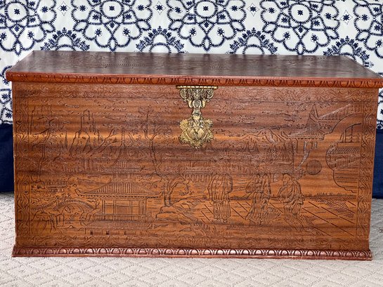 A lovely reproduction, designed after the 19th Century trunks or chests used for transporting tea, silks and dry goods to Europe and America from China. It has a scenic montage covering the exterior and ornate brass findings. Small scuffs and scratches throughout.