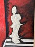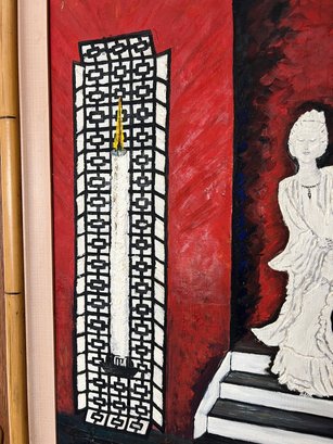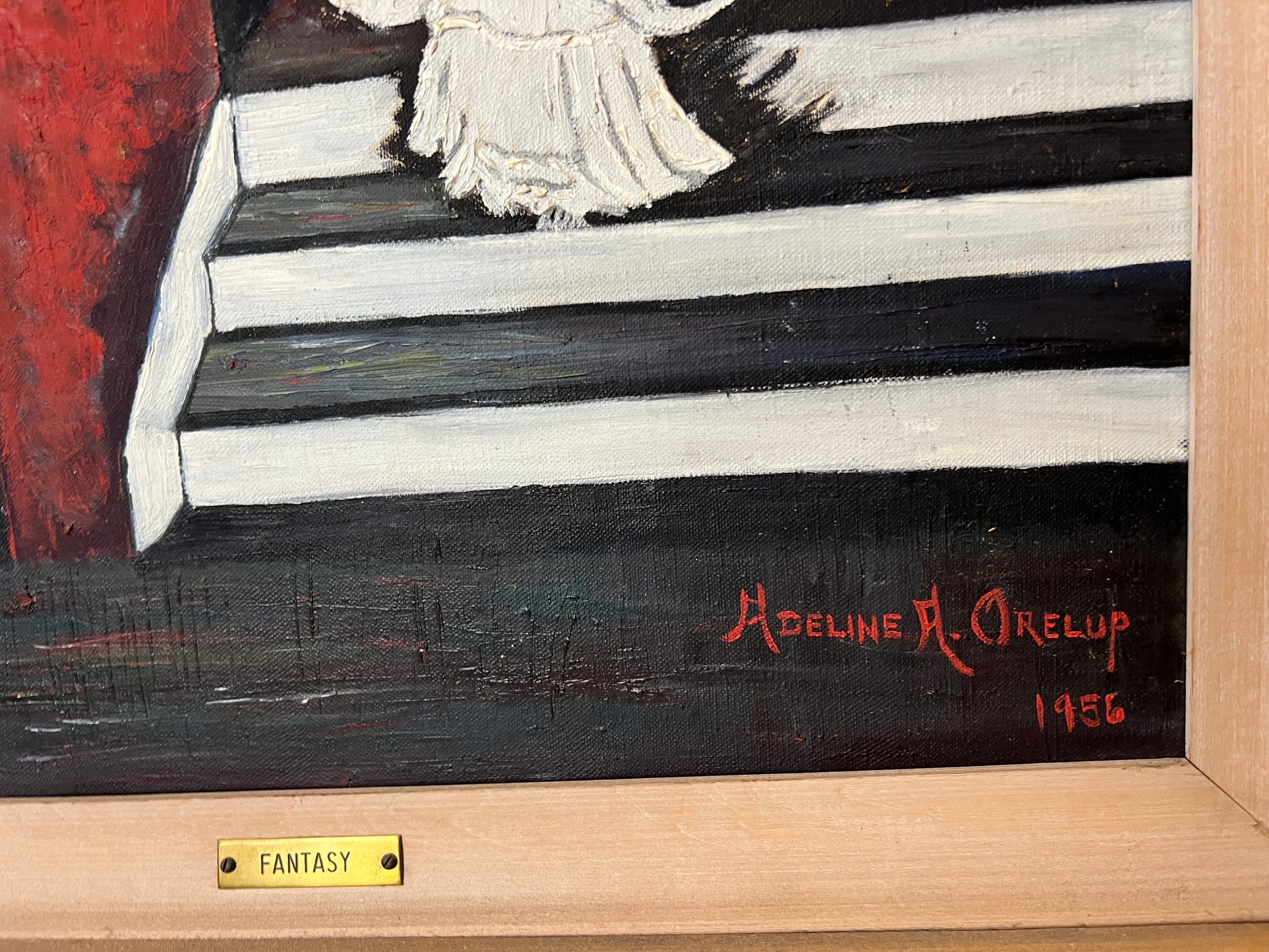 Original 1956 painting by a local artist Adeline Orelup, signed and dated in the lower right in a bamboo type frame with a brass title plaque.