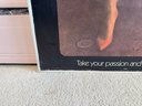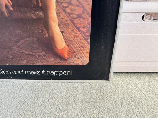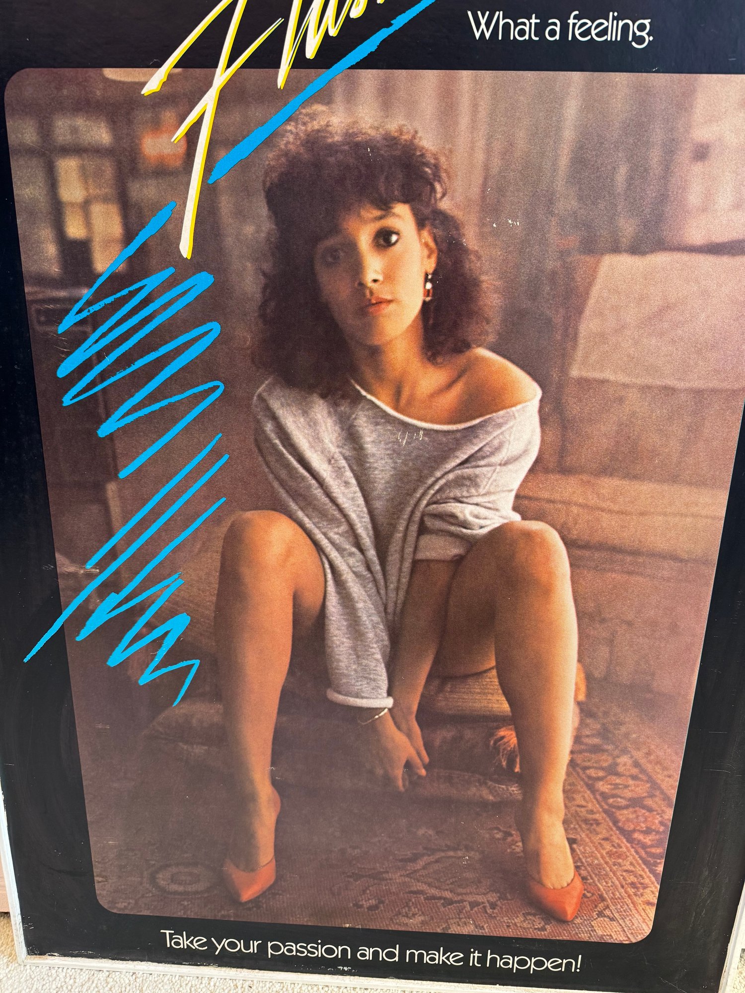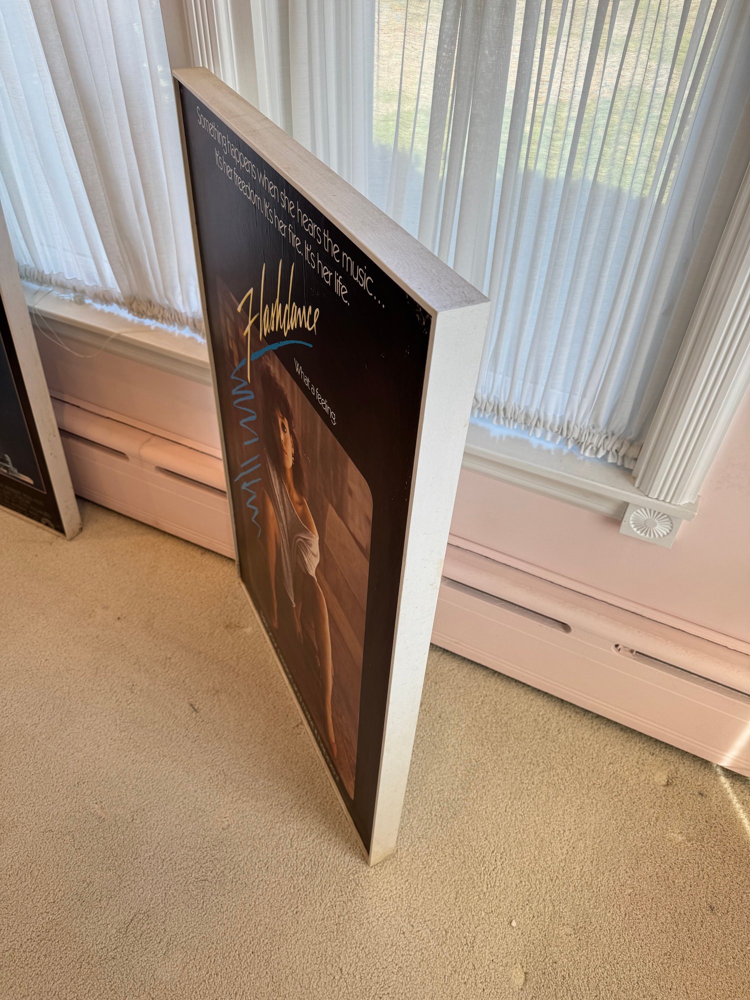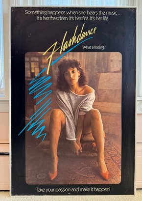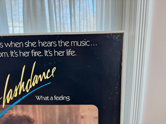 This piece was taken from the Stratford movie theater when the movie flashdance was playing. It appears to be printed on a thick board material, framed in wood and shows a few signs of storage wear/ some creasing. It measures approximately 24.5” wide and 36.5” tall.