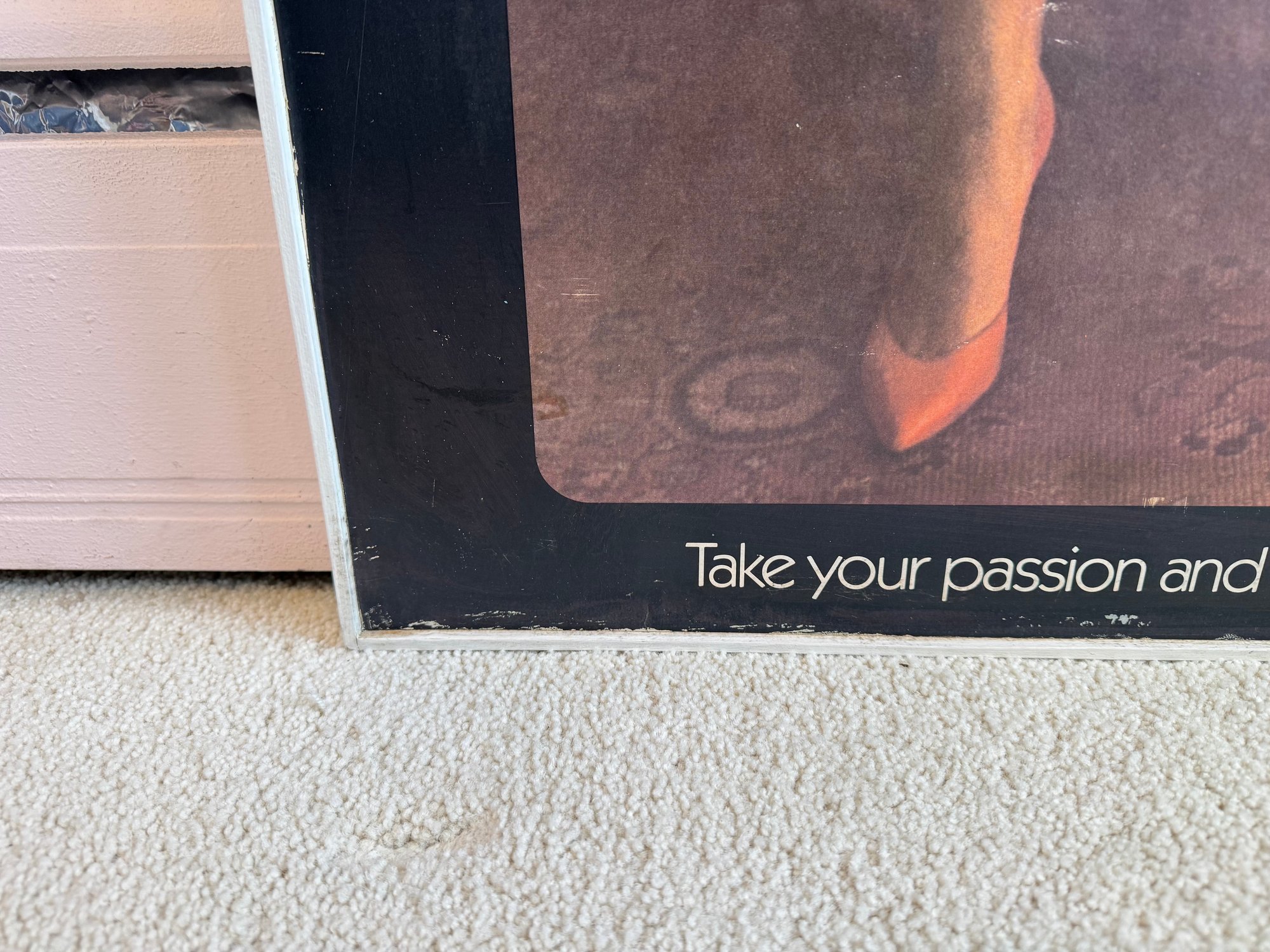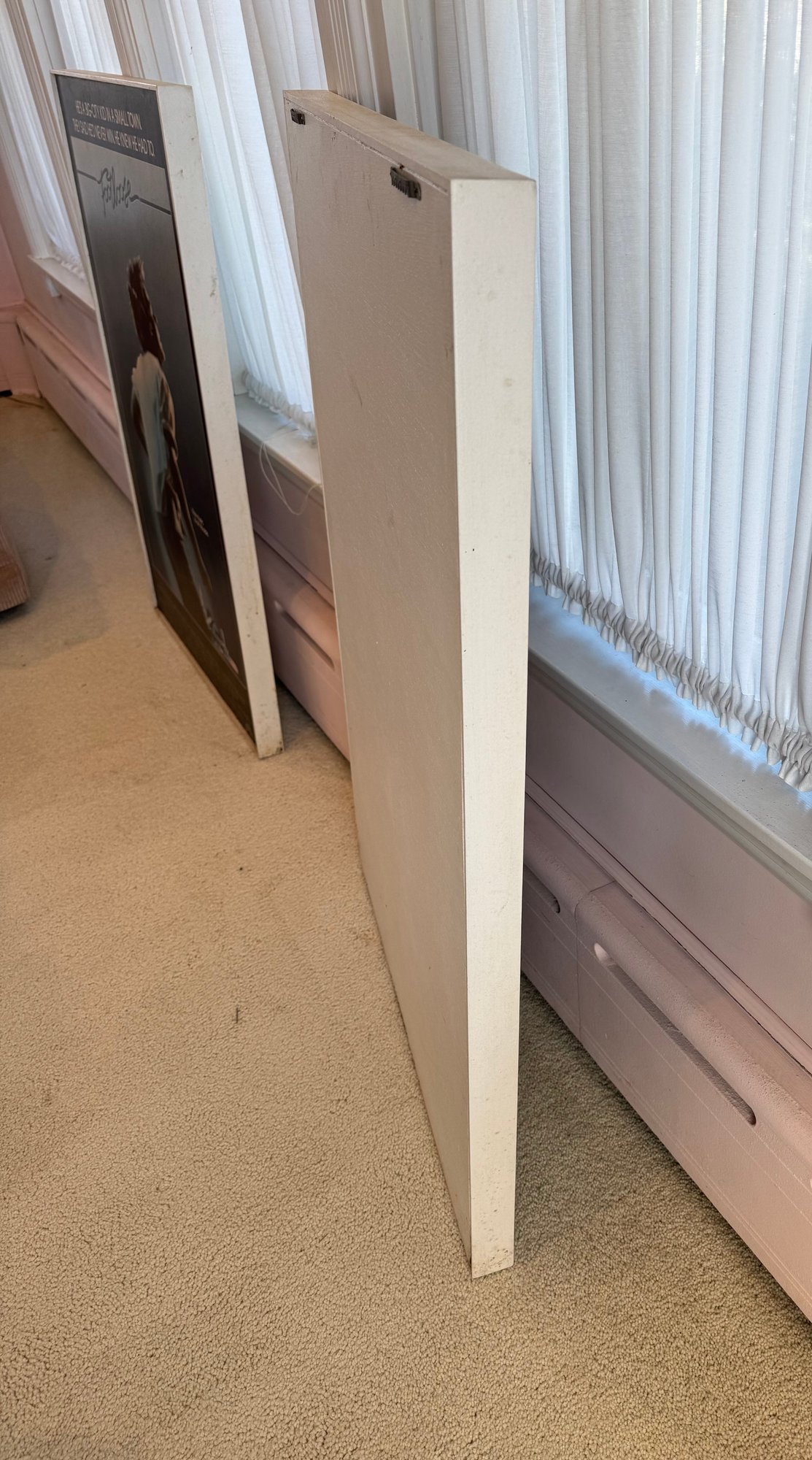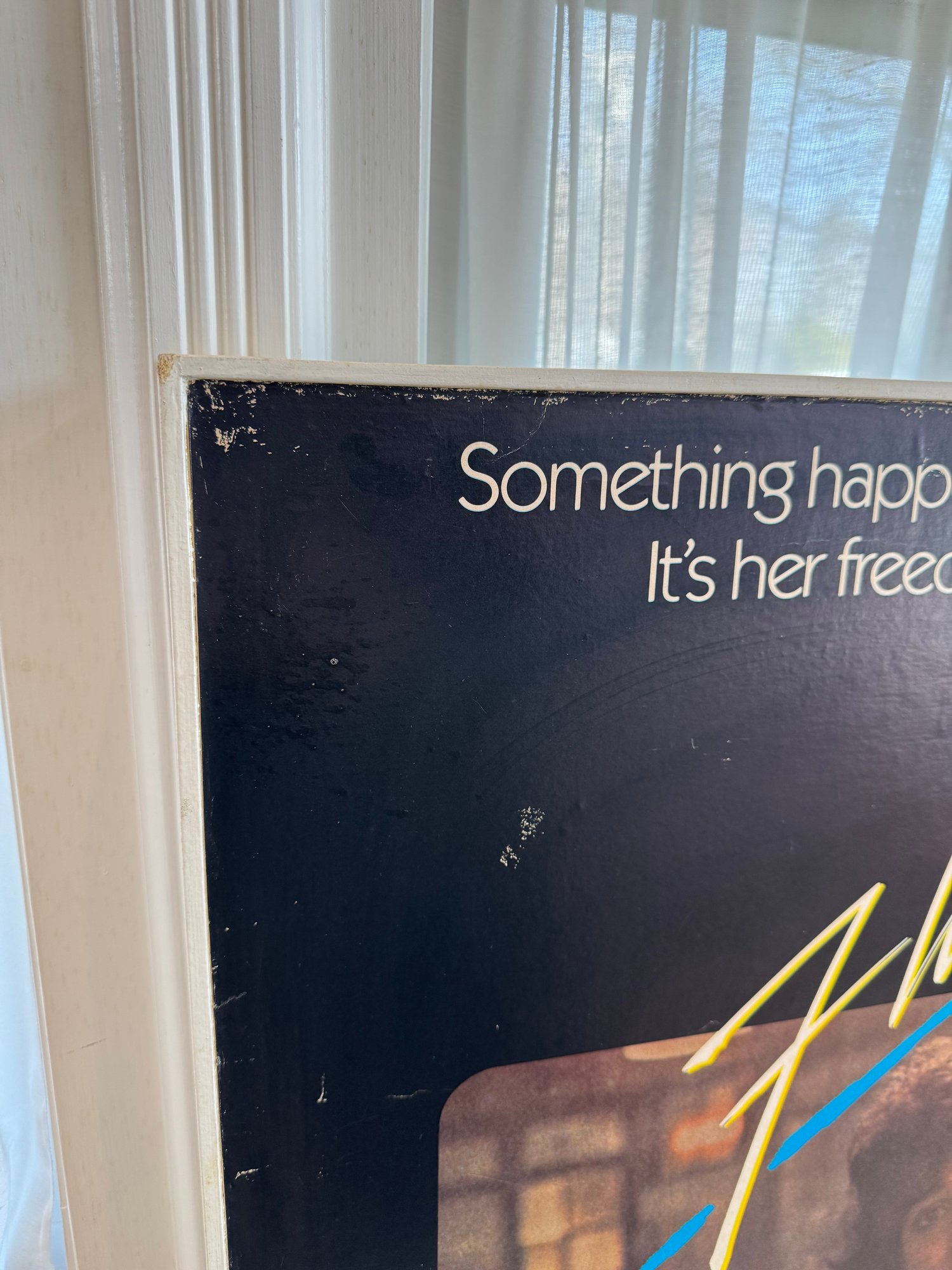 This piece was taken from the Stratford movie theater when the movie flashdance was playing. It appears to be printed on a thick board material, framed in wood and shows a few signs of storage wear/ some creasing. It measures approximately 24.5” wide and 36.5” tall.
