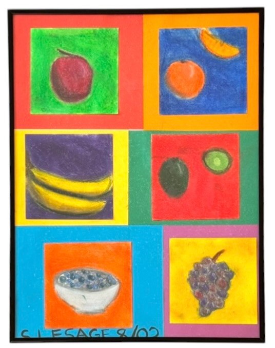 Signed S. Lesage, 8/02. Vibrant colors to these individual six pieces that are framed together on colored paper. The measurements below are of the entire framed piece.