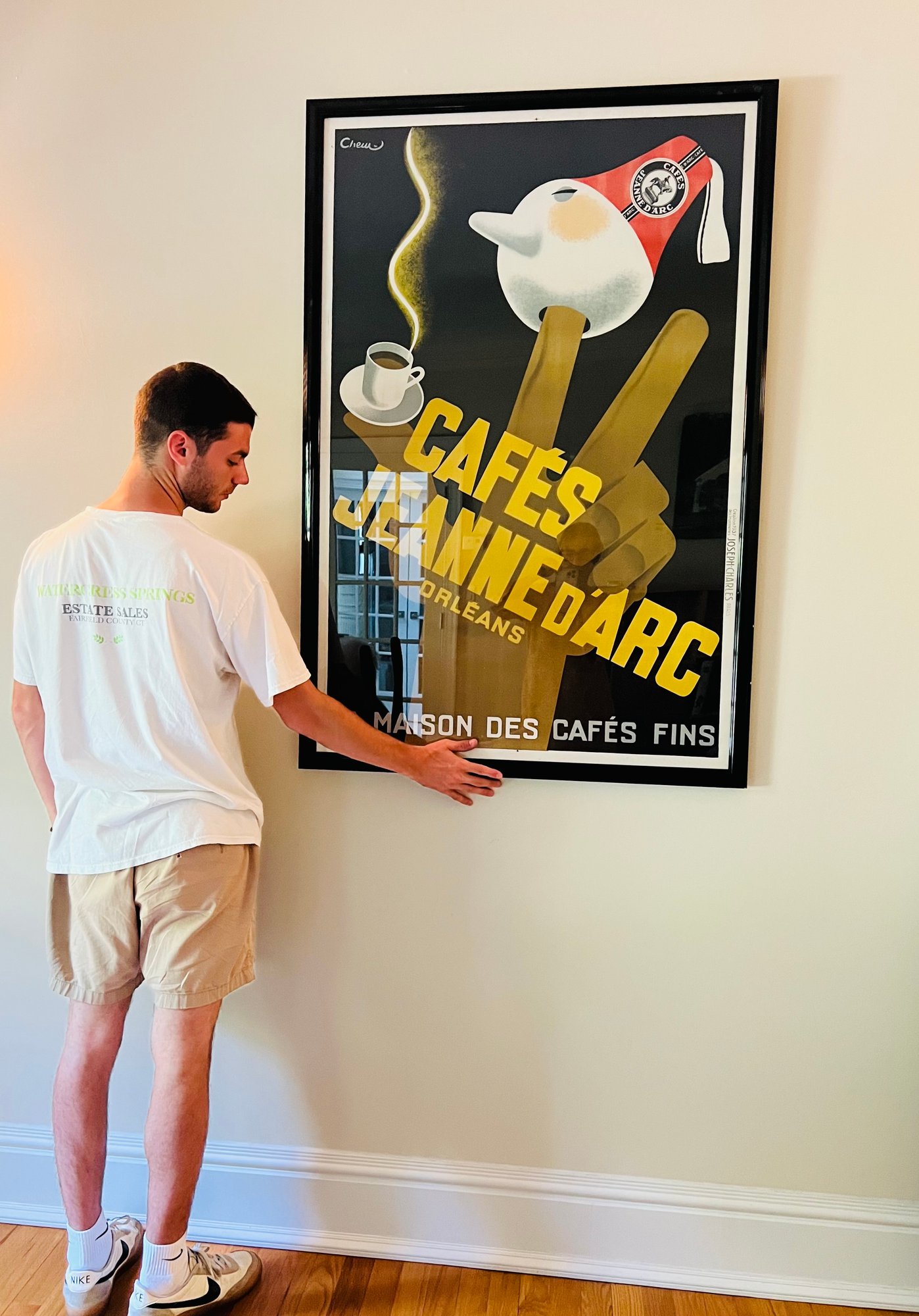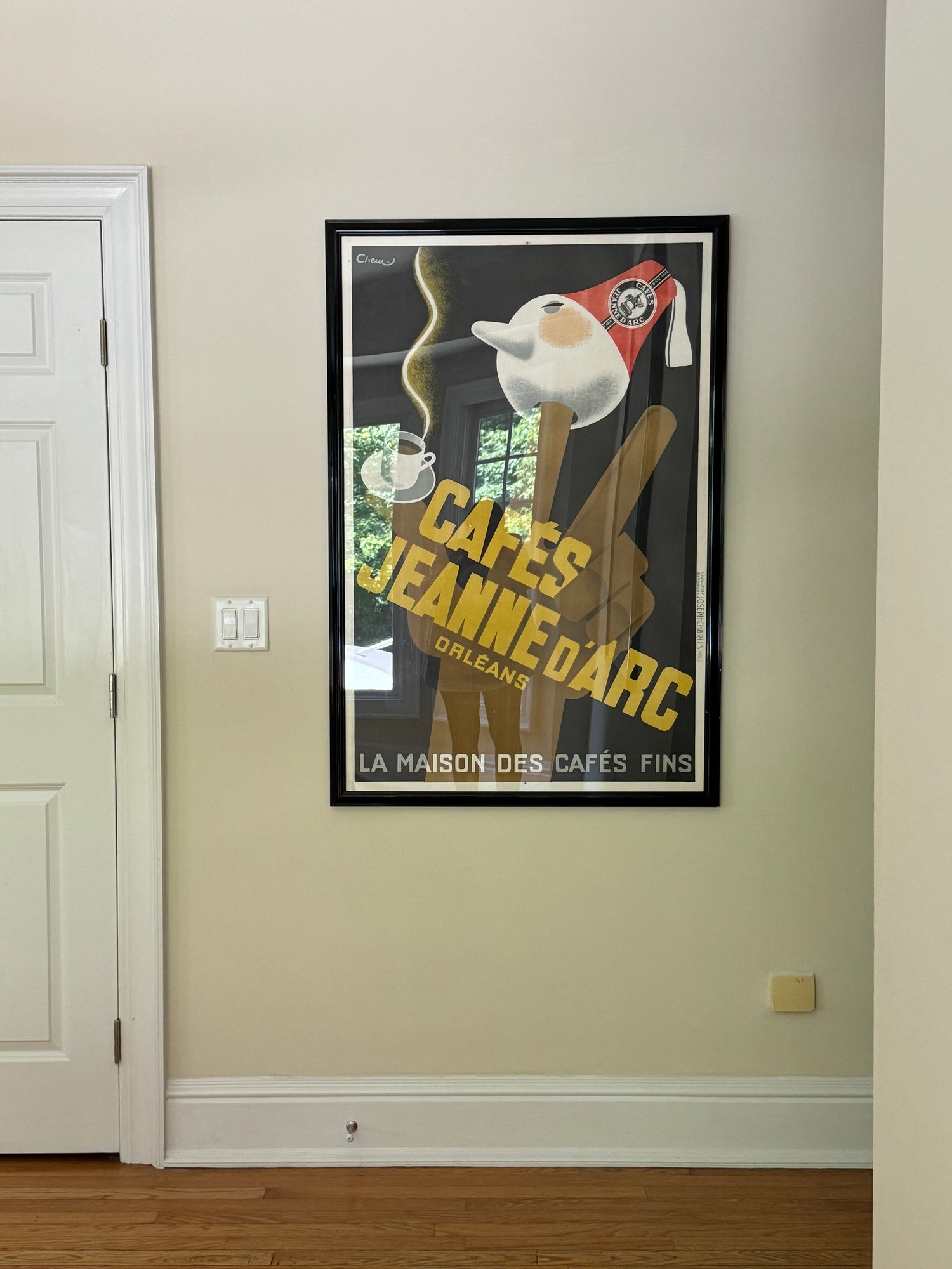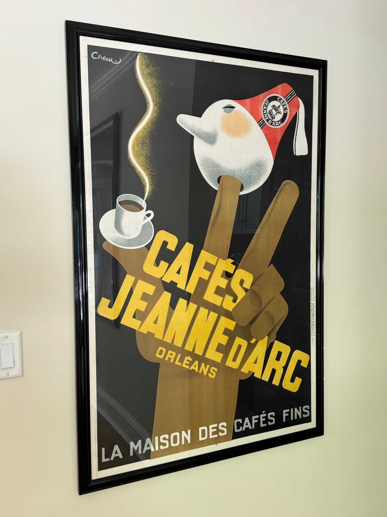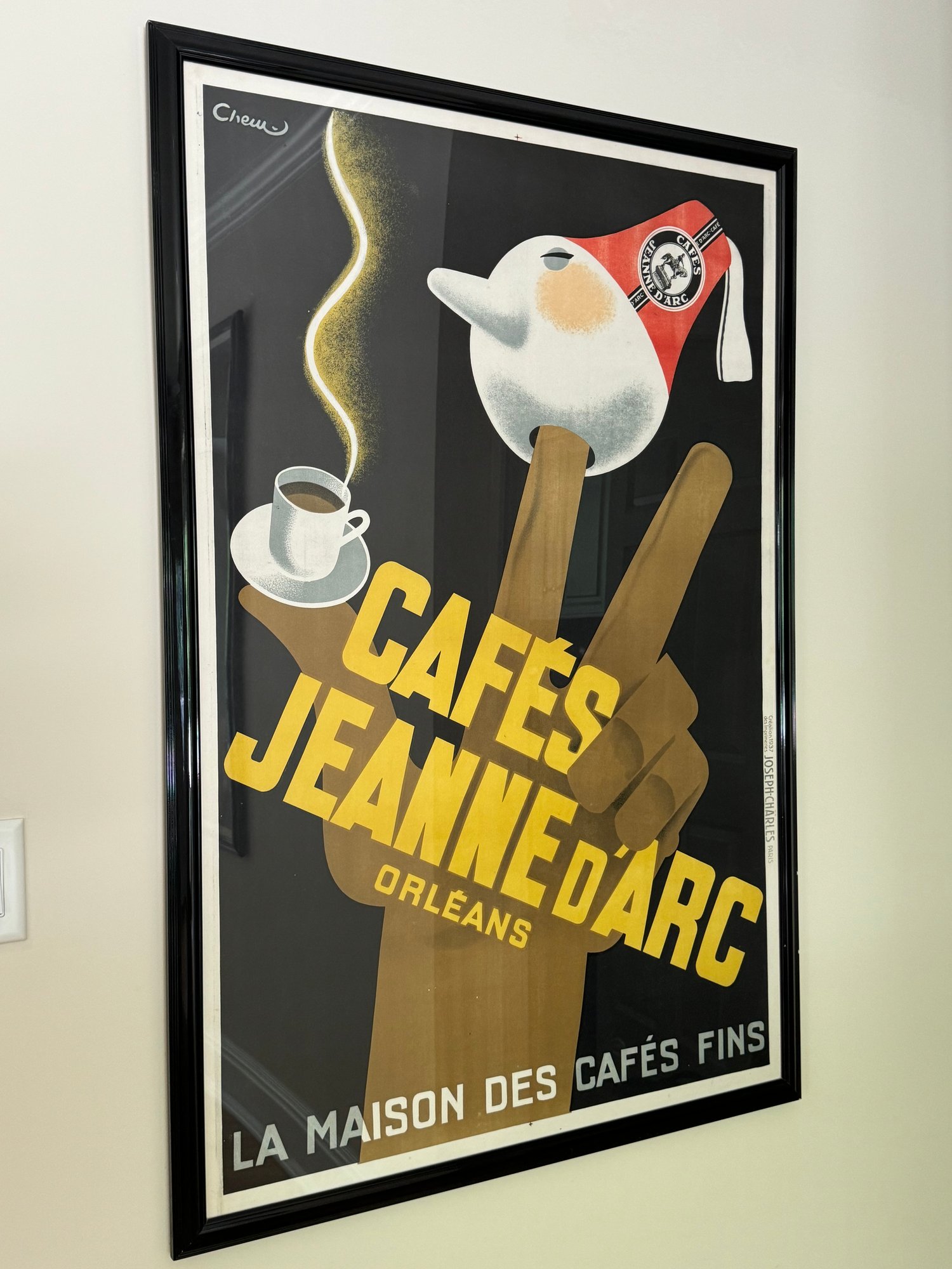 This Original French Art Deco image was created by the artist Chem to promote the Cafes Jeanne D'Arc a family coffee roastery that has been in business for over one hundred years in Orleans. Advertising poster created by the artist Chem in 1934 to promote the Cafés Jeanne d’Arc. Les Cafés Jeanne d’Arc is a roaster founded in 1899 and located at 7 rue de la République in Orléans in the Loiret department and the Centre-Val de Loire region.