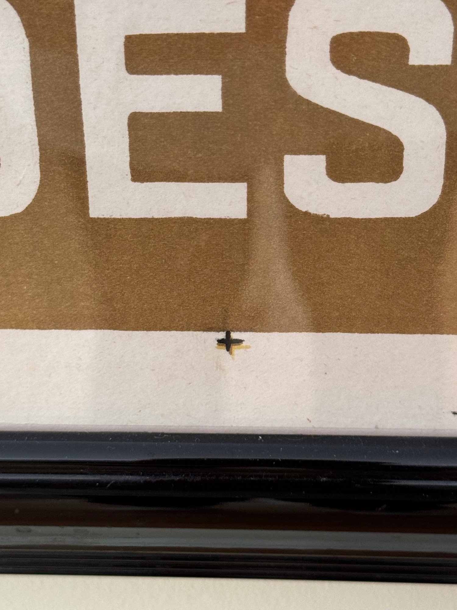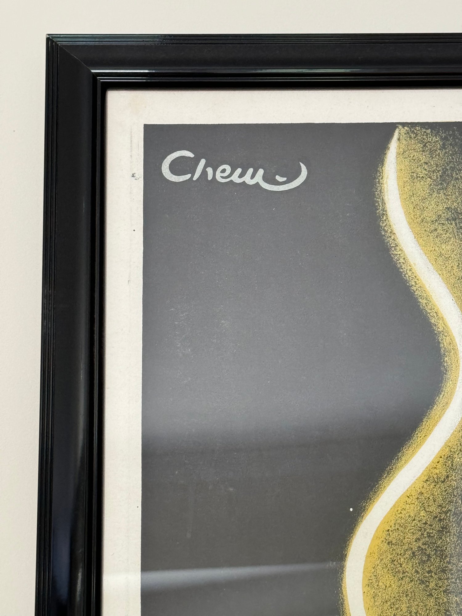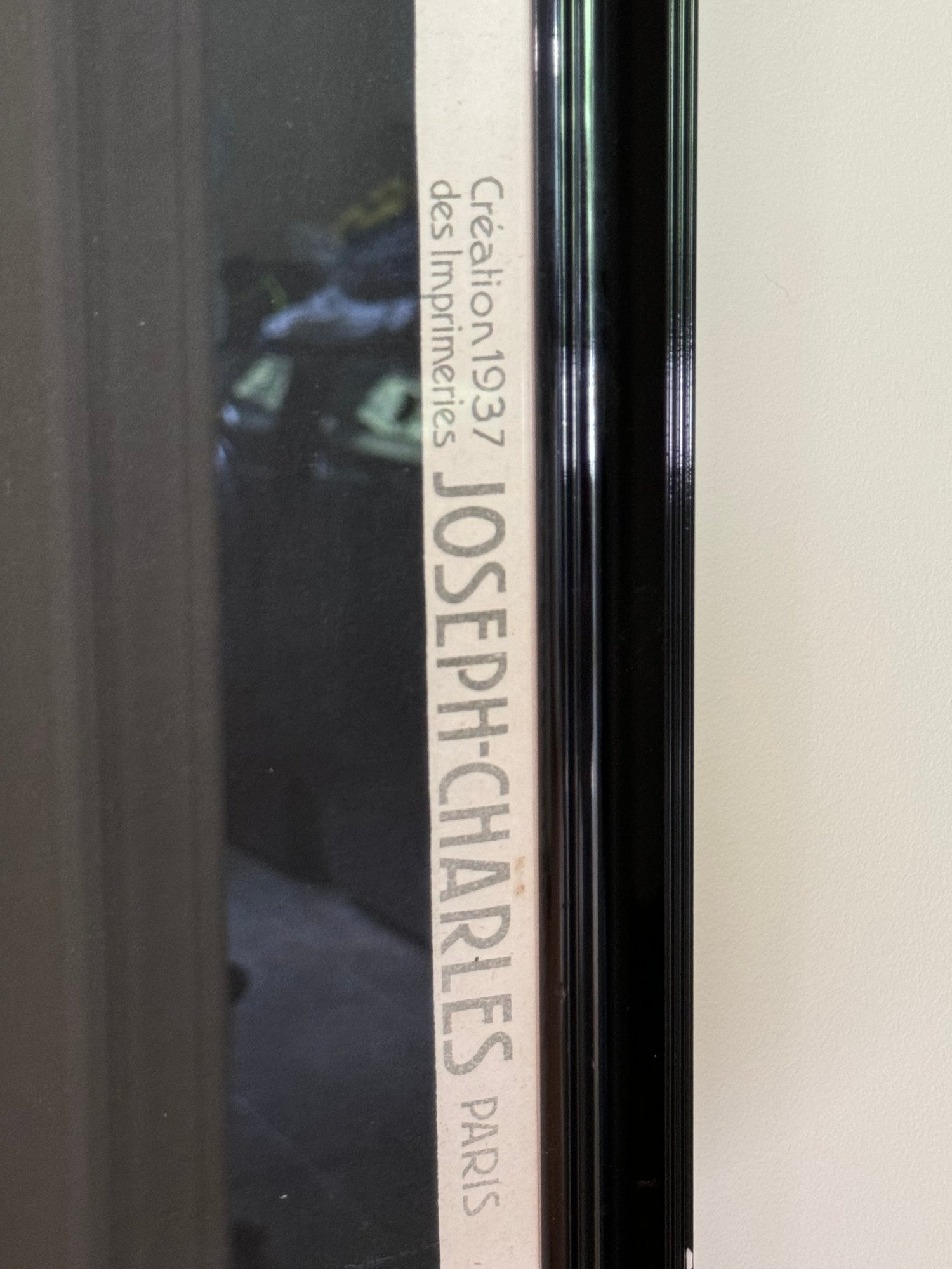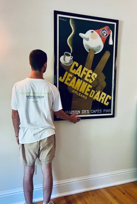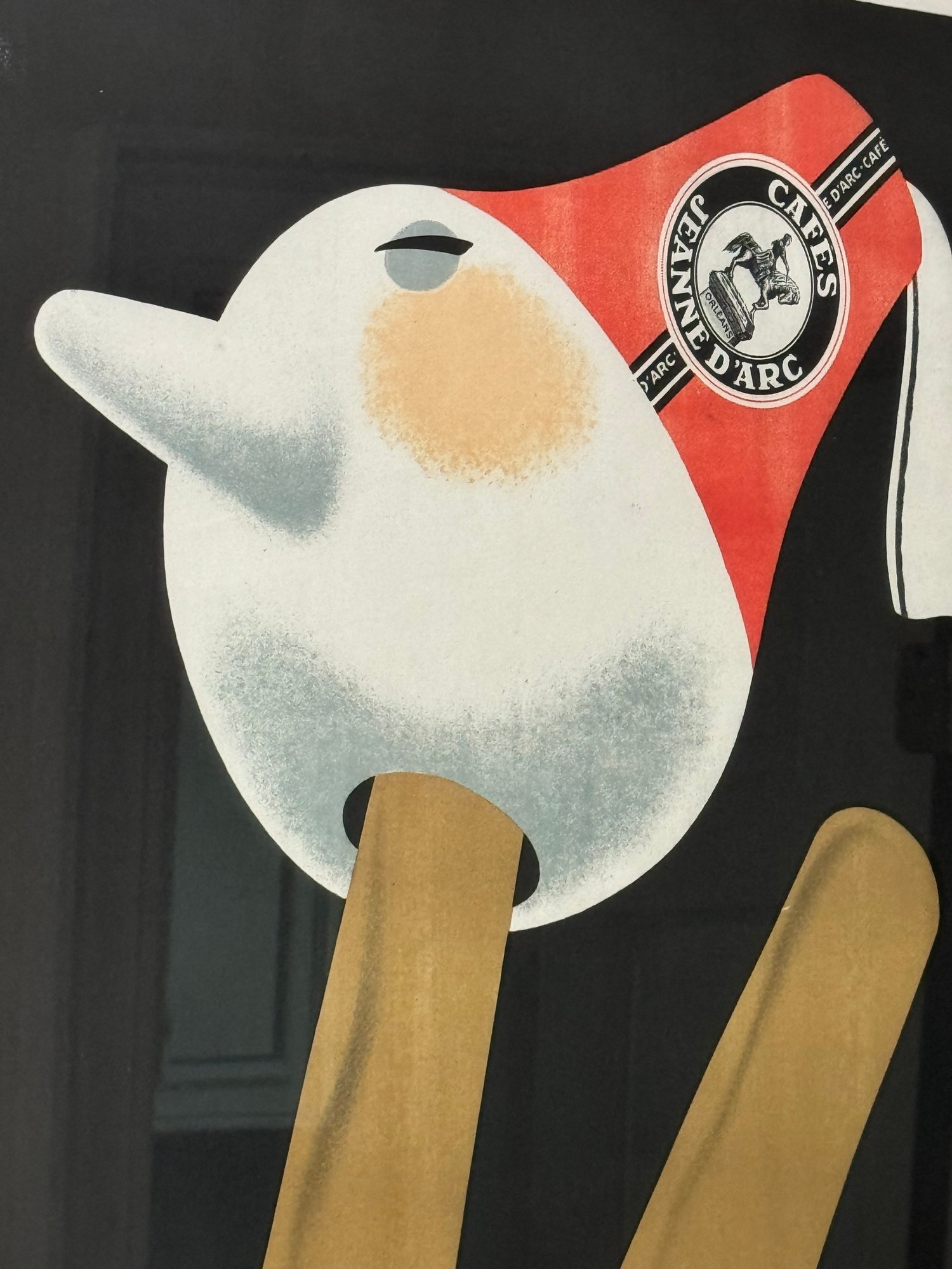 worked mainly in advertising (Air France from 1933). It is an exubertly designed poster depicting an outstretched hand holding a cup of coffee as well as a Fez hatted head with a long nose. Slightly surreal quality to the drawing as befits the period in which it was distributed. It is Linen backed and custom framed in a black lacquer hi gloss to accentuate colors. It is in very good condition and has been well