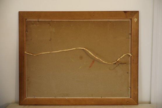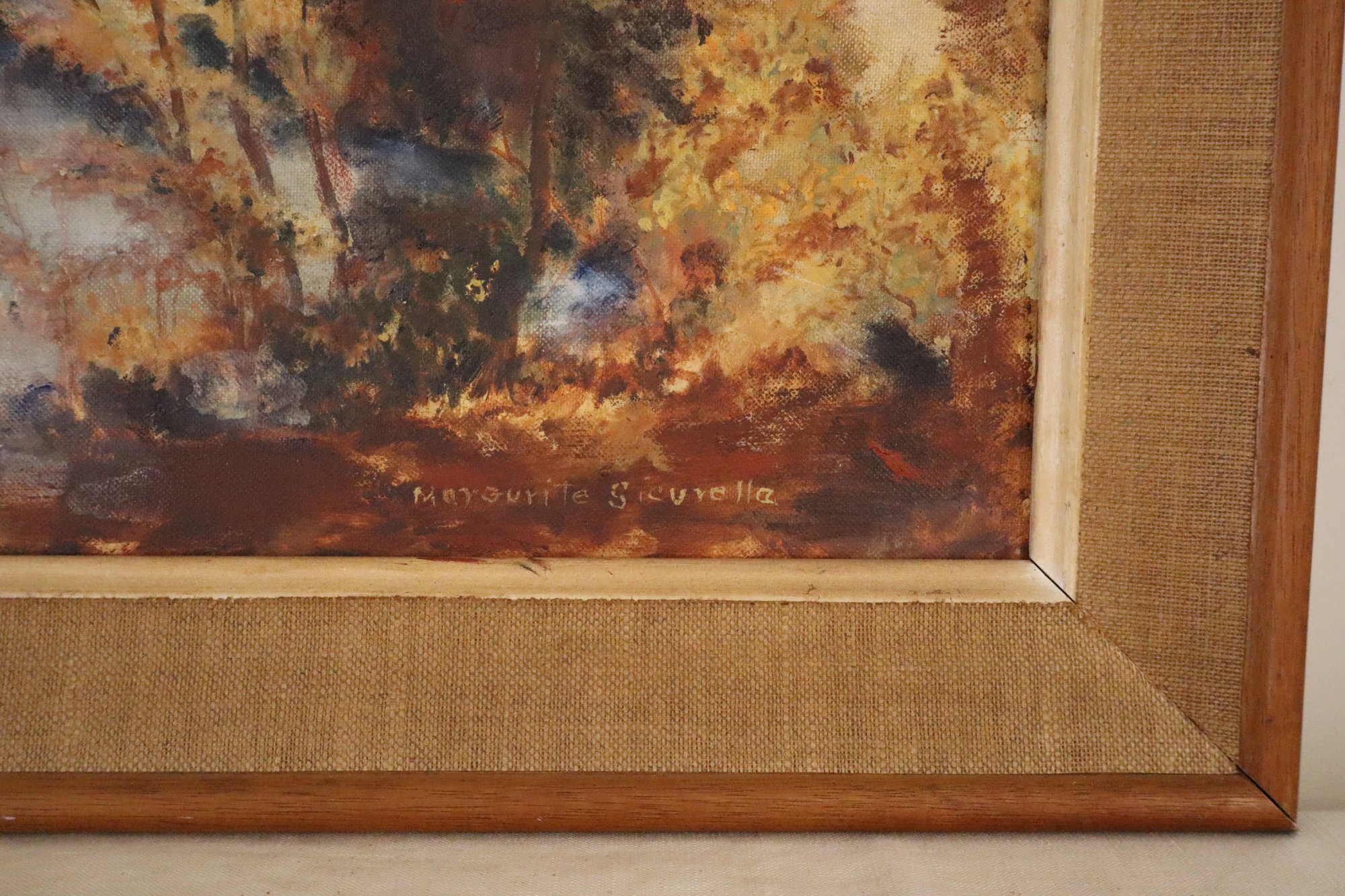 Custom wood frame has burlap mat