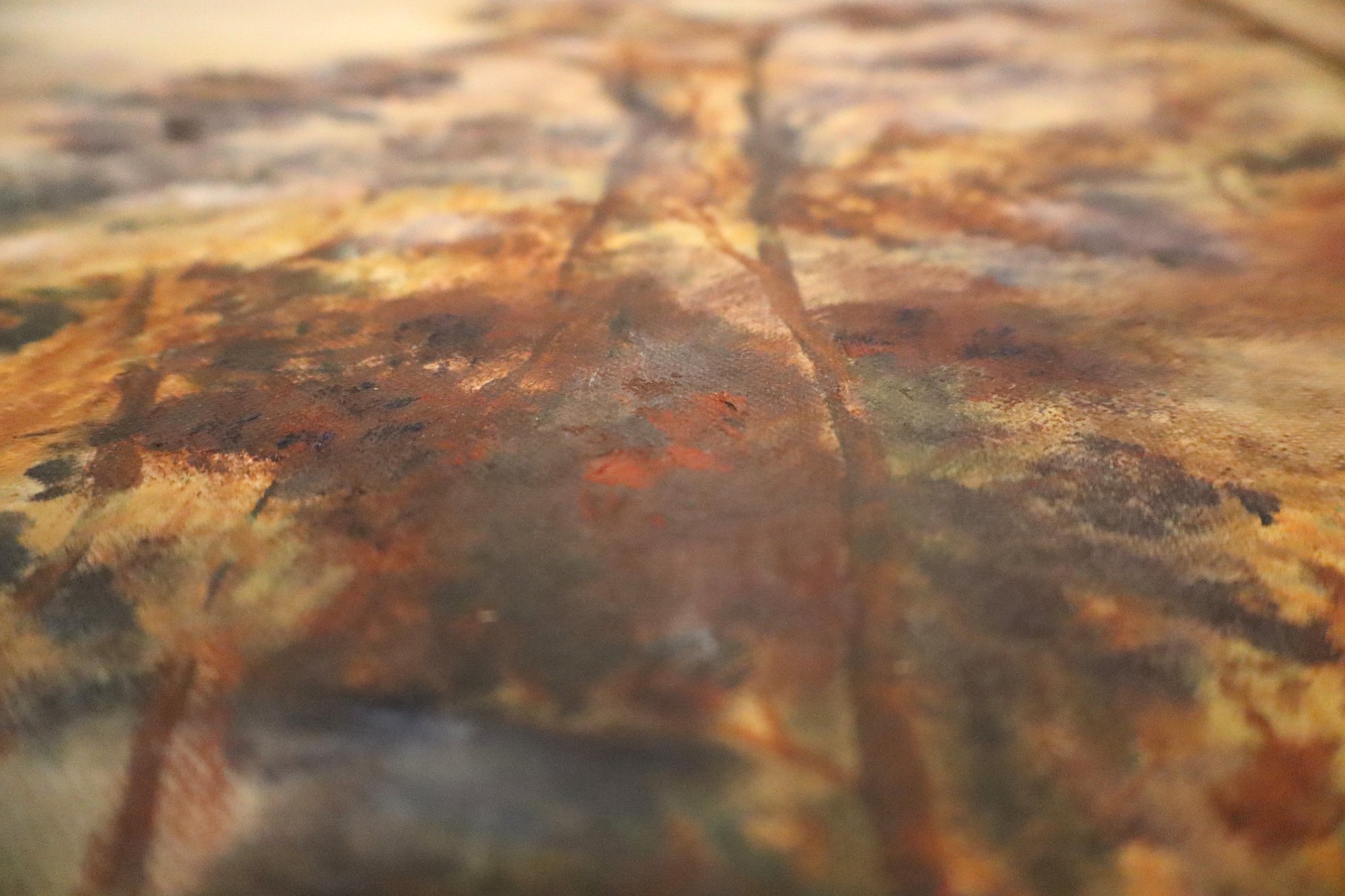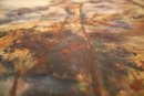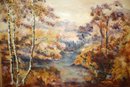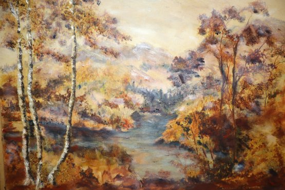 Depicts a serene woodsy landscape using rich, warm colors like burnt orange, blues & browns