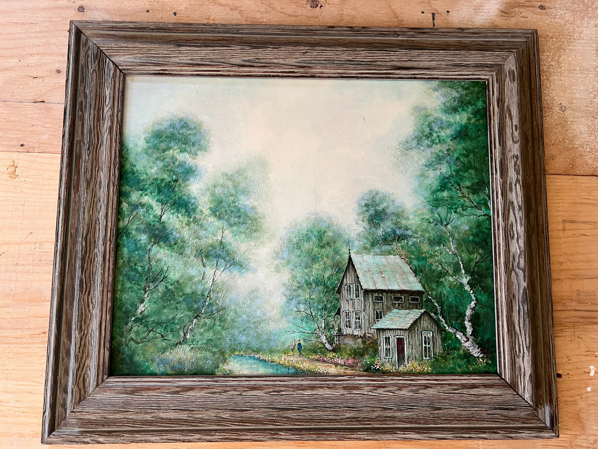Original framed landscape painting depicting a rustic cabin nestled among green leafy trees.