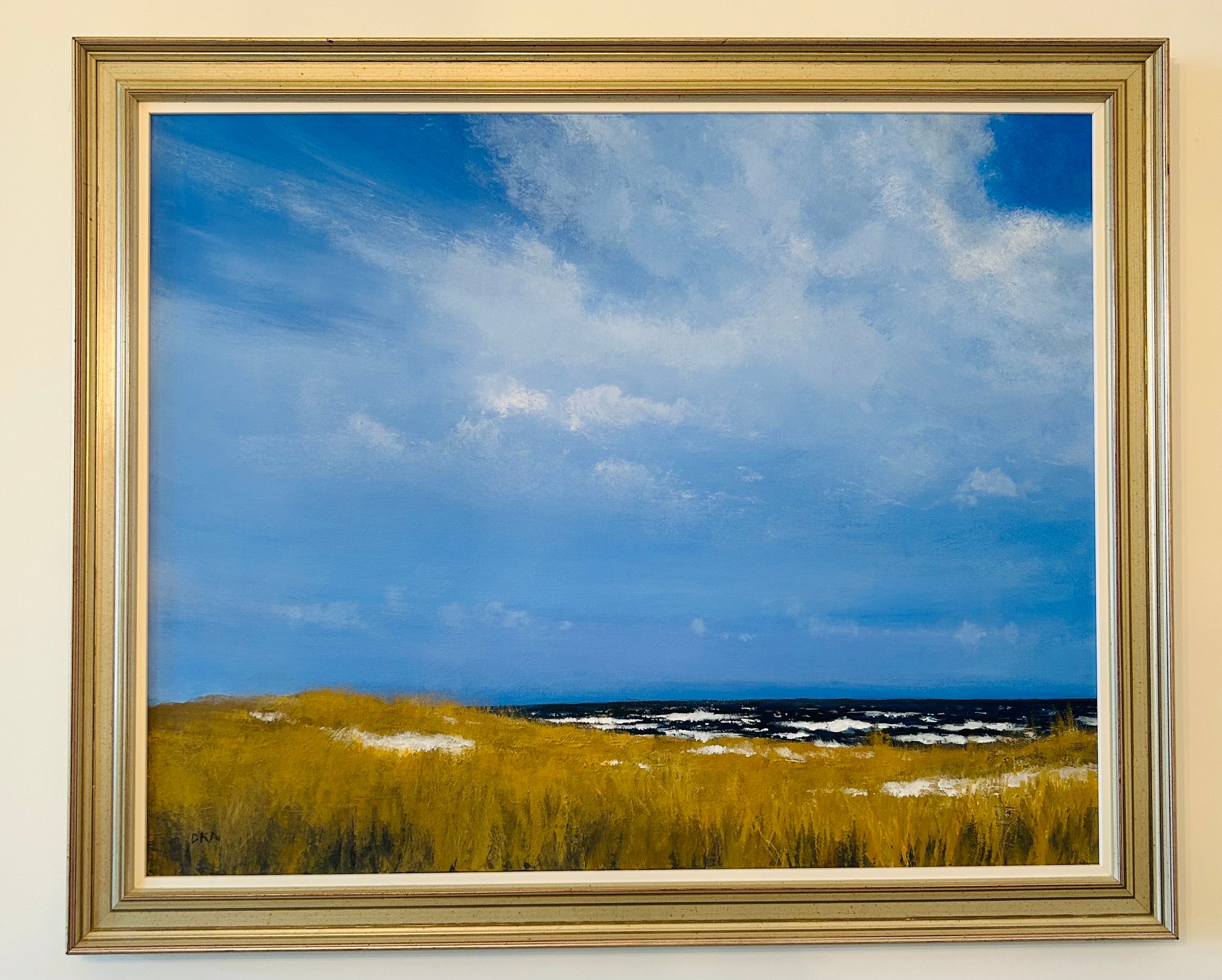 Beach scene with blue sky painted by Rhode Island artist David K. Anderson. Anderson's works can be found at many local galleries and shows.