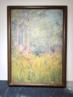 Captivating impressionist style small landscape painting on canvas depicting a summer landscape blooming in pastel tones with some more vibrant greens and yellows.