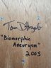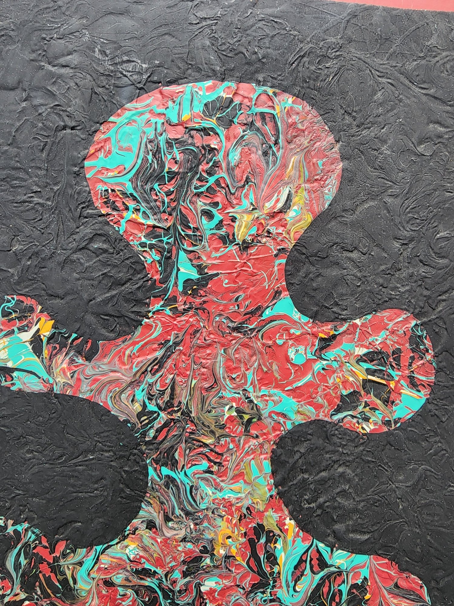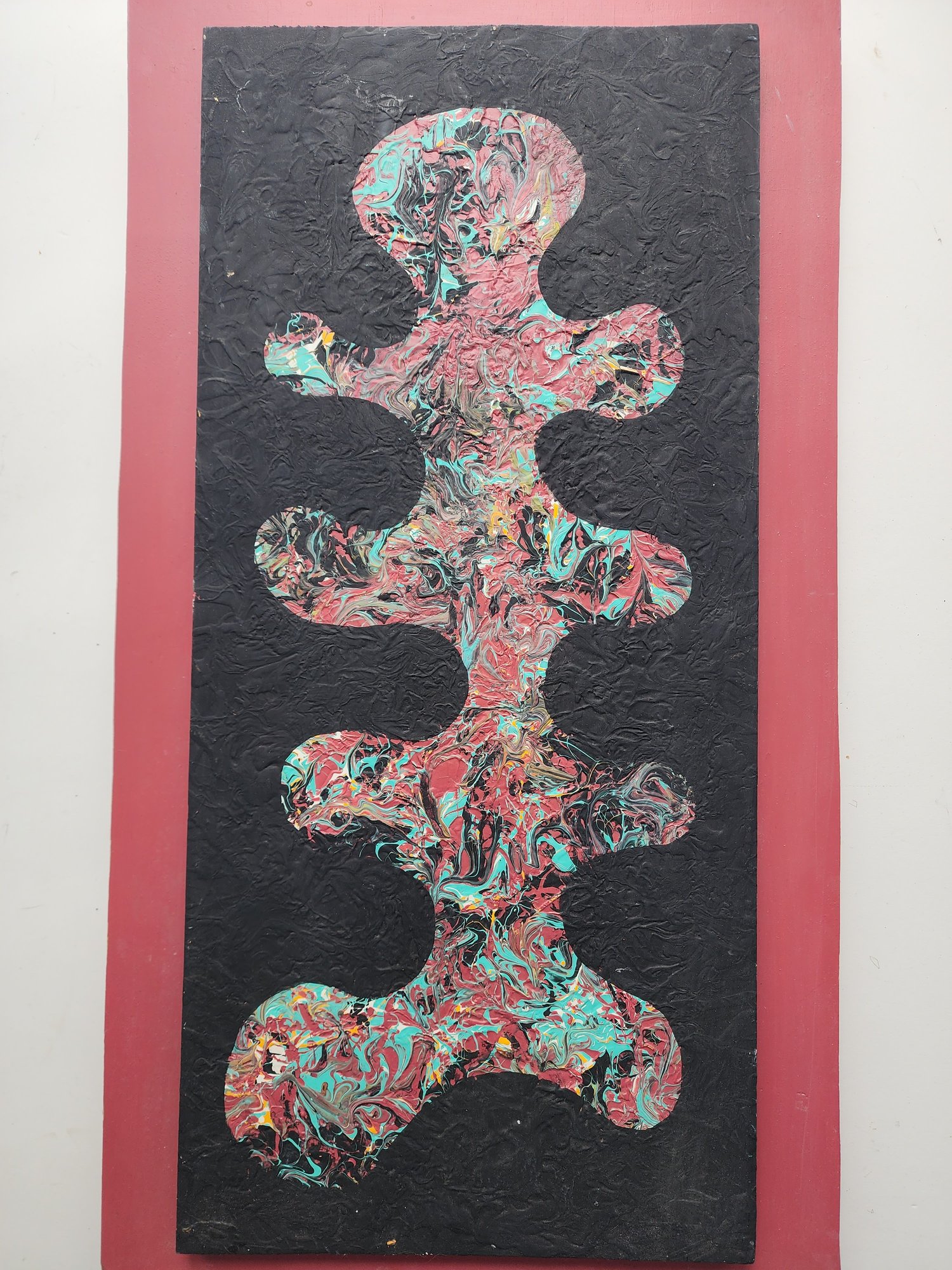 Painting on wood board, mounted on red painted panel, 3-d impact