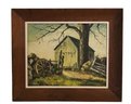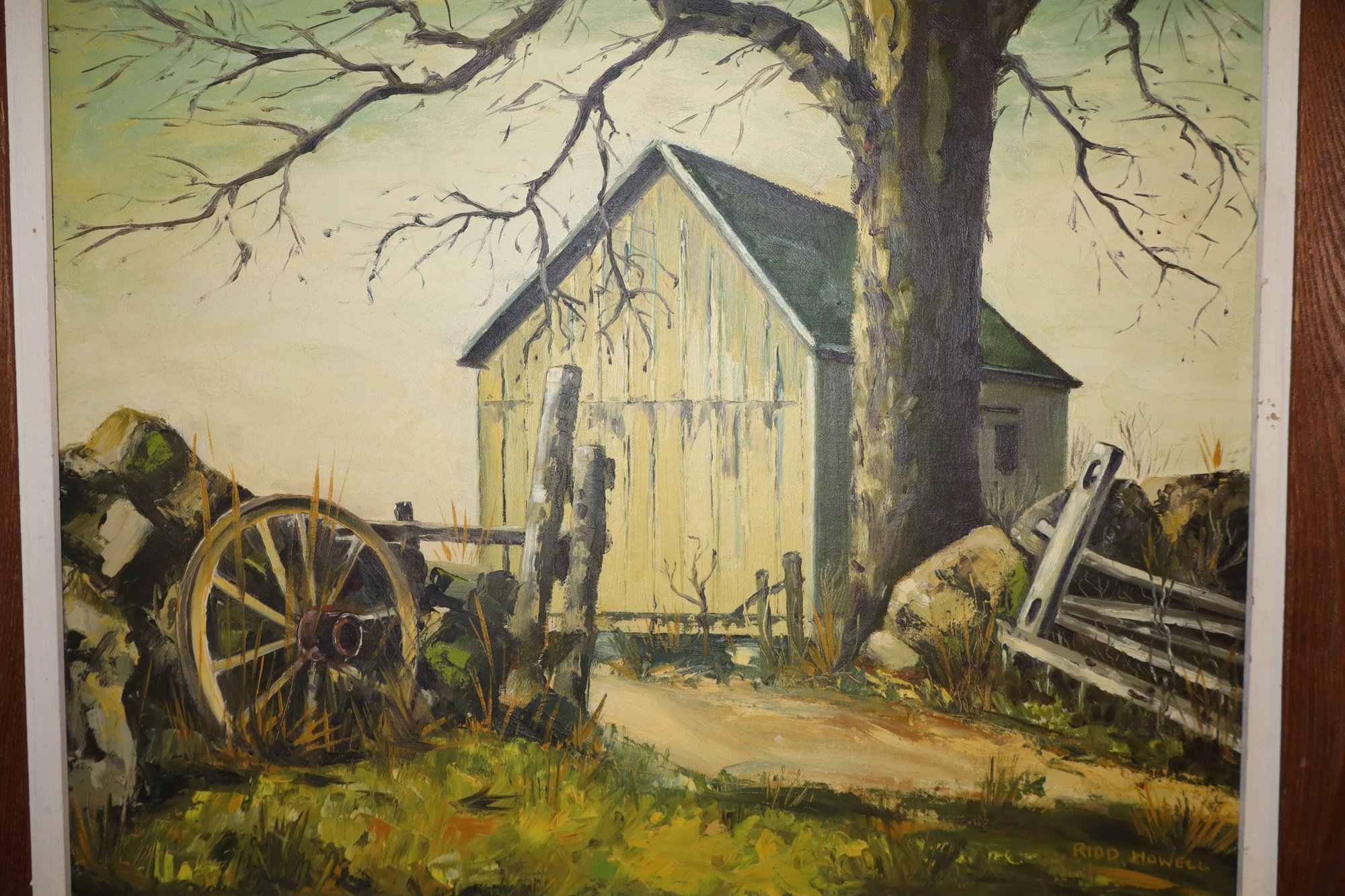 Depicts a rustic barn scene featuring a large bare tree in the background & wooden wagon wheel in the foreground