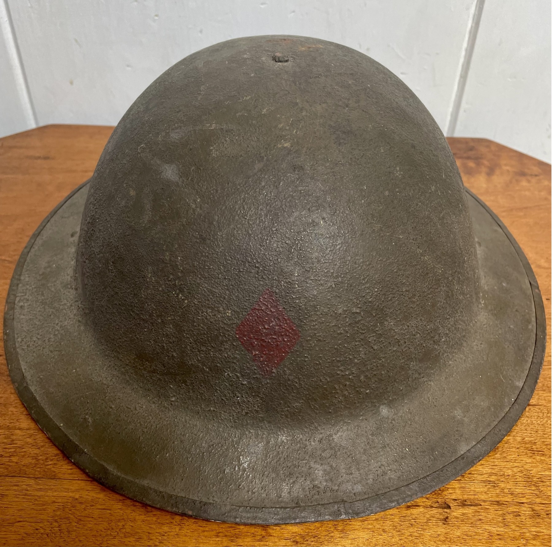 The Red Diamond on this helmet identifies it as the Red Diamond division of the 5th Infantry and makes it much more desirable. The helmet is over 100 years old and is in good condition and shows age and wear in an appropriate and desirable way. It doesn't have the chin strap but the inner cloth lining is there and the two rings that held the chin strap are there. The helmet measures 12 1/4" by 11 1/4" with a height of 5".