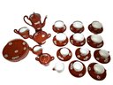 Wonderful antique Noritake Nippon red orange coffee and/or tea set with a daisy design, includes a coffee pot, two sugar bowls and two creamers (one set larger and one set smaller), six dessert plates, six teacups and saucers, and six demitasse espresso mugs and five saucers.