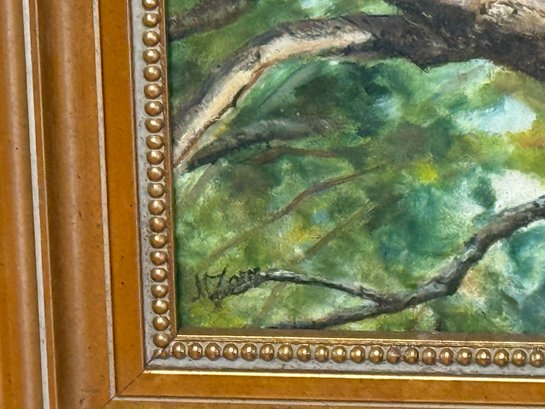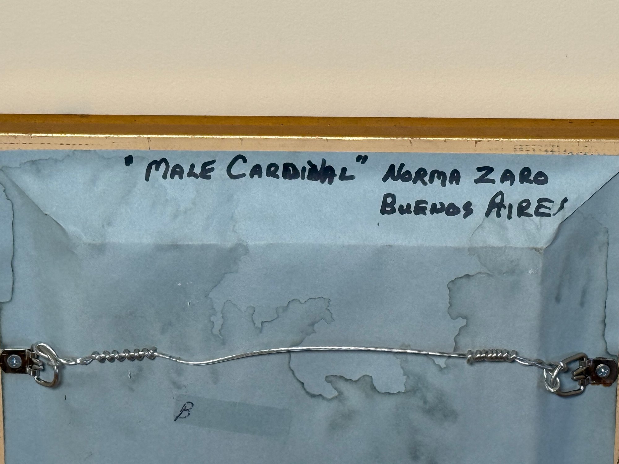 This beautiful painting by Norma Zaro features a lovely cardinal. Signed lower left hand corner by artist. Pretty gold painted frame.