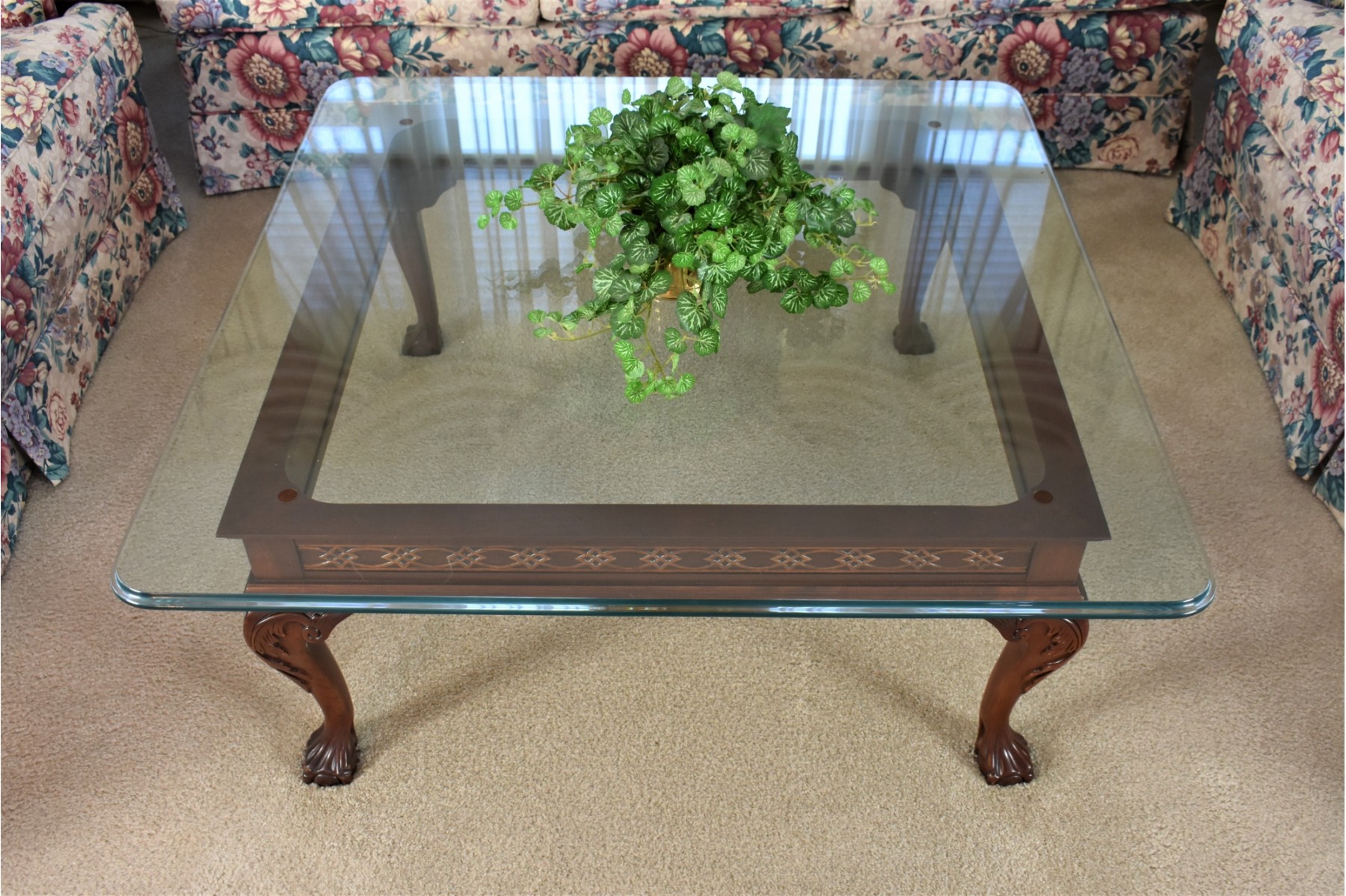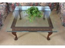 This Glass top coffee table has beveled edges and decorative carved legs featuring ball and claw feet. Table is a high quality piece and is heavy. Beautiful condition, free from any major scratches or dings.