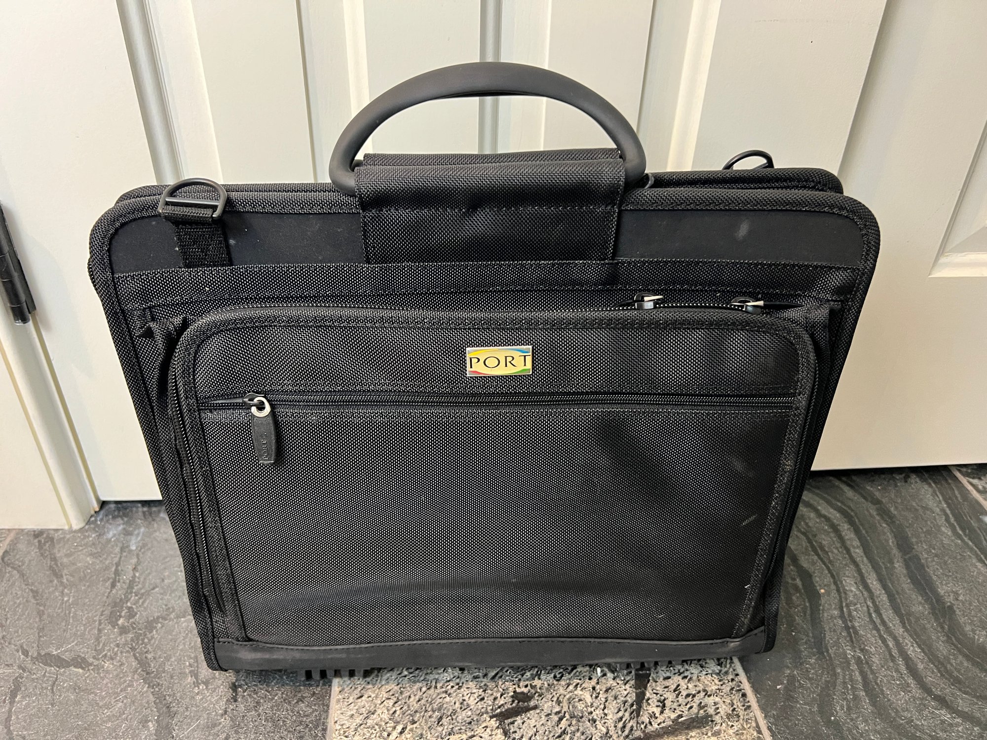 Black fabric briefcase or laptop carry bag with multiple storage compartments.